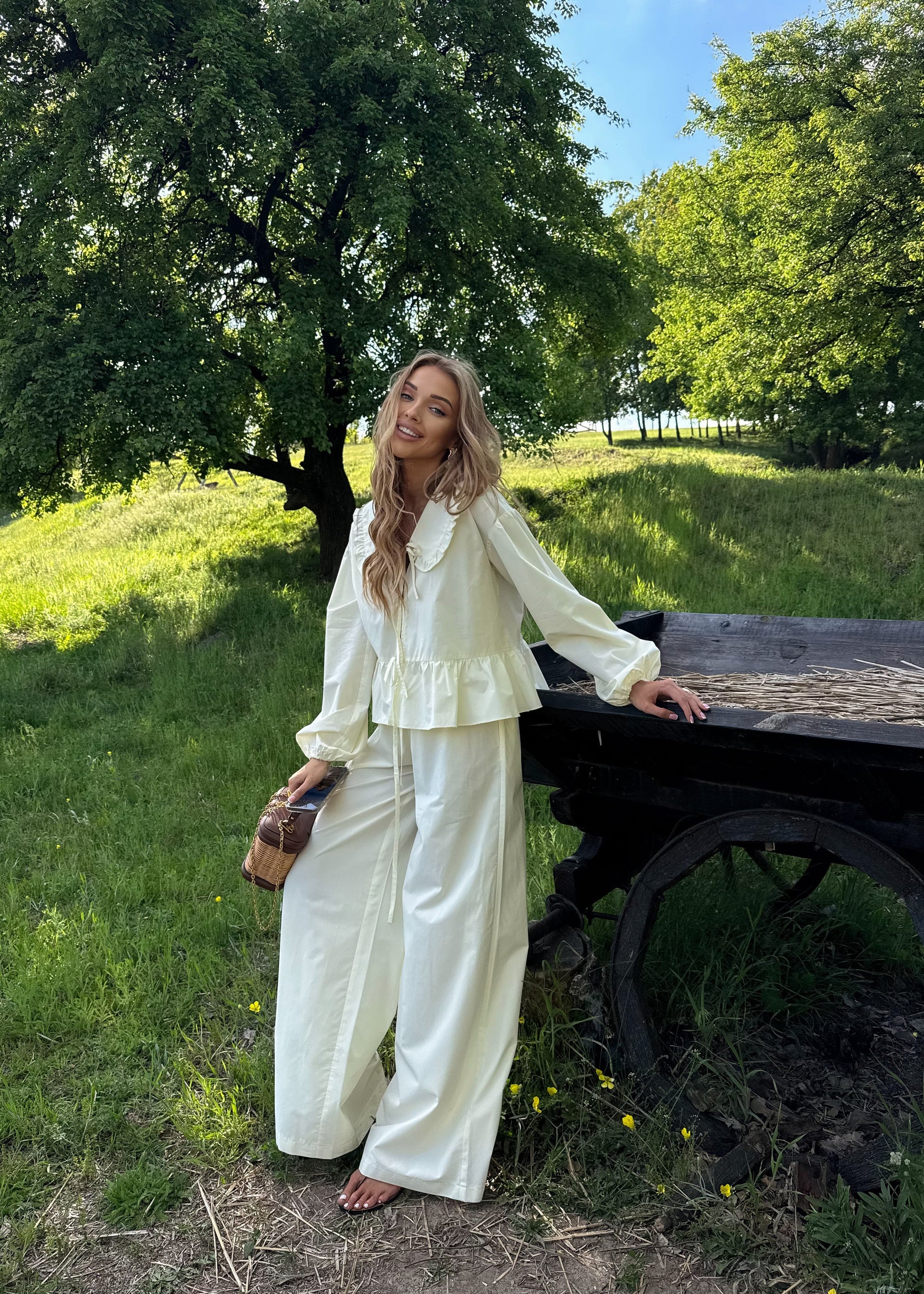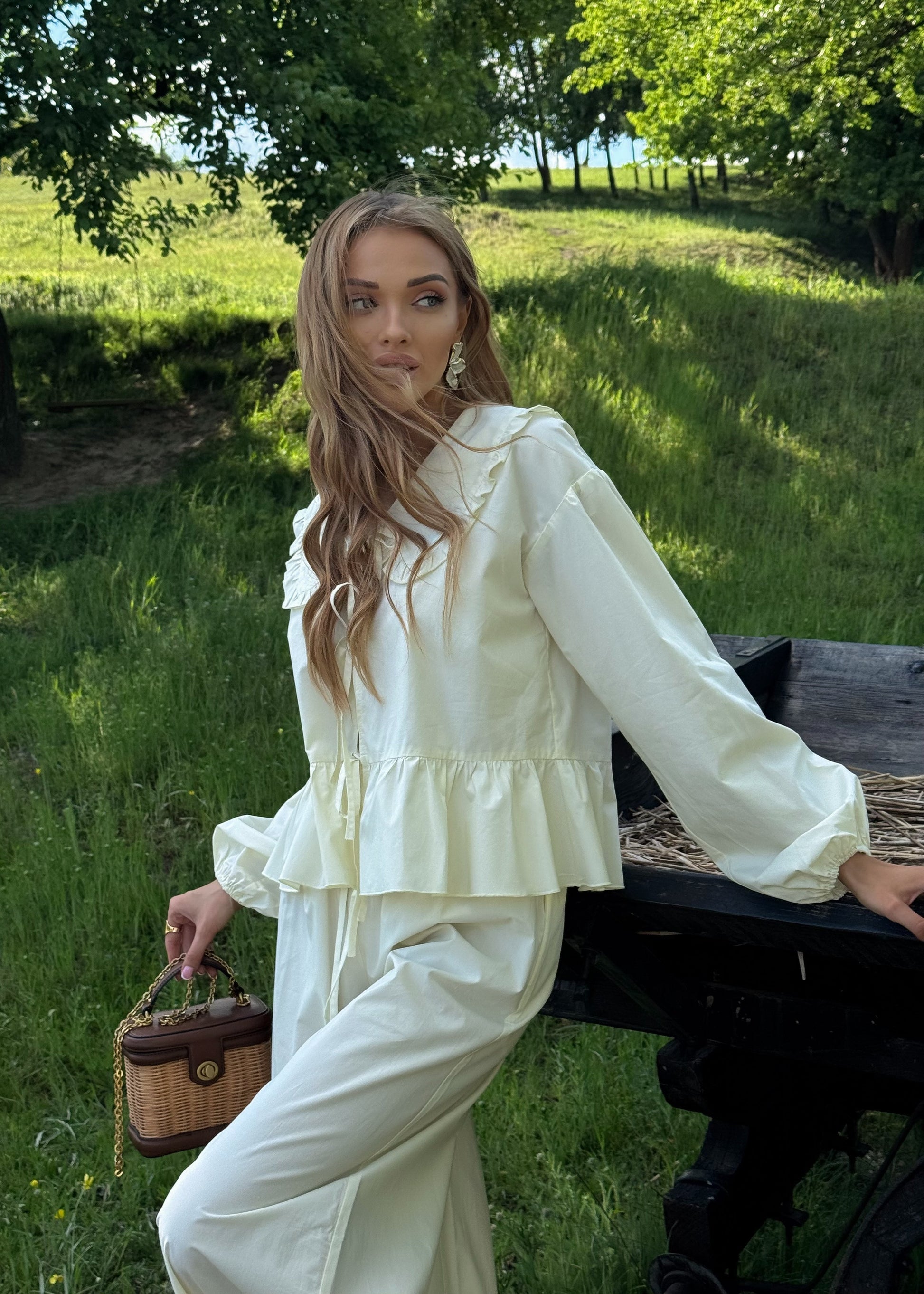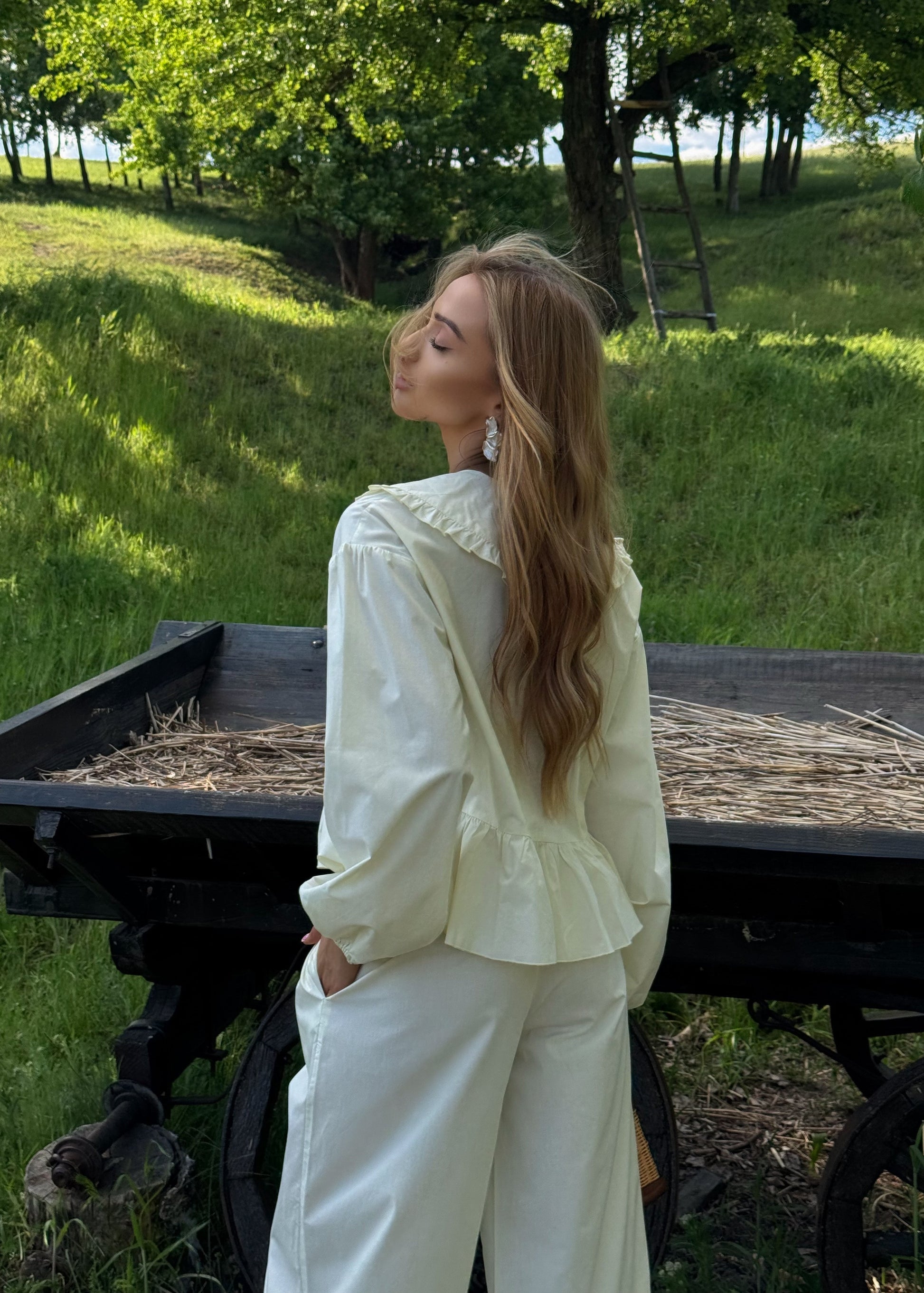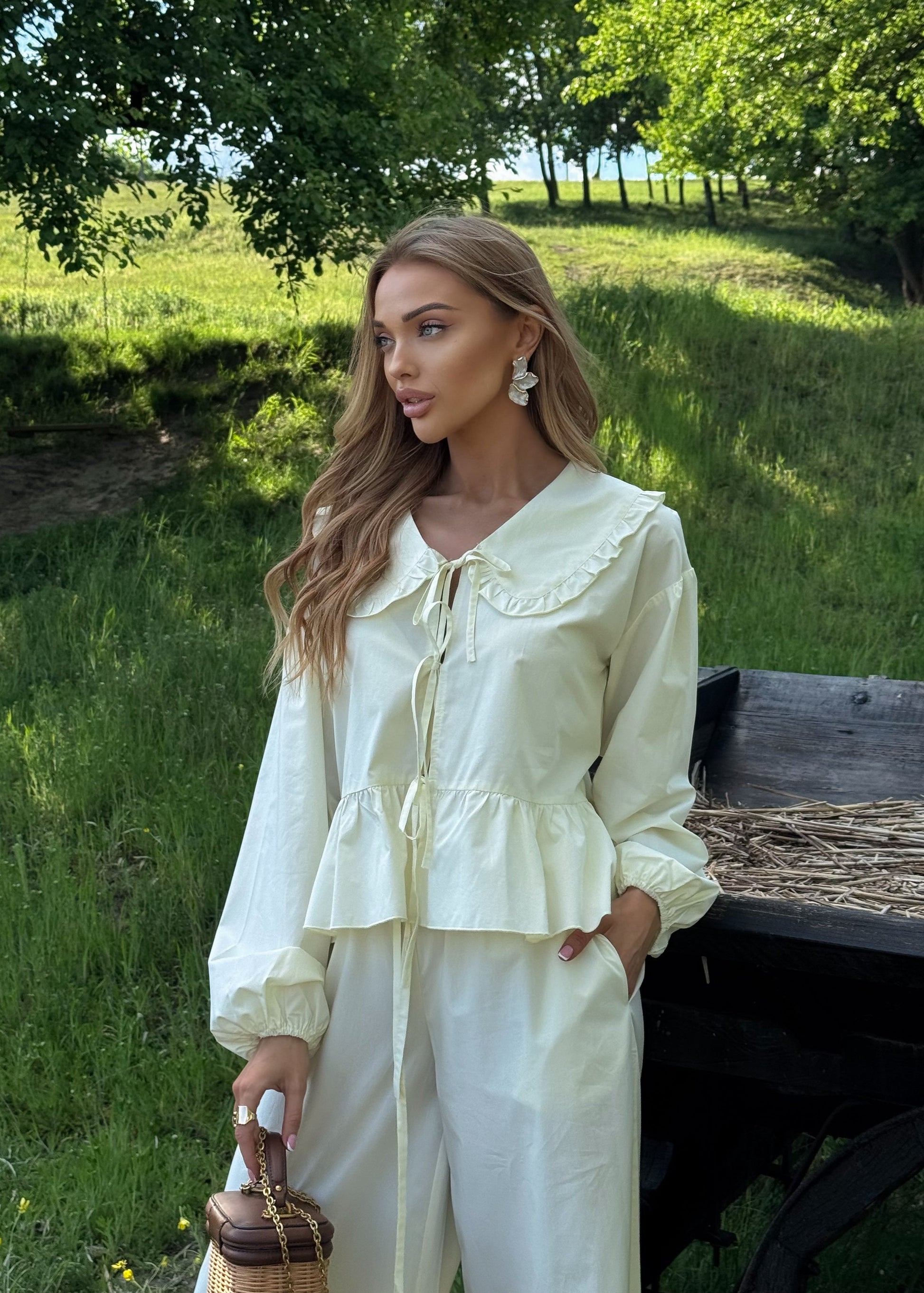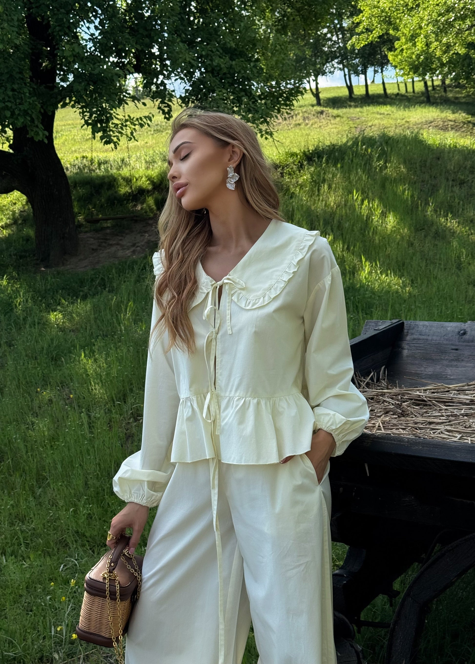 Витончений костюм із 100% бавовни — поєднання сорочки з акцентним коміром і вільних штанів.
