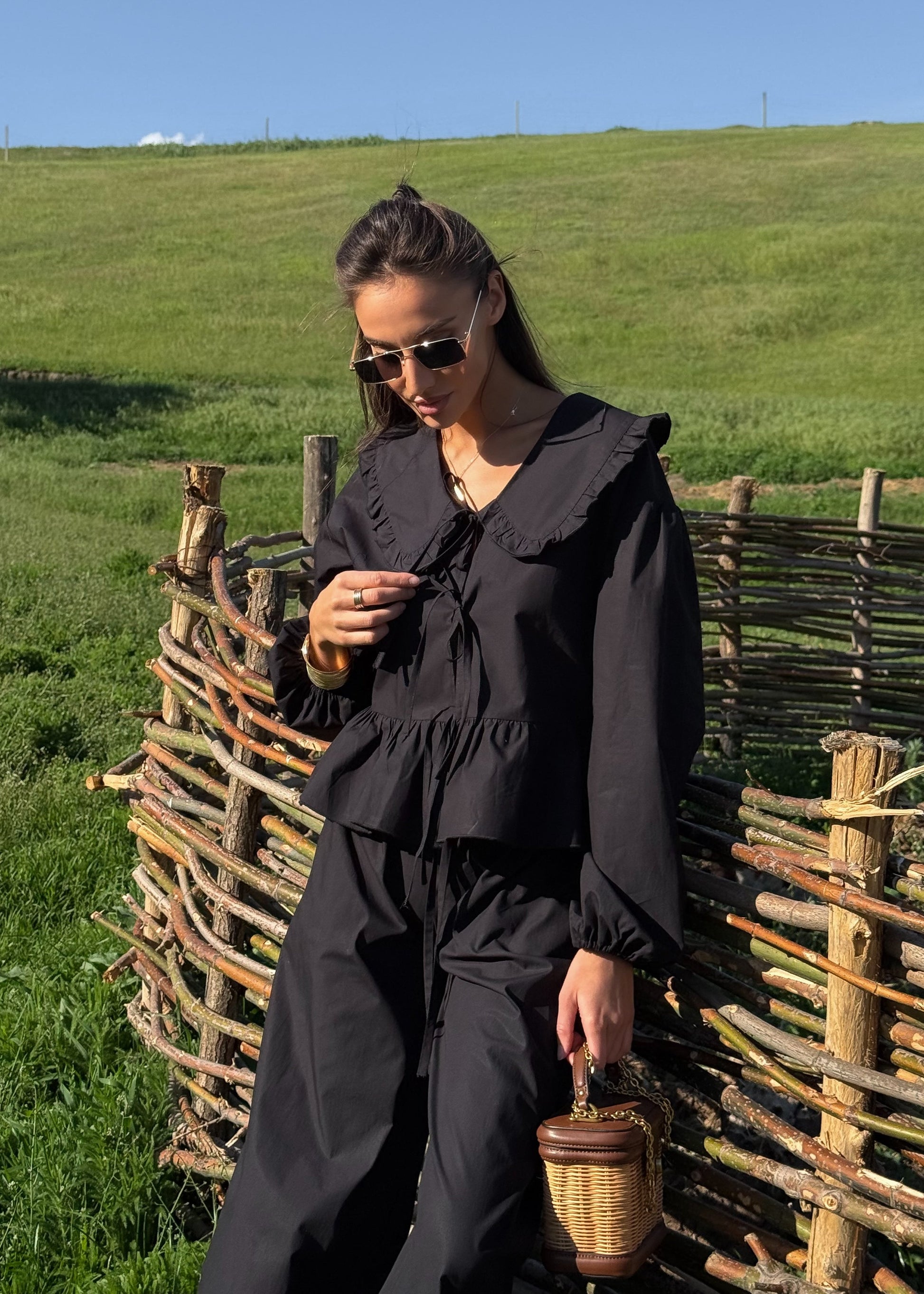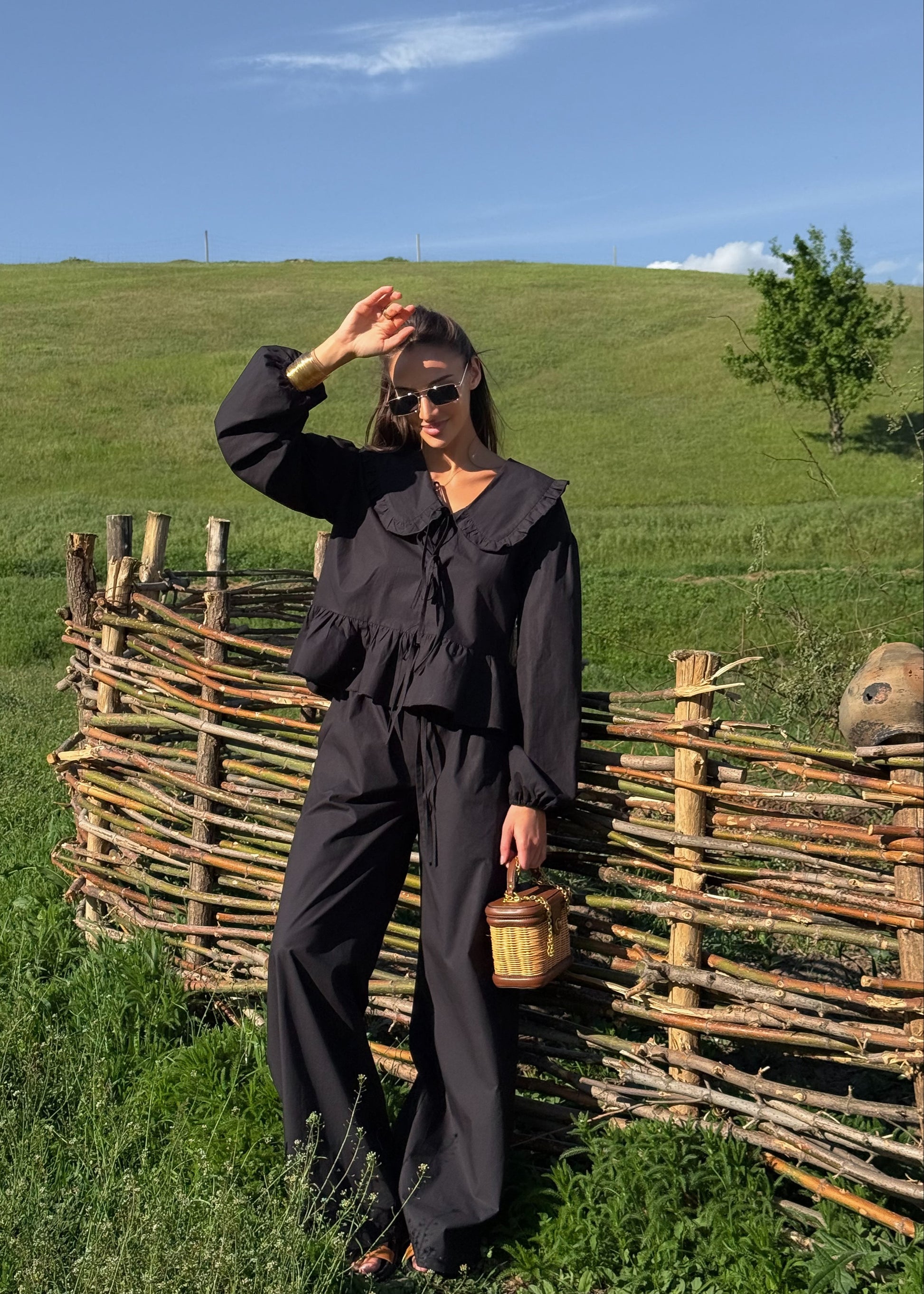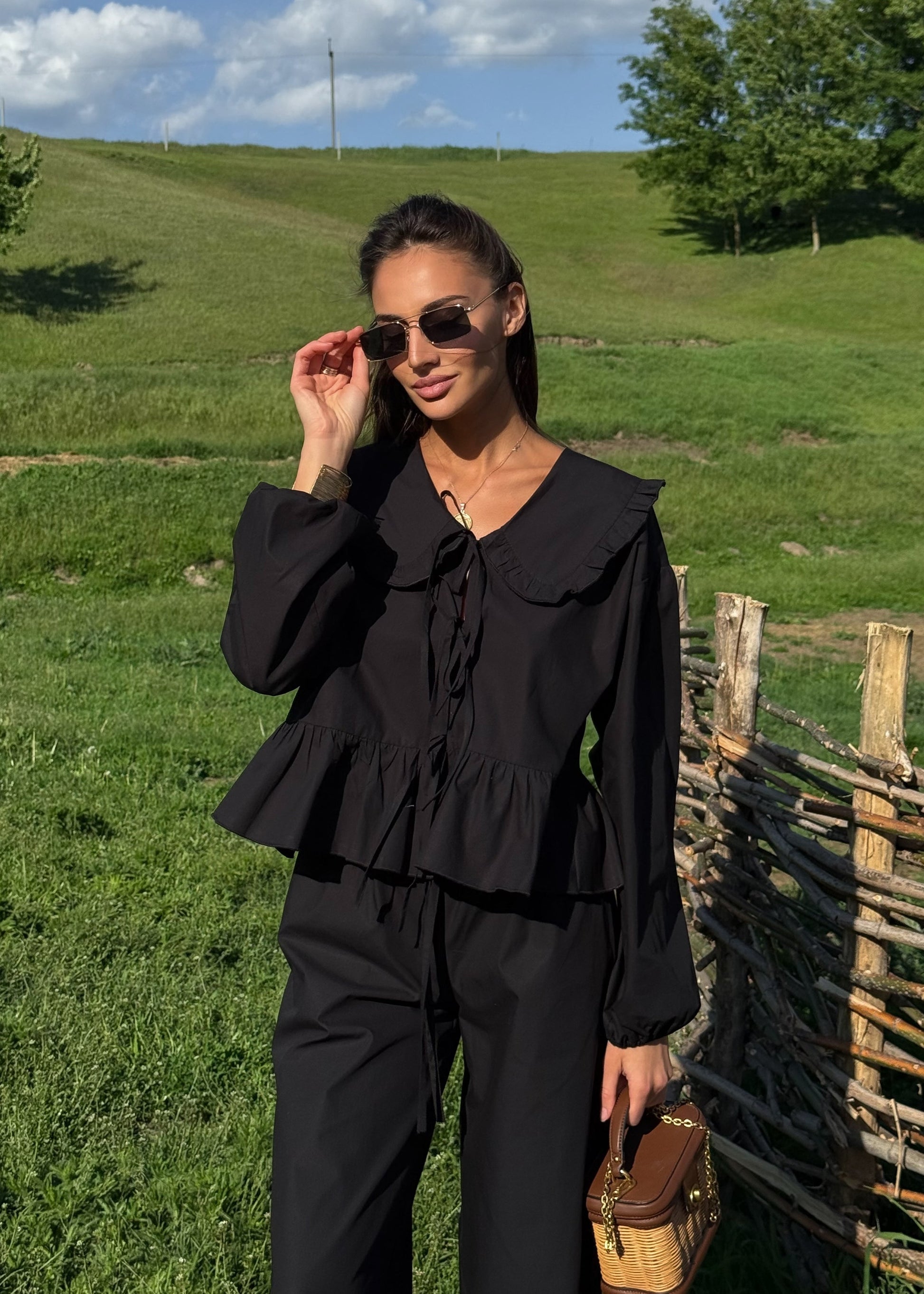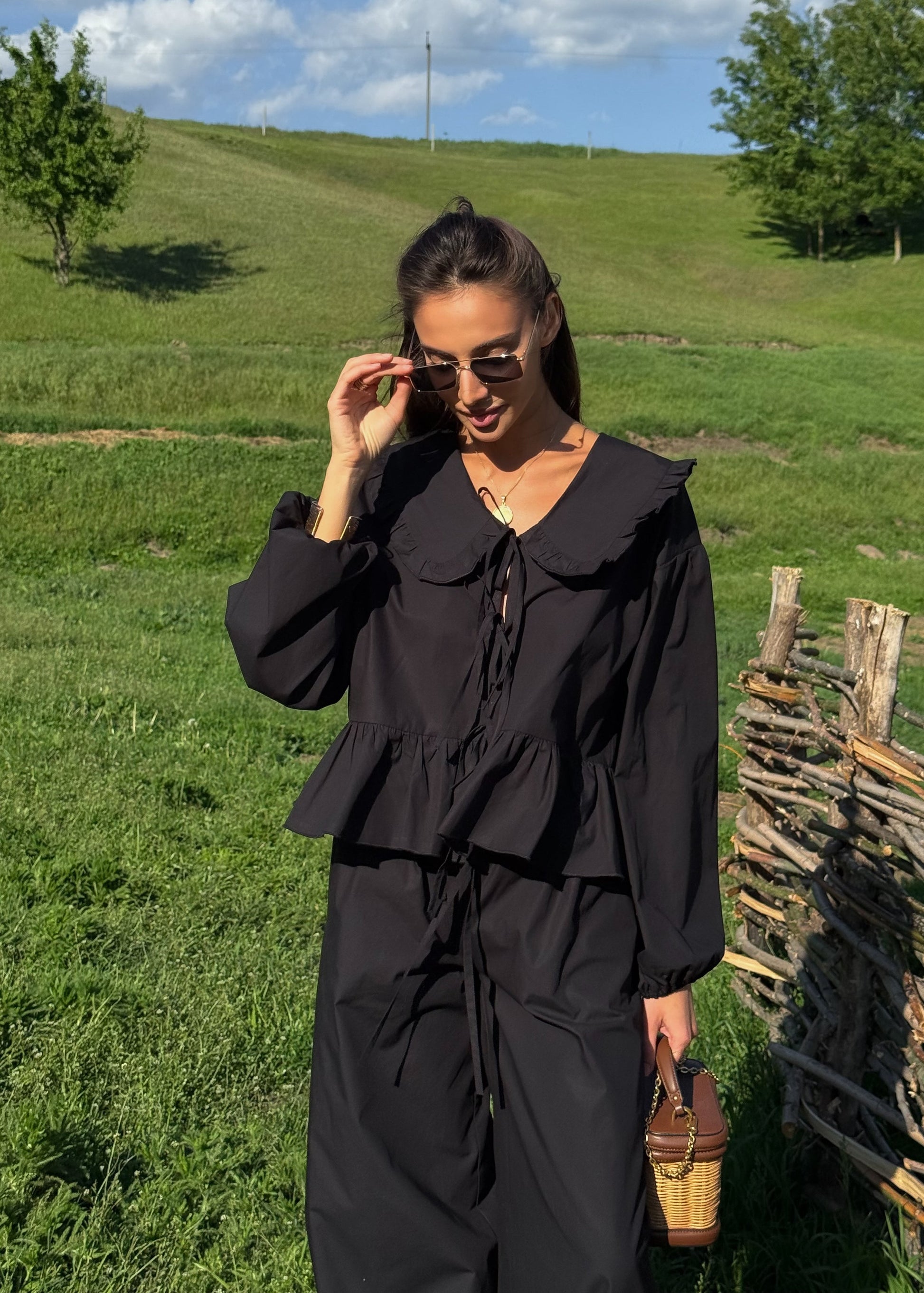 Витончений костюм із 100% бавовни — поєднання сорочки з акцентним коміром і вільних штанів.