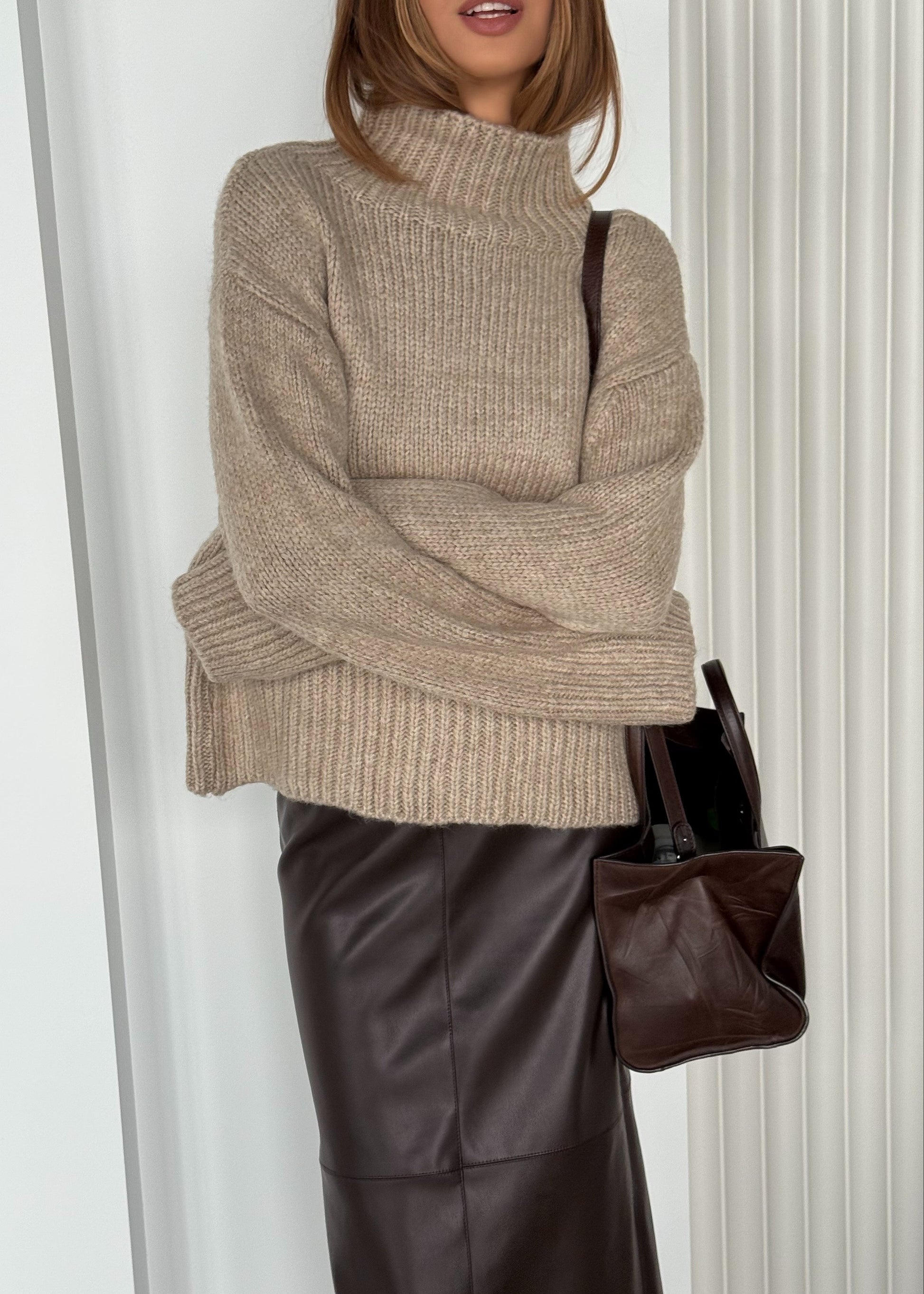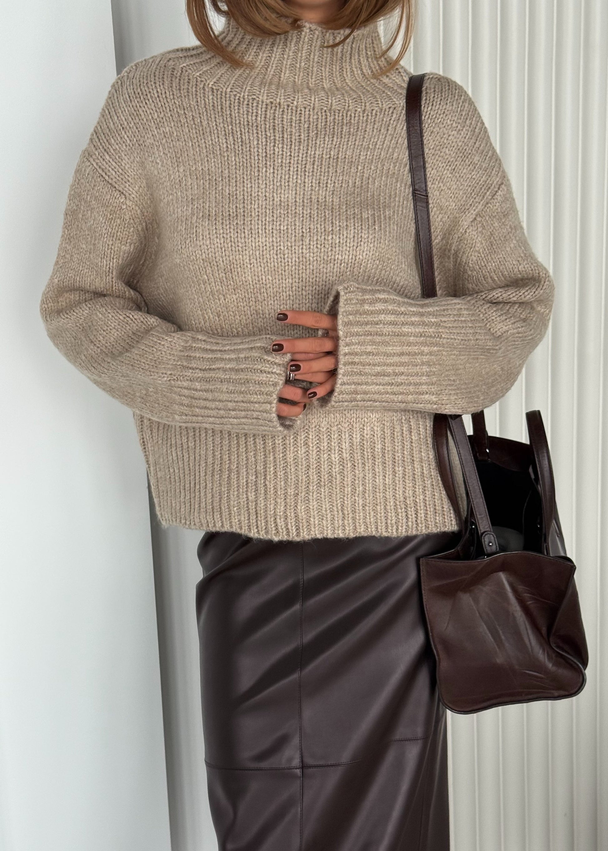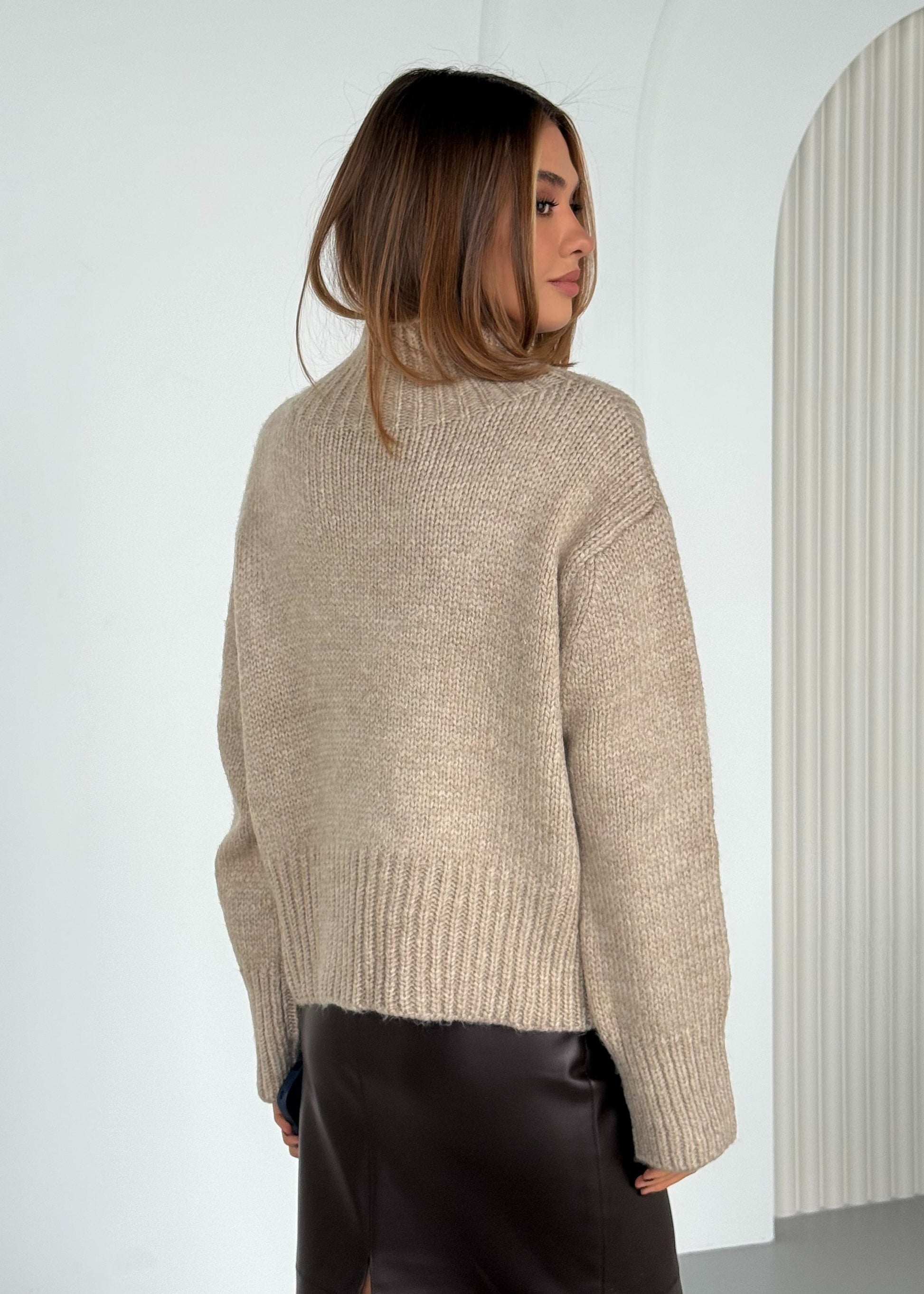 Светр виконаний із м’якої пряжі з вираженою фактурною в’язкою, що забезпечує комфорт і приємні тактильні відчуття. Модель має прямий силует і високий комір, який додає образу акуратності та захищає від прохолоди. Подовжені рукави та щільні манжети створюють збалансований, лаконічний вигляд.