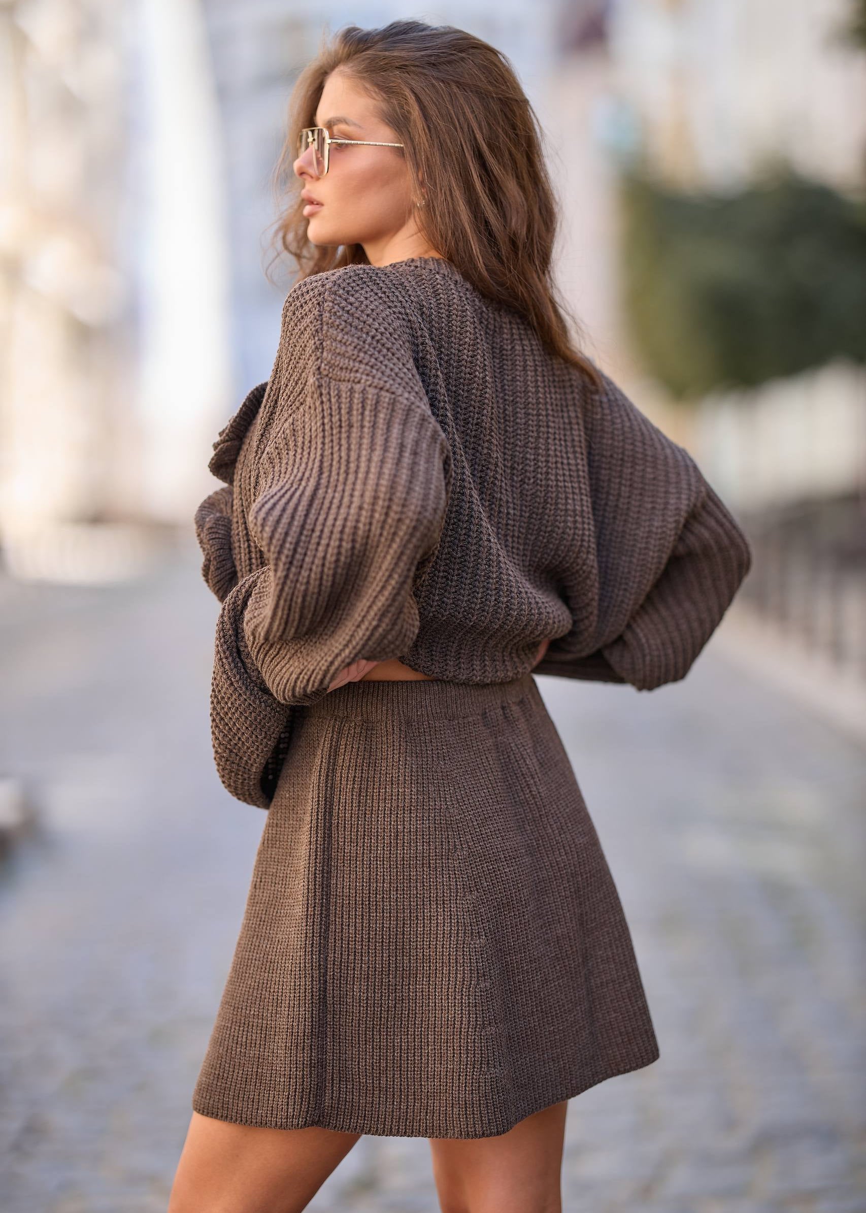 М’який в’язаний костюм створює бездоганну посадку та відчуття затишку. Светр вільного крою з акцентними квітами і довгими рукавами гармонійно поєднується зі спідницею, що підкреслює лінію талії та додає образу стриманої жіночності.
