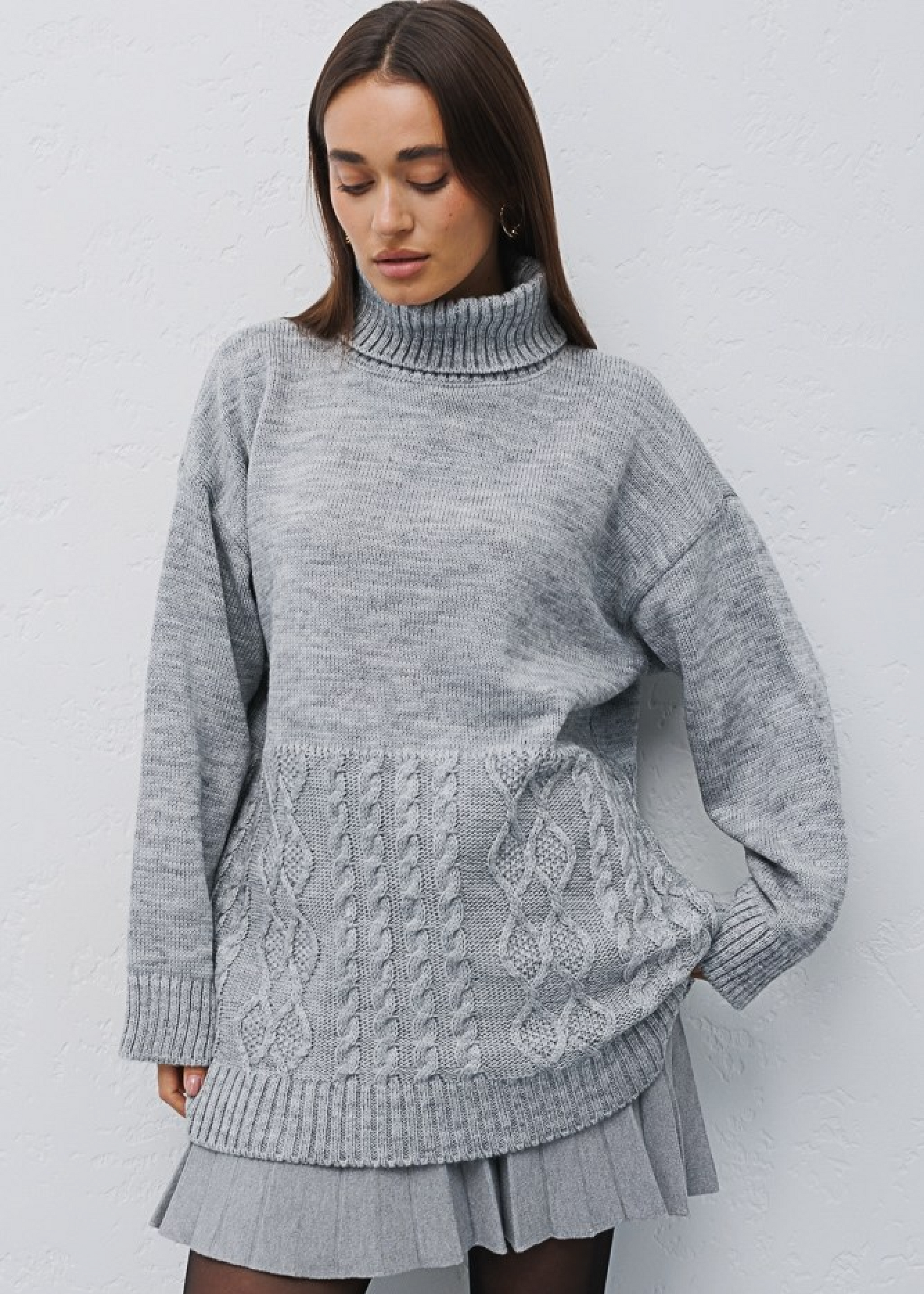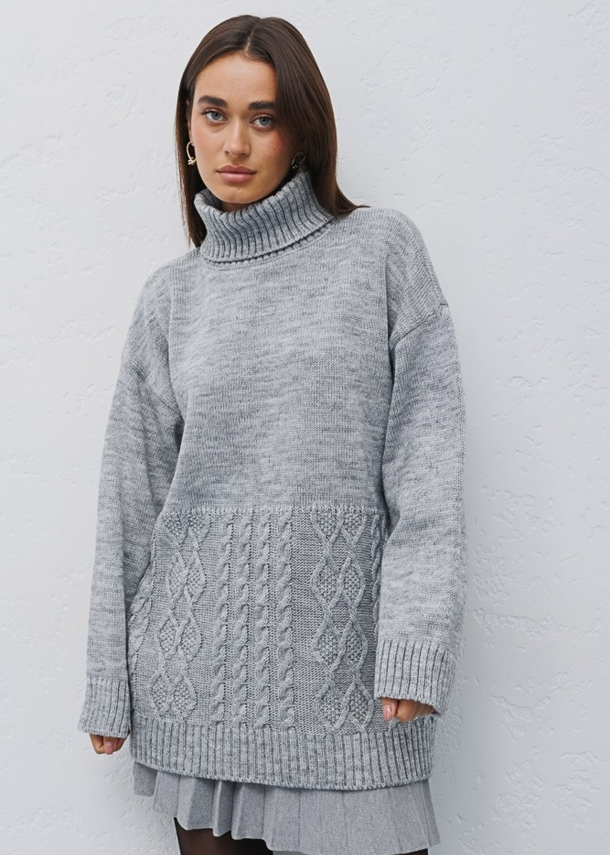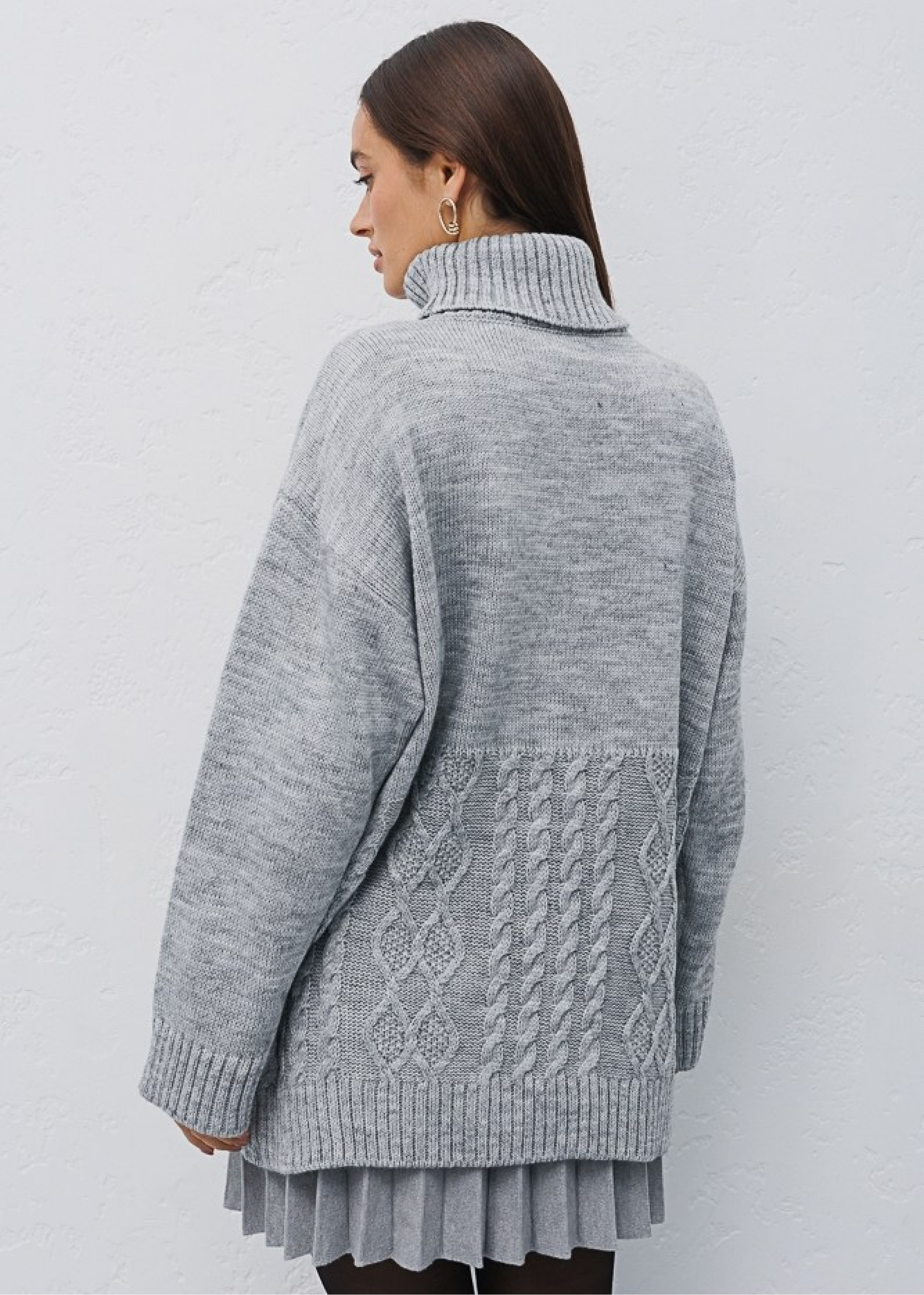 Затишний oversize светр з м’якої пряжі у світло-сірому відтінку. Модель має об’ємний комір-стійку та декоративний візерунок із косами внизу виробу, що додає образу текстурності. Спущена лінія плеча й вільний крій створюють невимушений, комфортний силует.