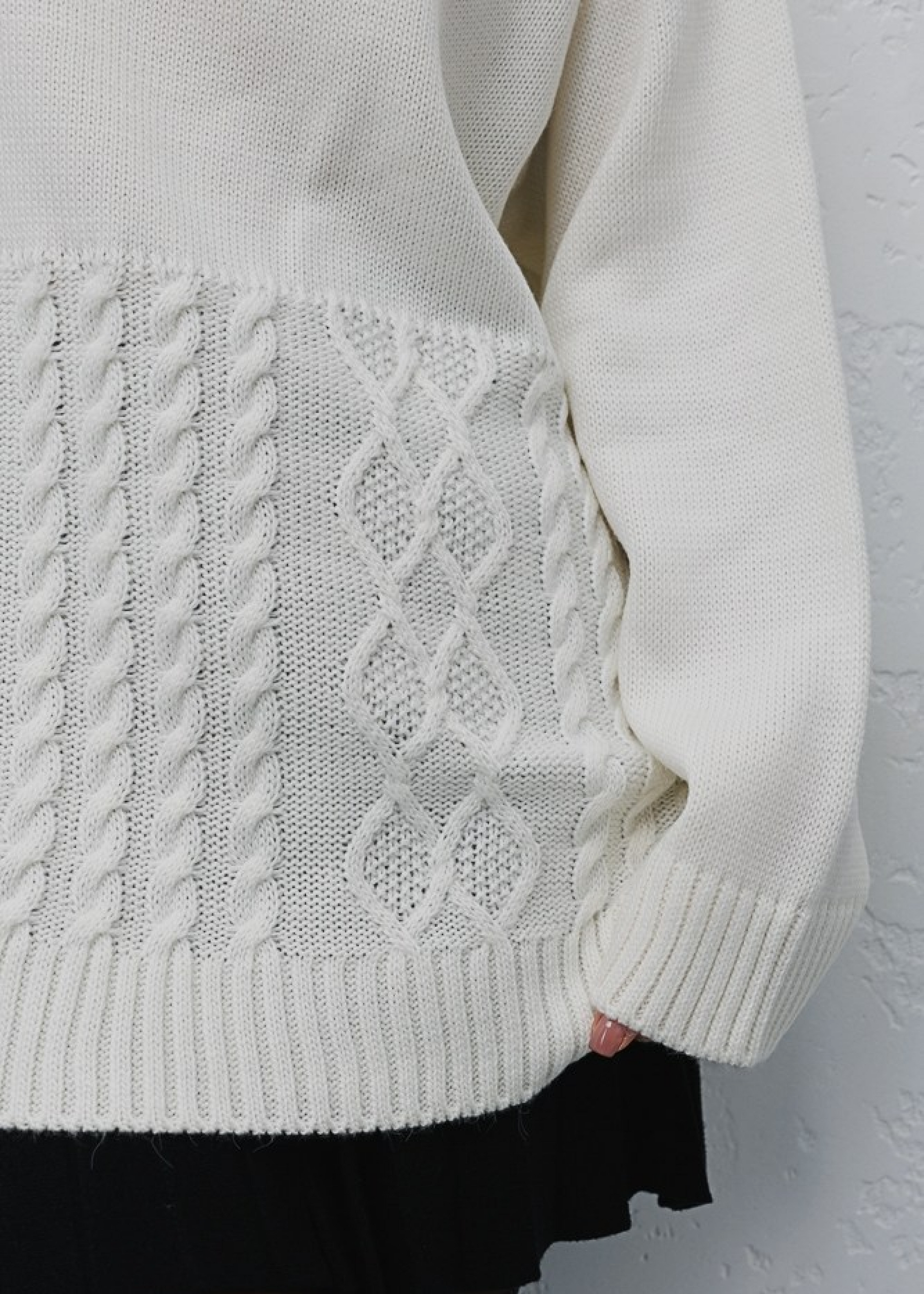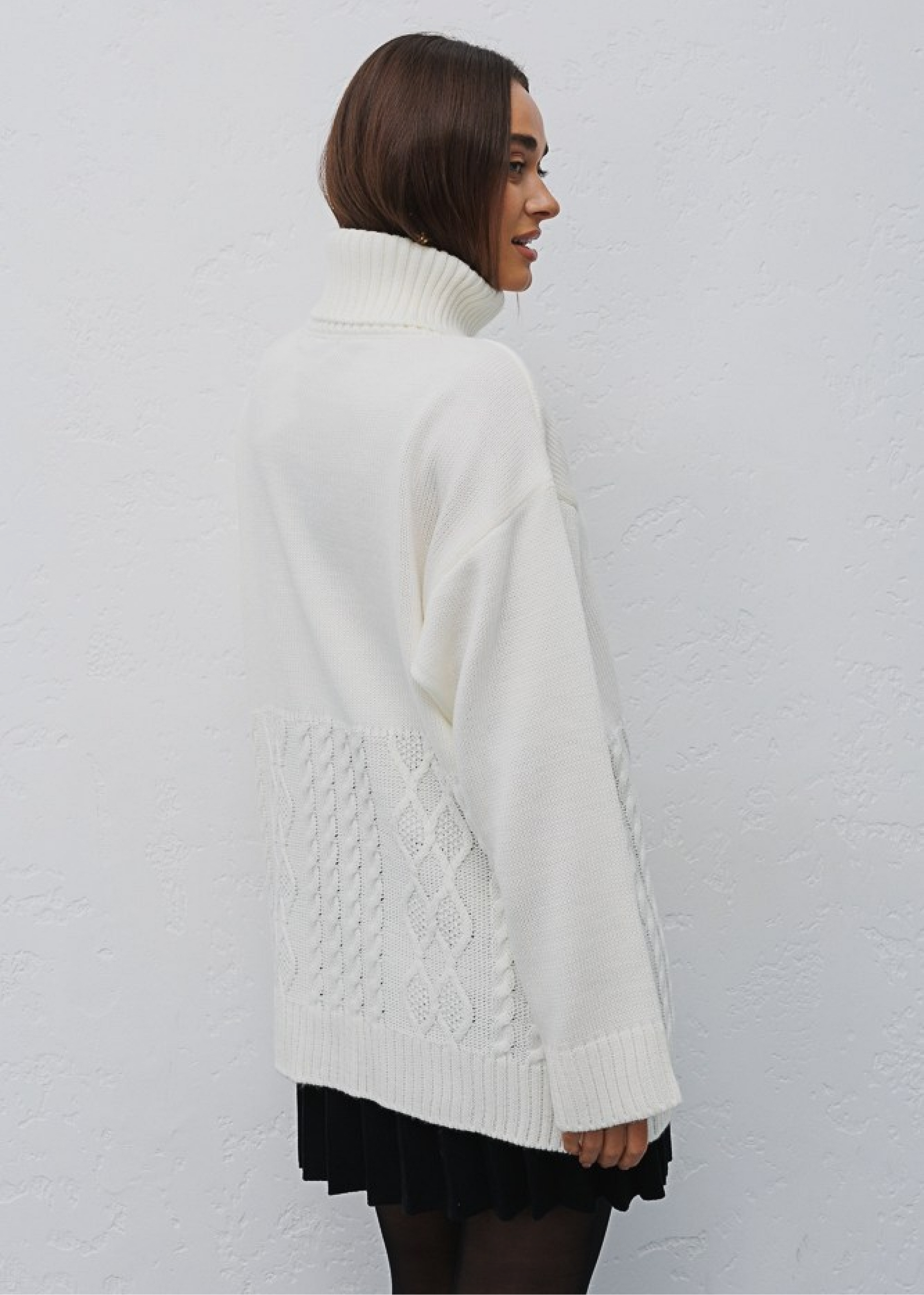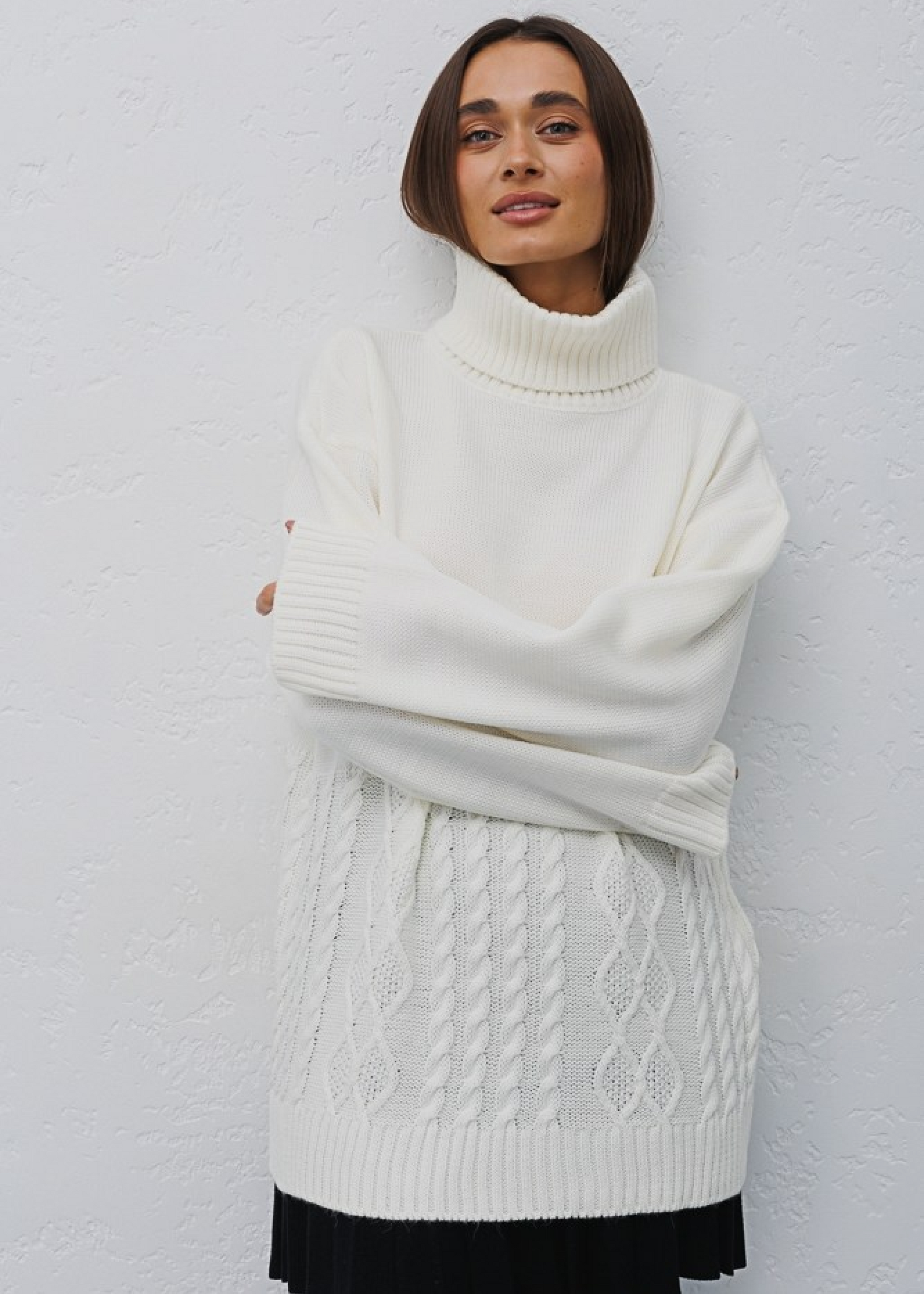 Затишний oversize светр з м’якої пряжі. Модель має об’ємний комір-стійку та декоративний візерунок із косами внизу виробу, що додає образу текстурності. Спущена лінія плеча й вільний крій створюють невимушений, комфортний силует.