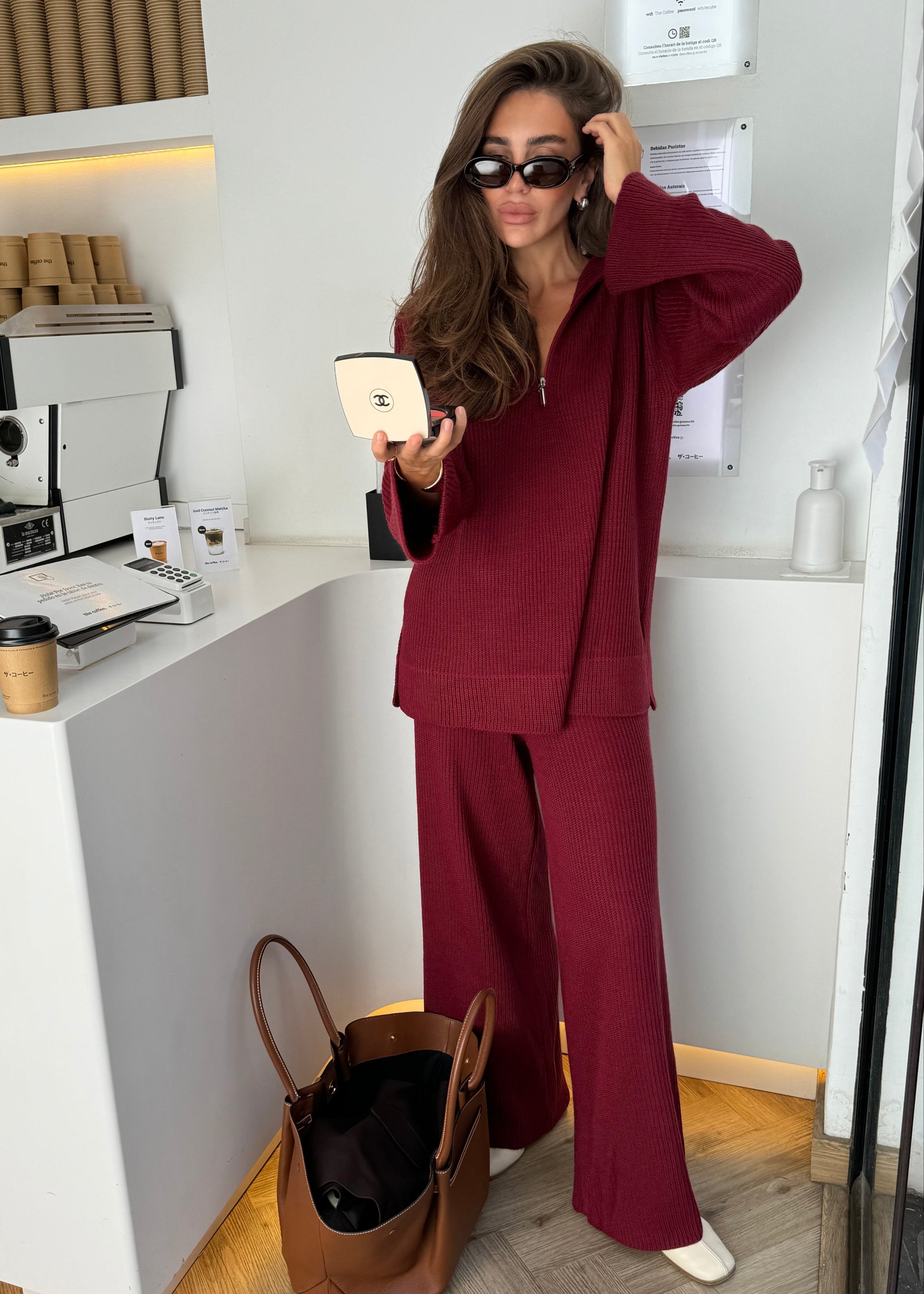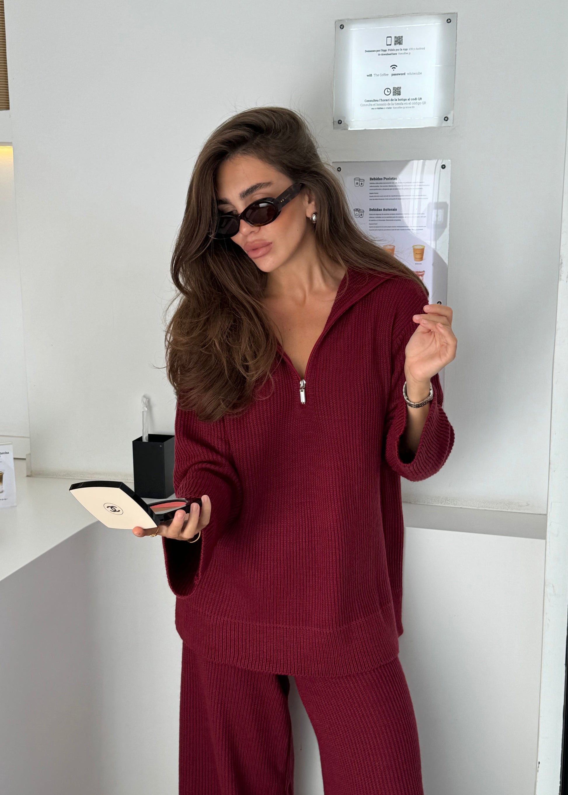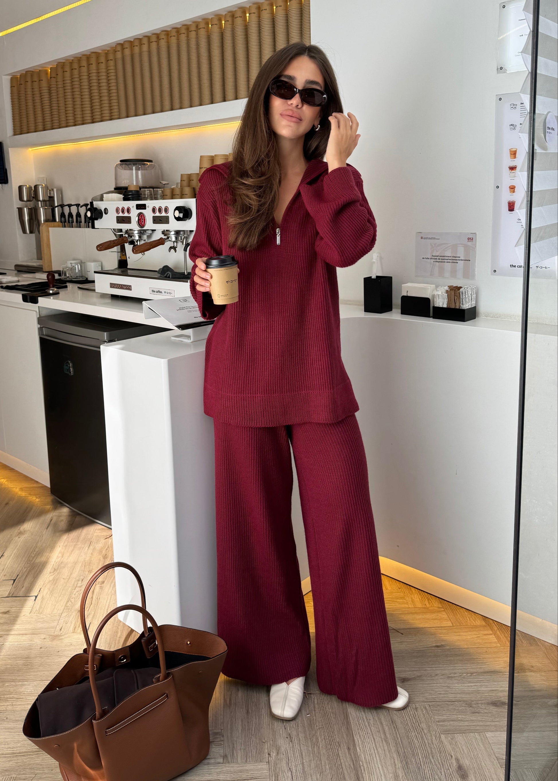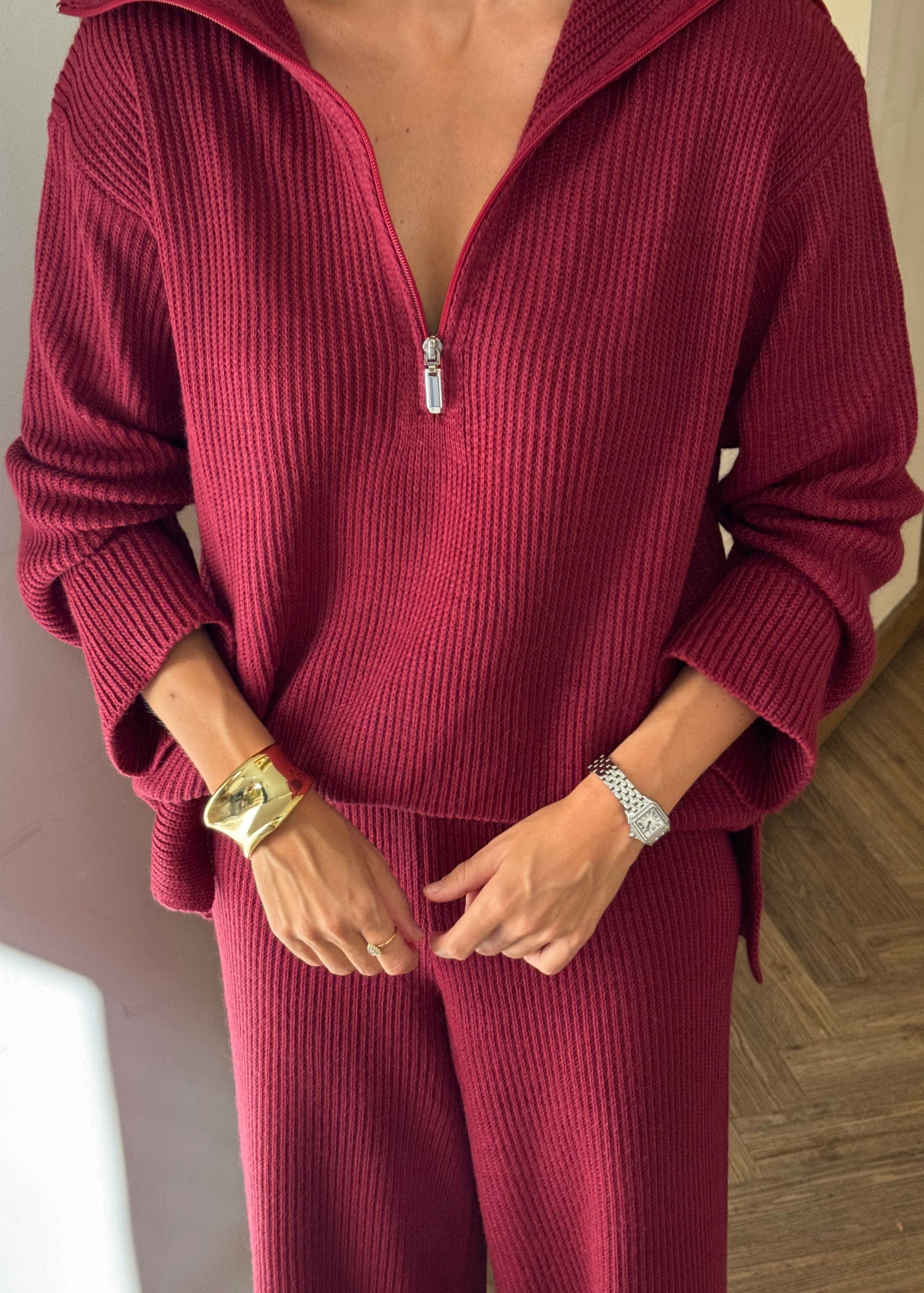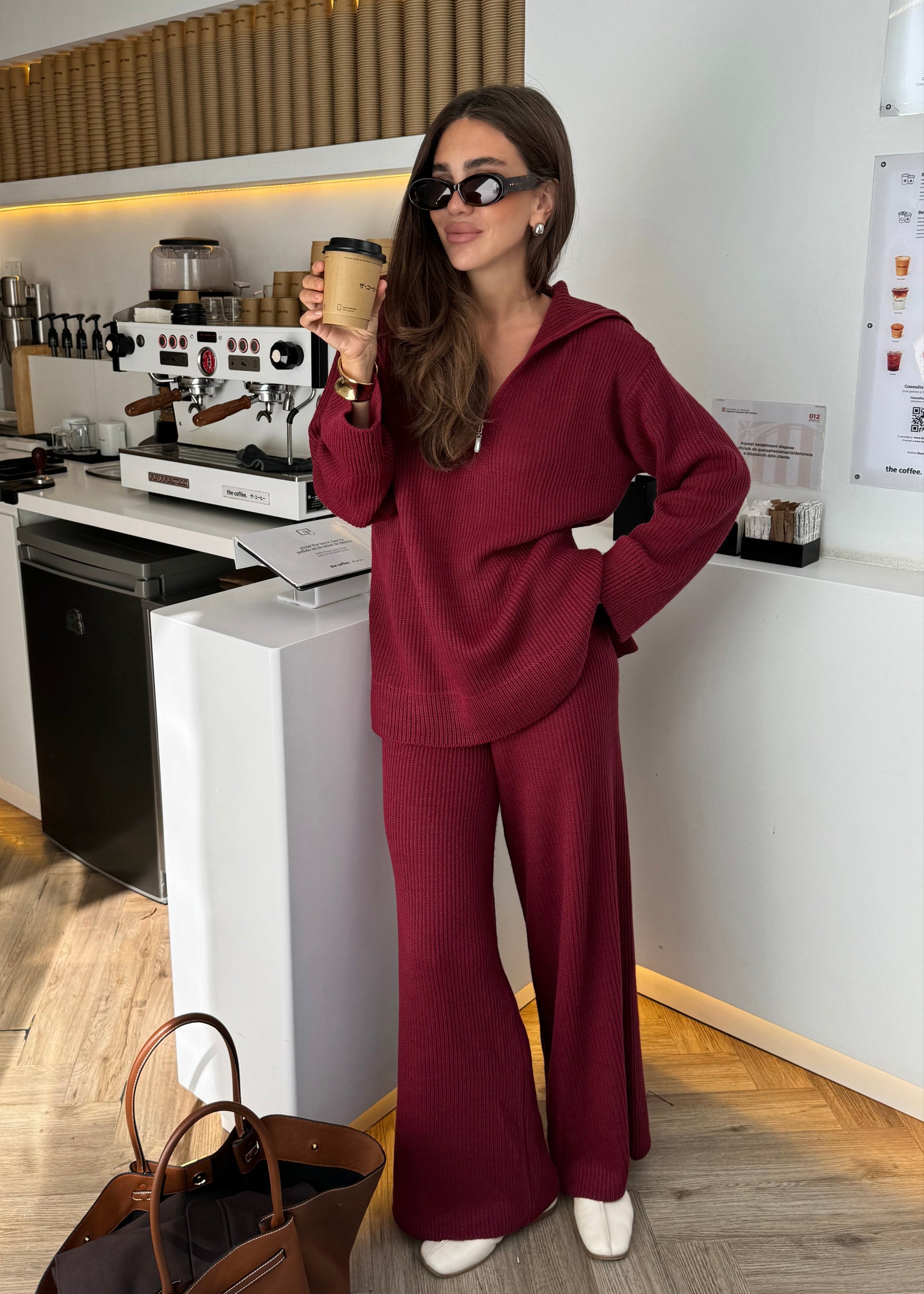 Стильний комплект, виконаний із м’якого трикотажу. Светр має вільний силует, подовжений крій та блискавку, що дозволяє регулювати виріз. Брюки із високою посадкою та розкльошеним донизу силуетом створюють відчуття комфорту та свободи рухів.