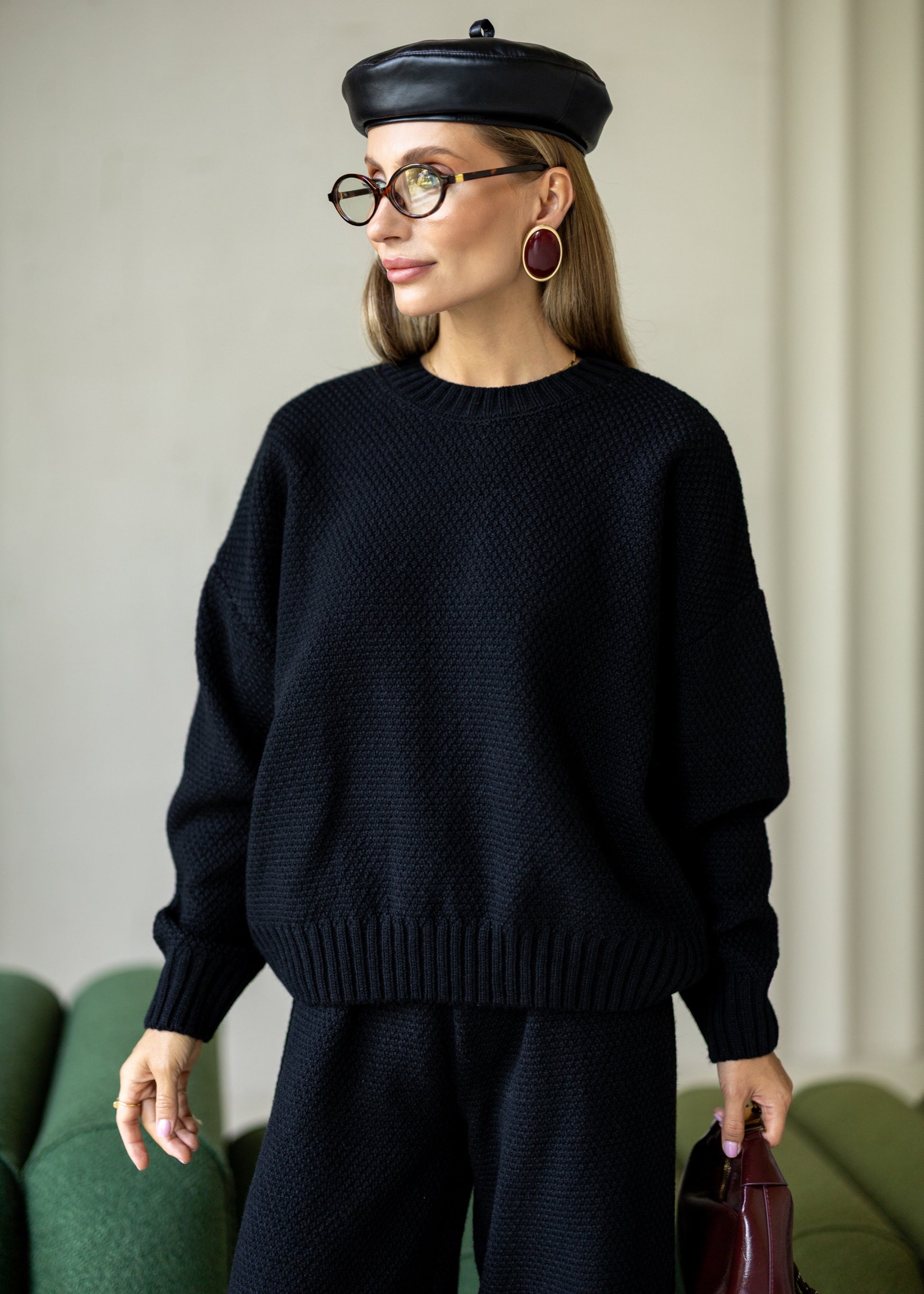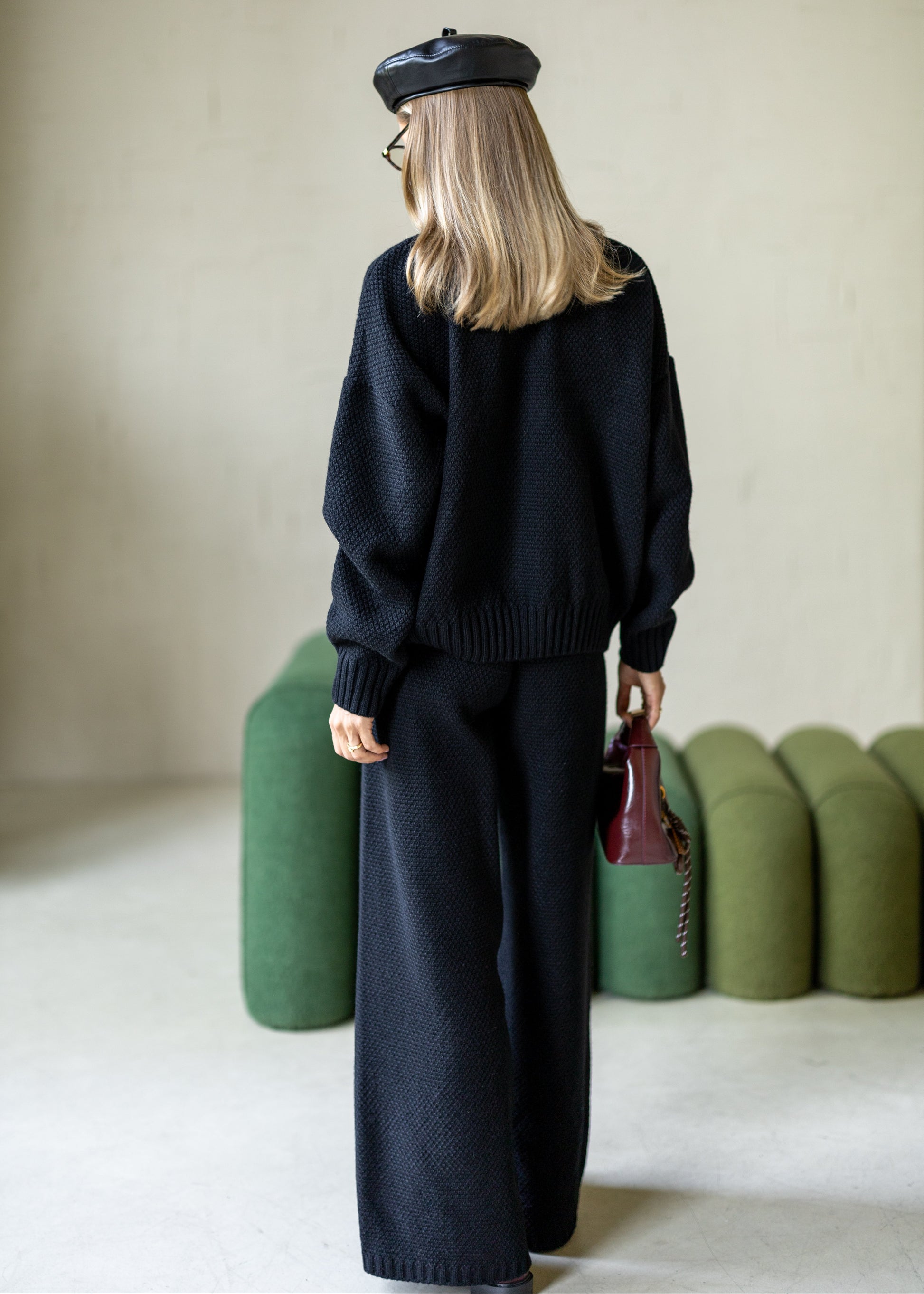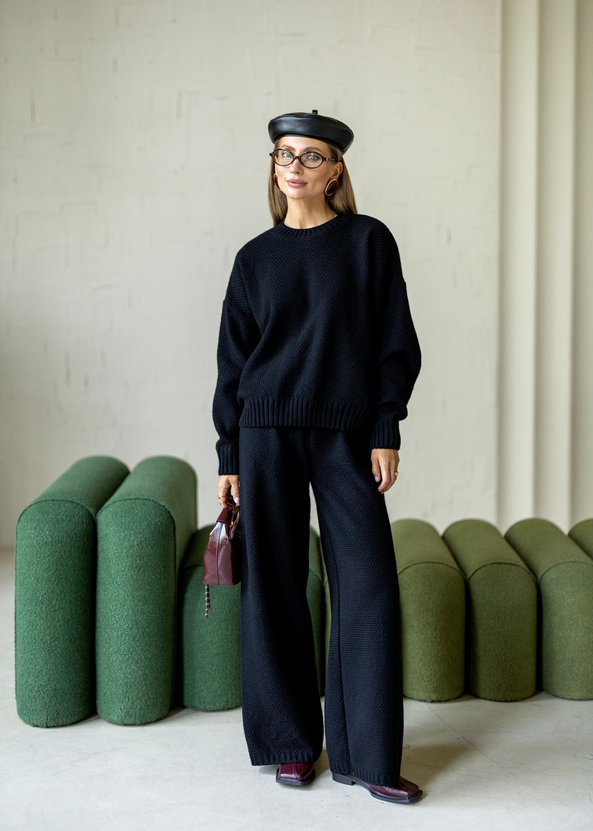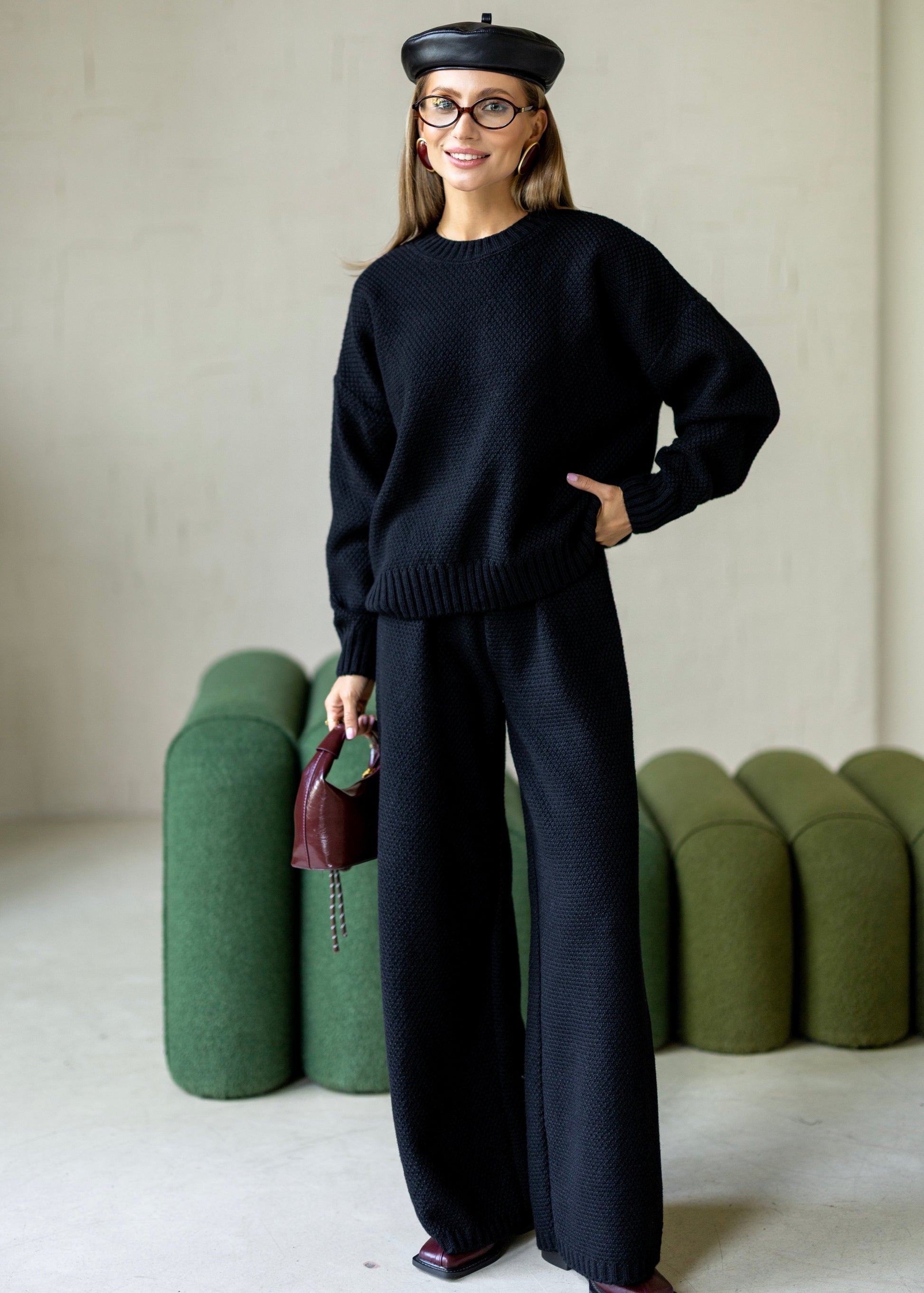 Стильний комплект, виконаний із м’якого трикотажу. Светр має вільний силует та подовжений крій. Брюки із високою посадкою та розкльошеним донизу силуетом створюють відчуття комфорту та свободи рухів.