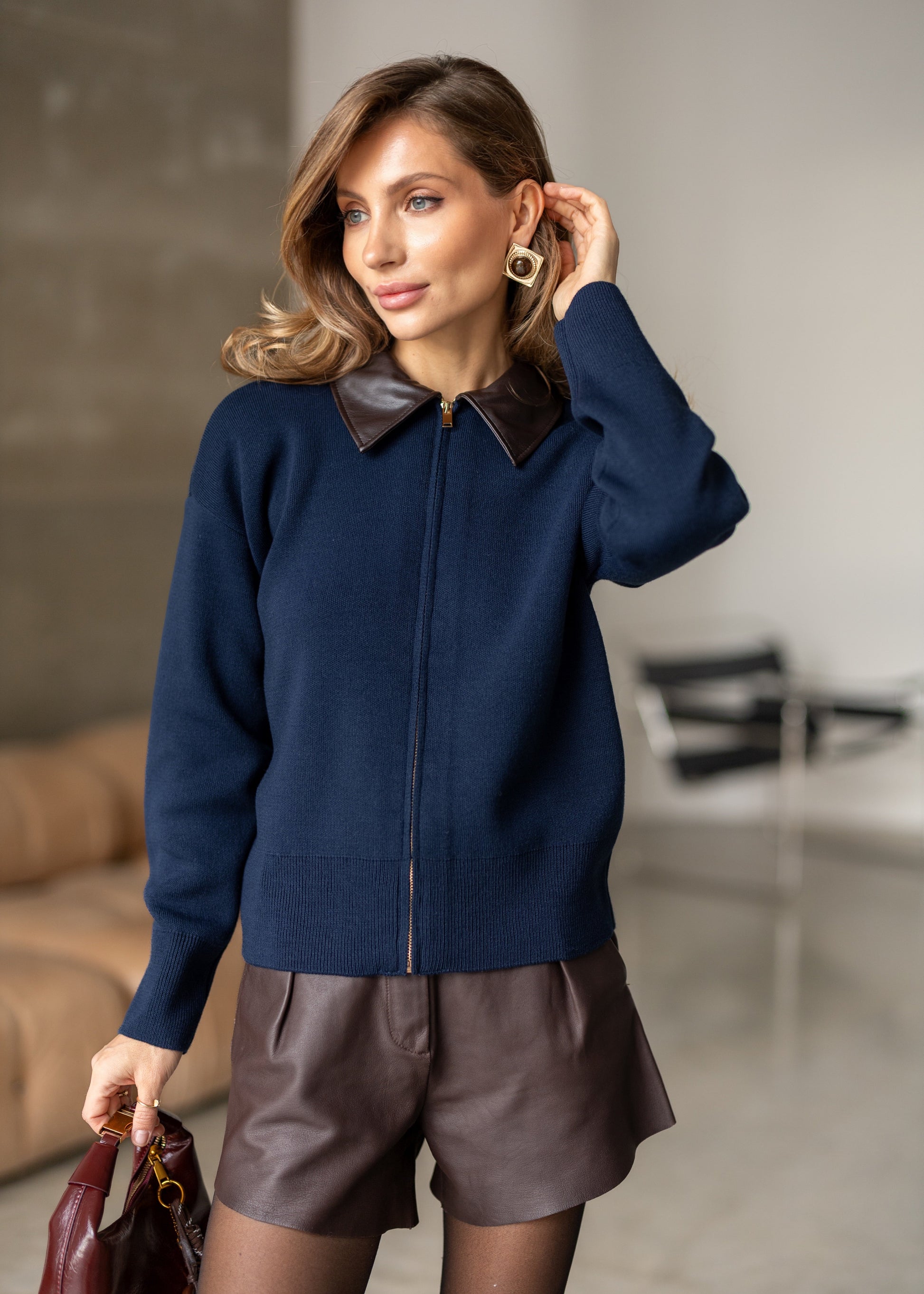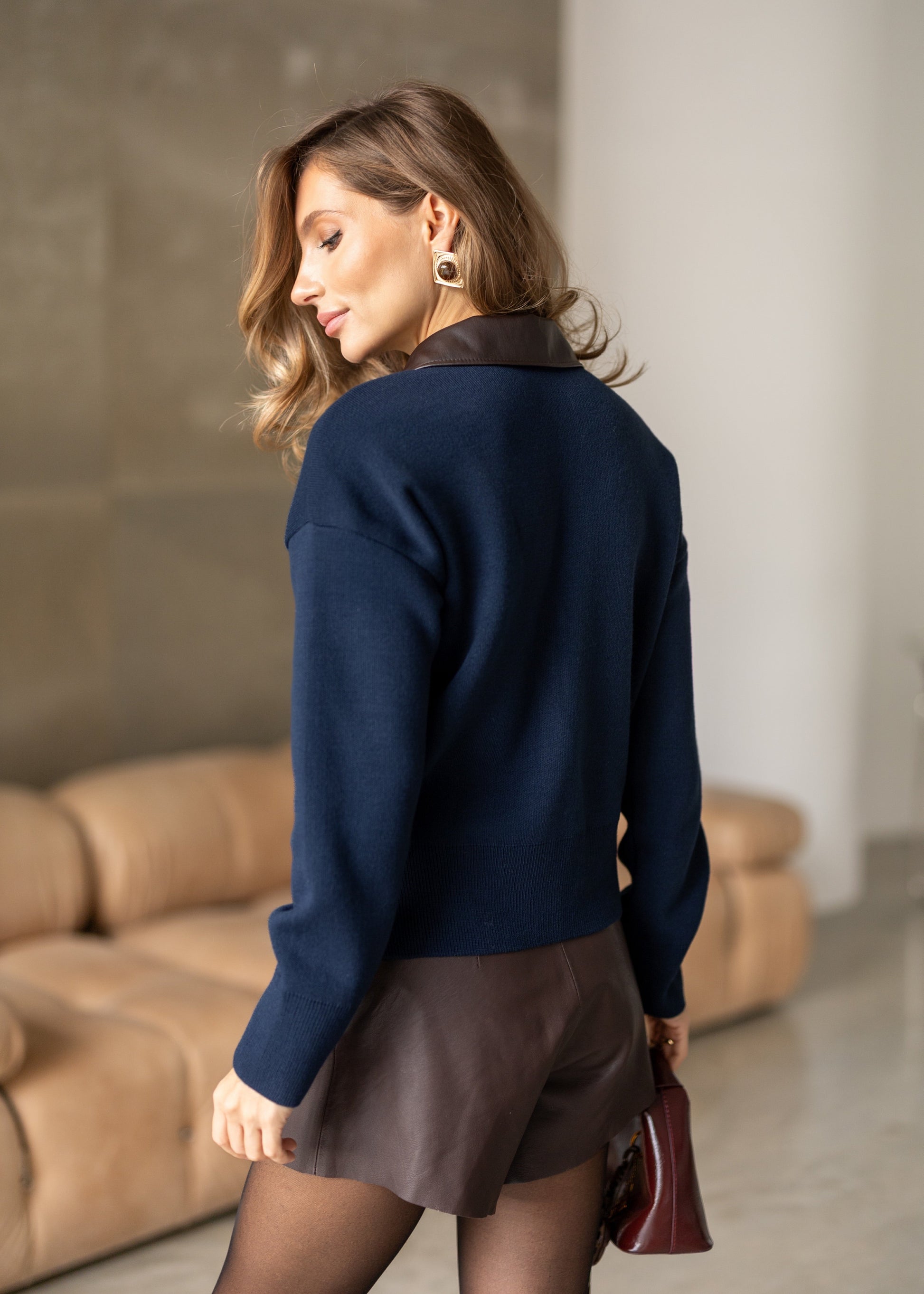 Лаконічний джемпер з акцентним шкіряним коміром. Ідеальний баланс комфорту та елегантності. Прямий крій, м'яка фактура.