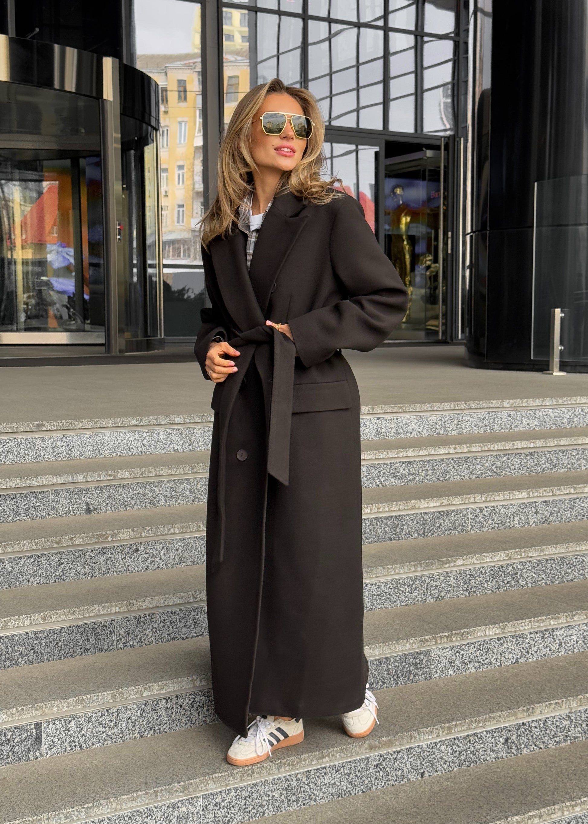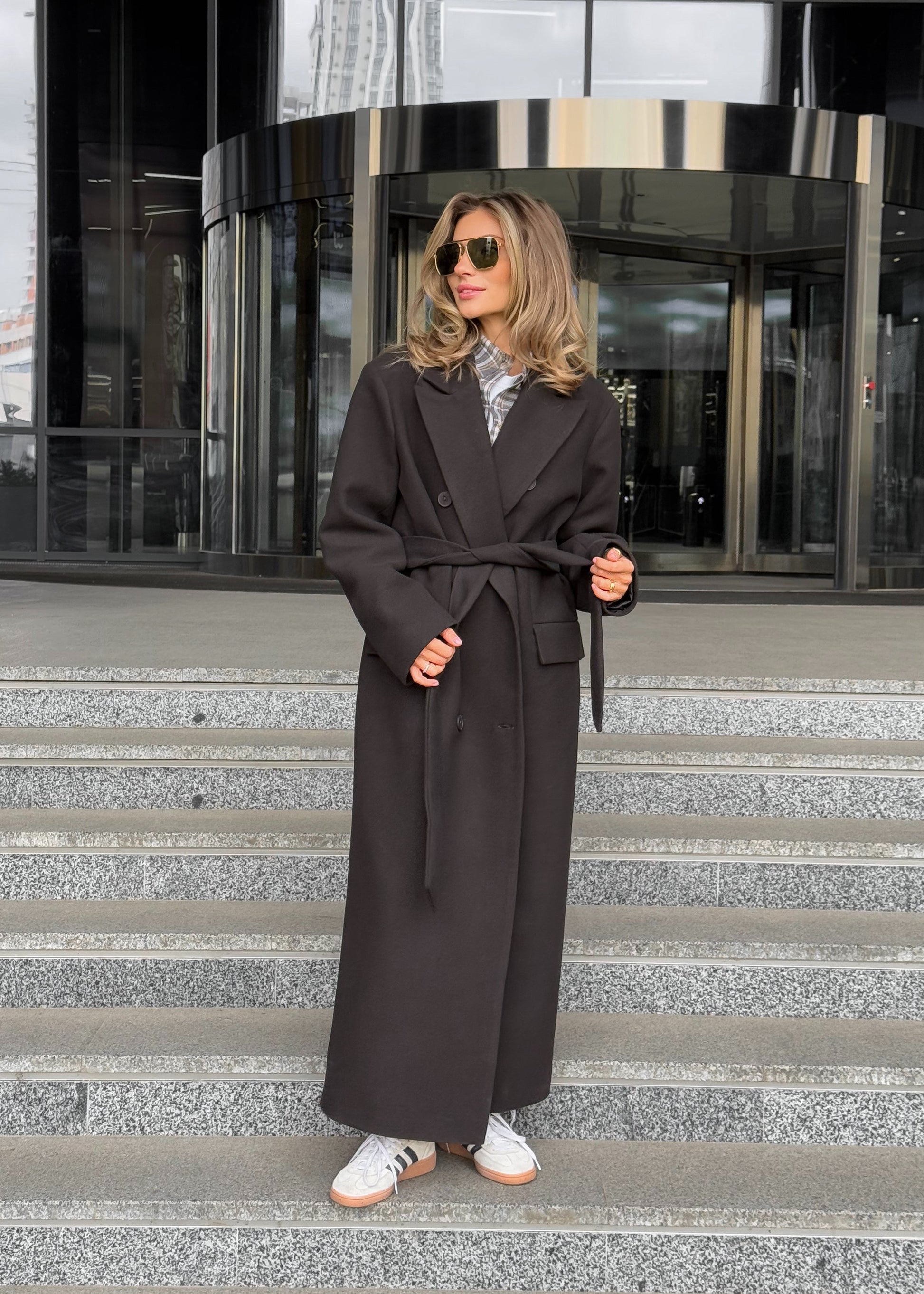 Подовжене пальто в чорному кольорі. Класичний фасон у сучасному виконанні. Подовжений крій з подвійним рядом ґудзиків додає силуету строгості та елегантності. Вільна посадка робить пальто зручним у щоденному використанні, а універсальний сірий відтінок легко поєднується з будь-яким гардеробом.