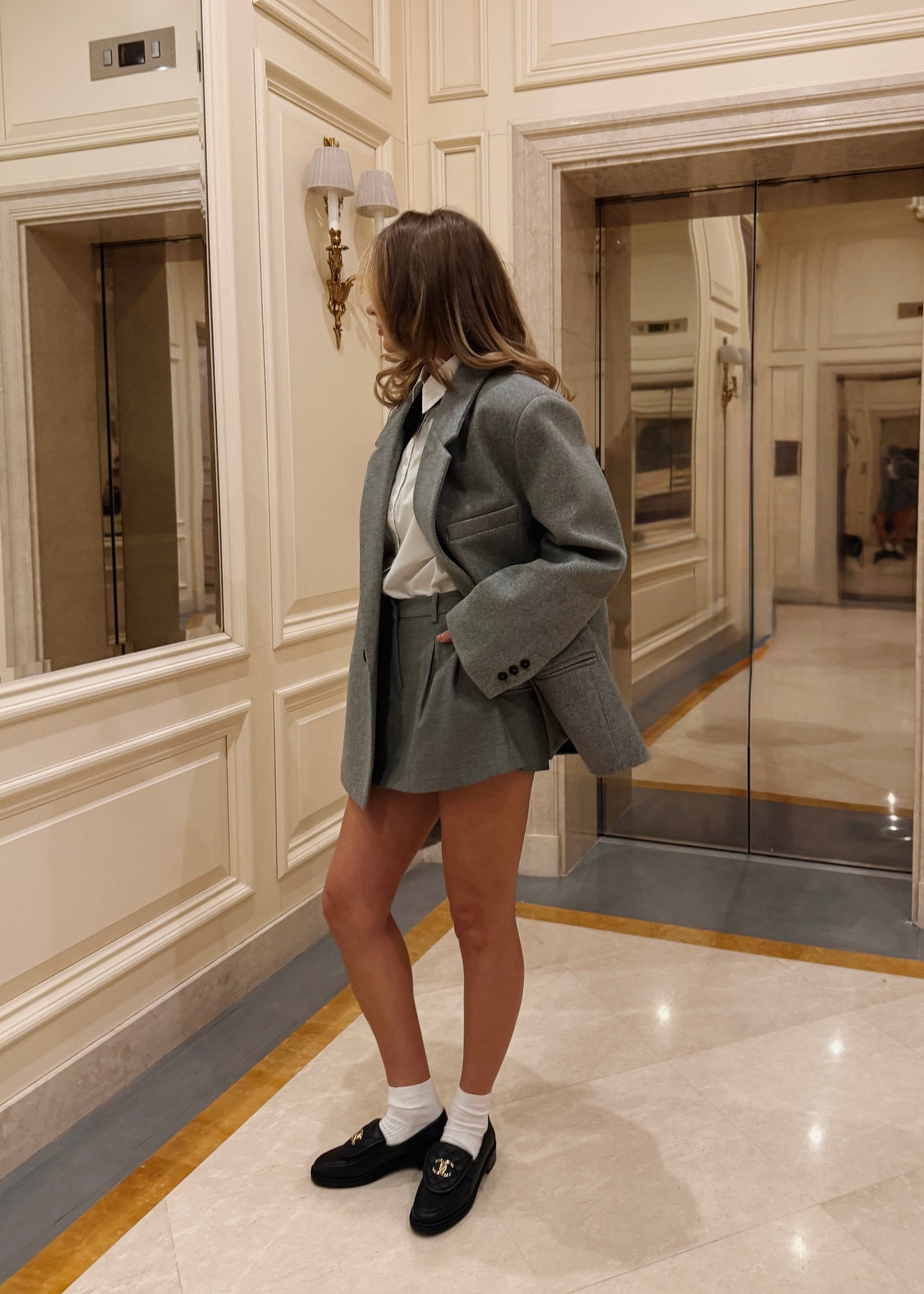 Двобортний крій із широкими лацканами та спущеною лінією плеча створює актуальний силует вільної посадки. Виконаний із щільної костюмної тканини, що добре тримає форму. Лаконічний дизайн робить жакет універсальною базою для офісних і кежуал-комбінацій.