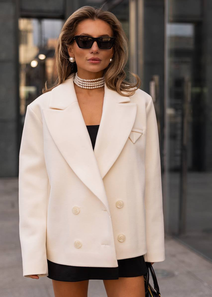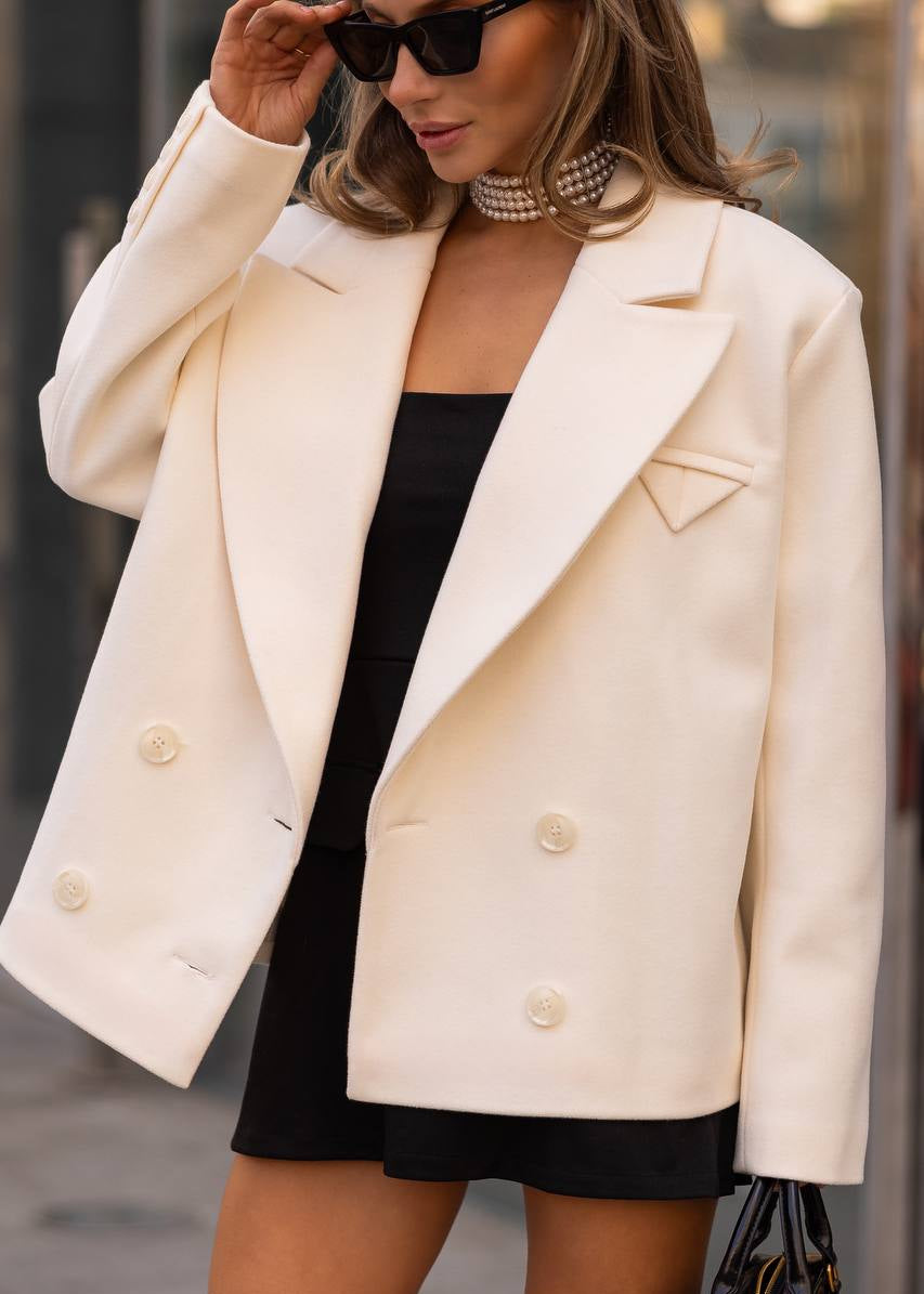 Стильний укорочений двобортний жакет вільного крою, виконаний у молочному відтінку. Модель має широкі лацкани, акуратні ґудзики в тон та м’яку структуровану посадку. Ідеально тримає форму, доповнює як повсякденні, так і вечірні образи.