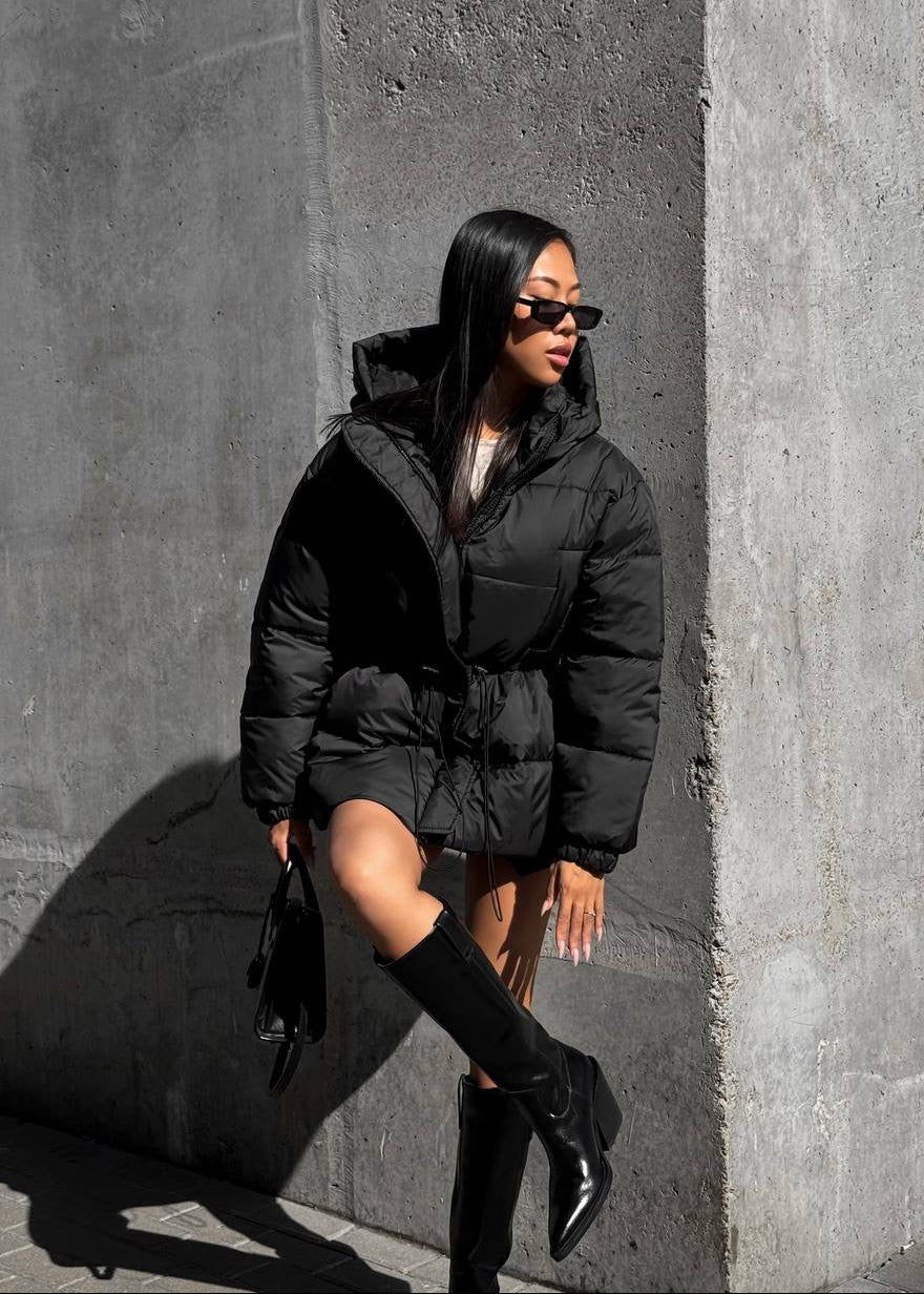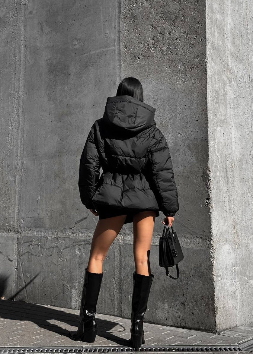 Модель має вільний силует з акцентом на талії завдяки поясу, зручні кишені та капюшон для захисту від холоду.