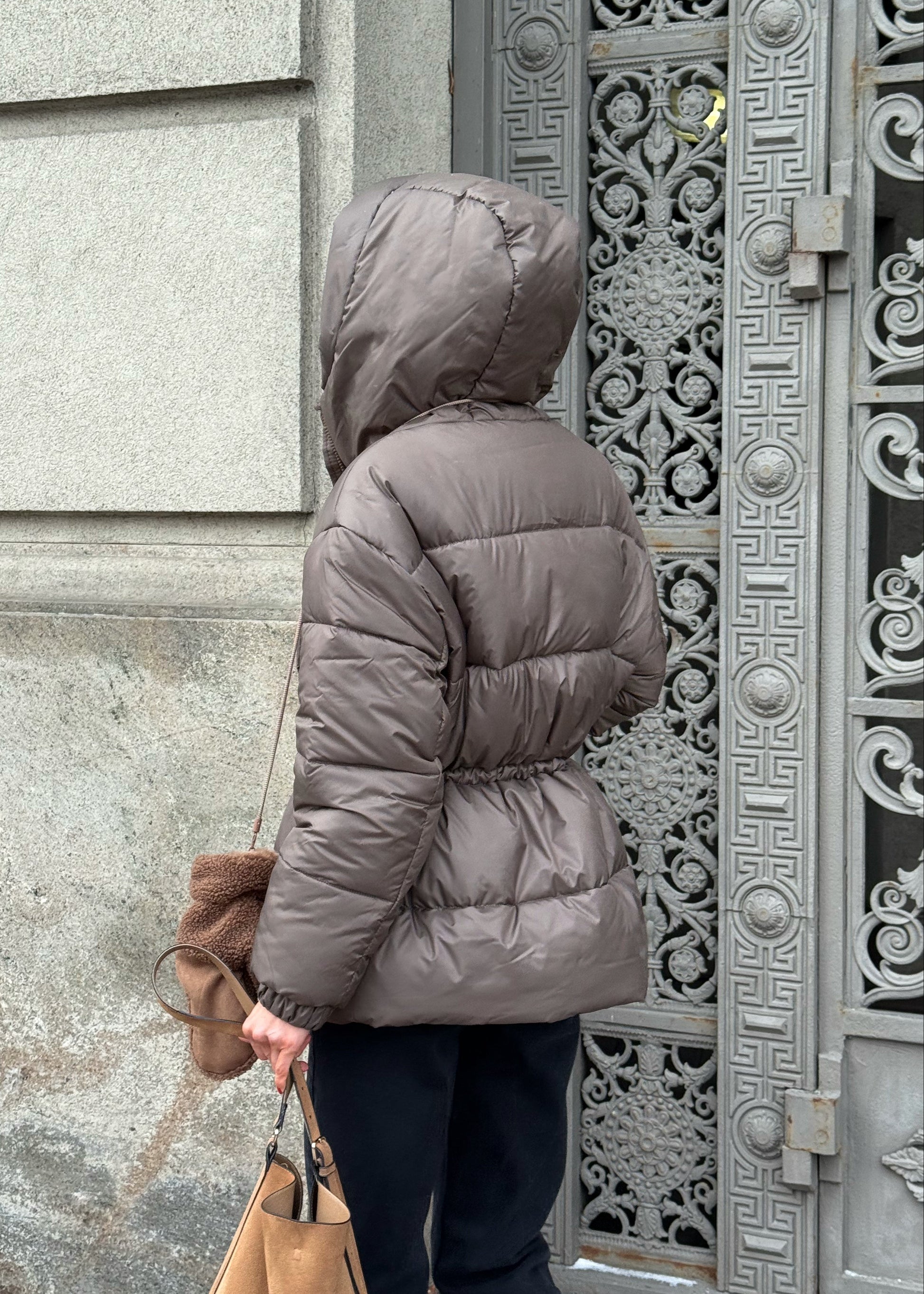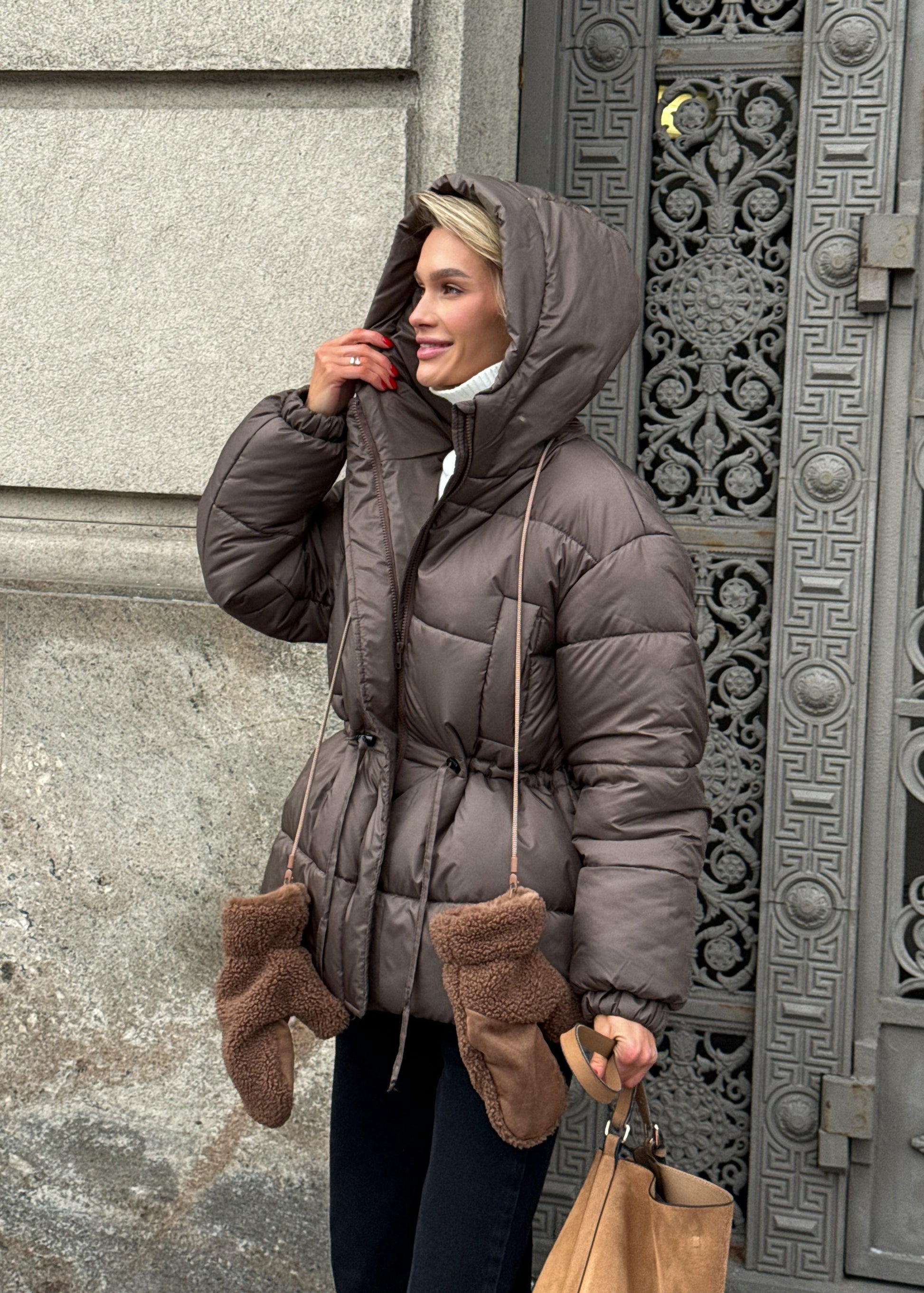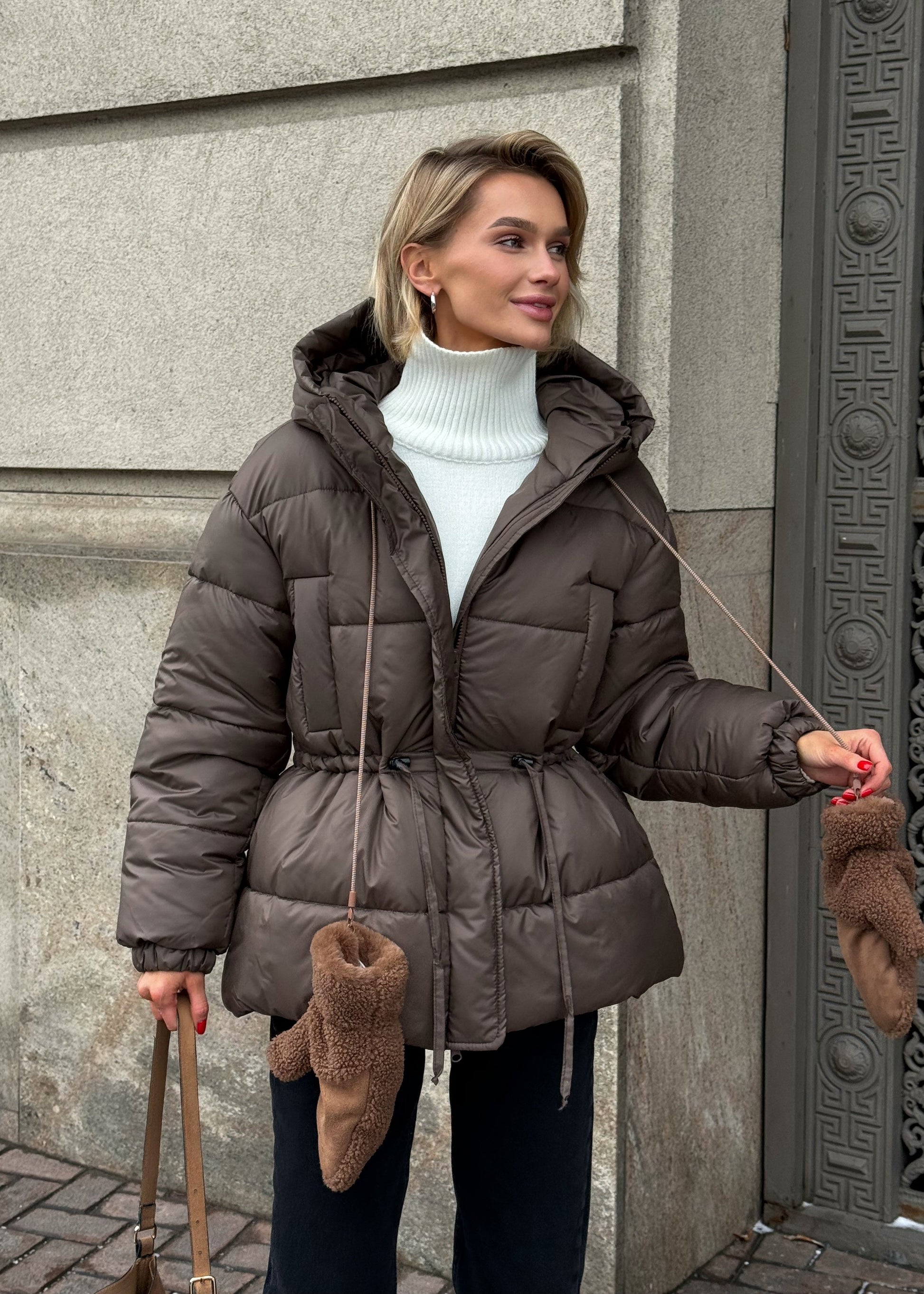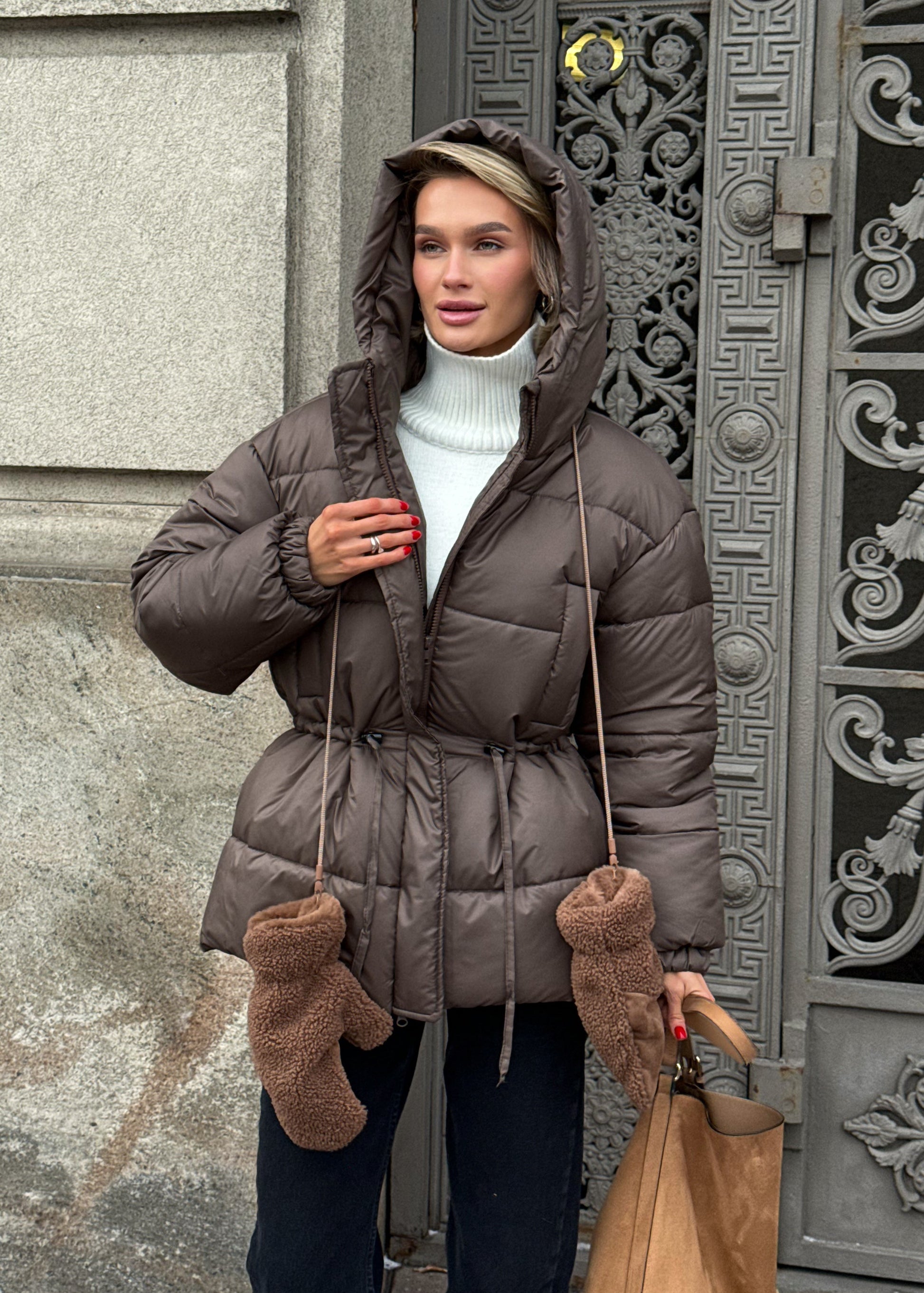 Модель має вільний силует з акцентом на талії завдяки поясу, зручні кишені та капюшон для захисту від холоду.