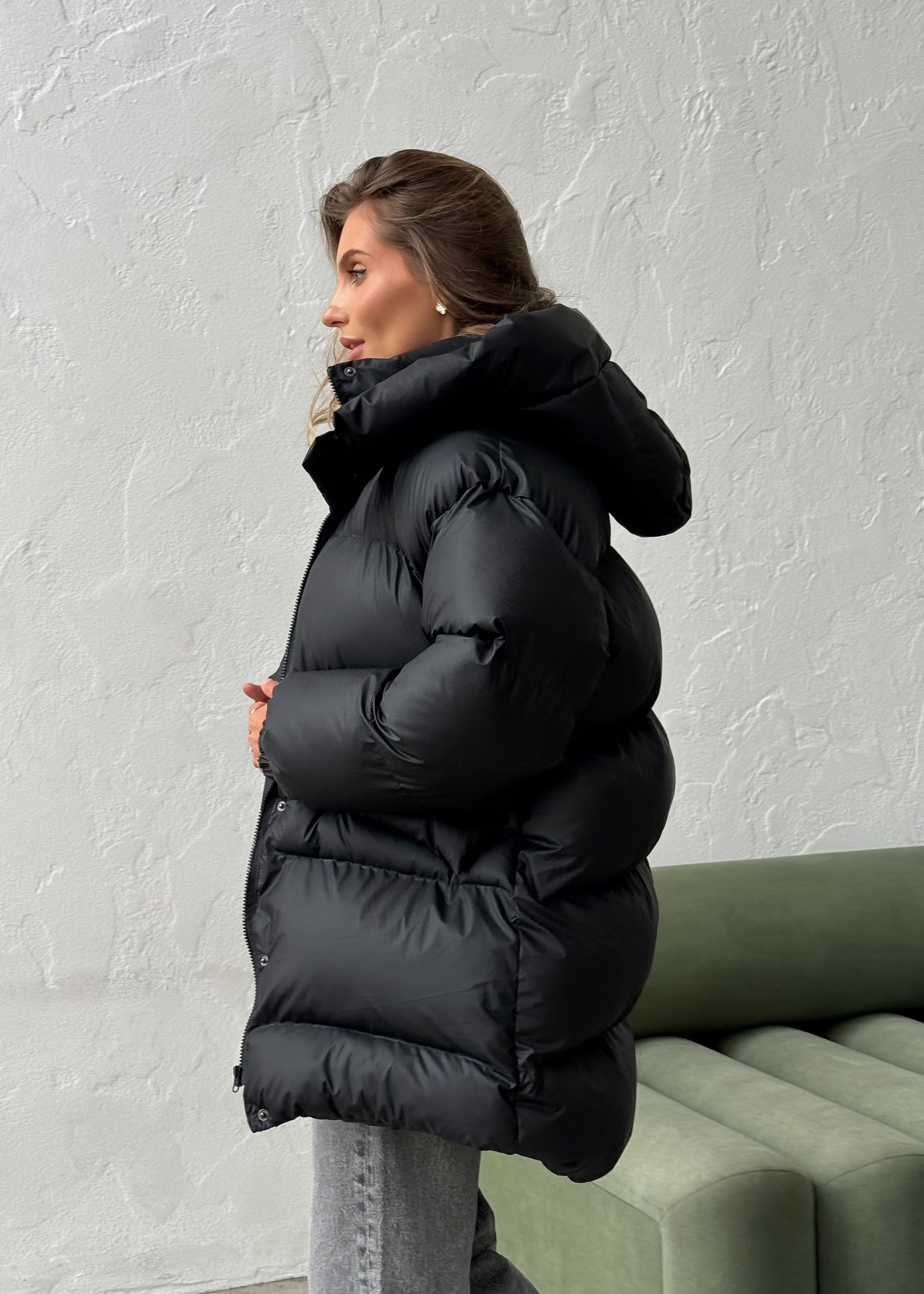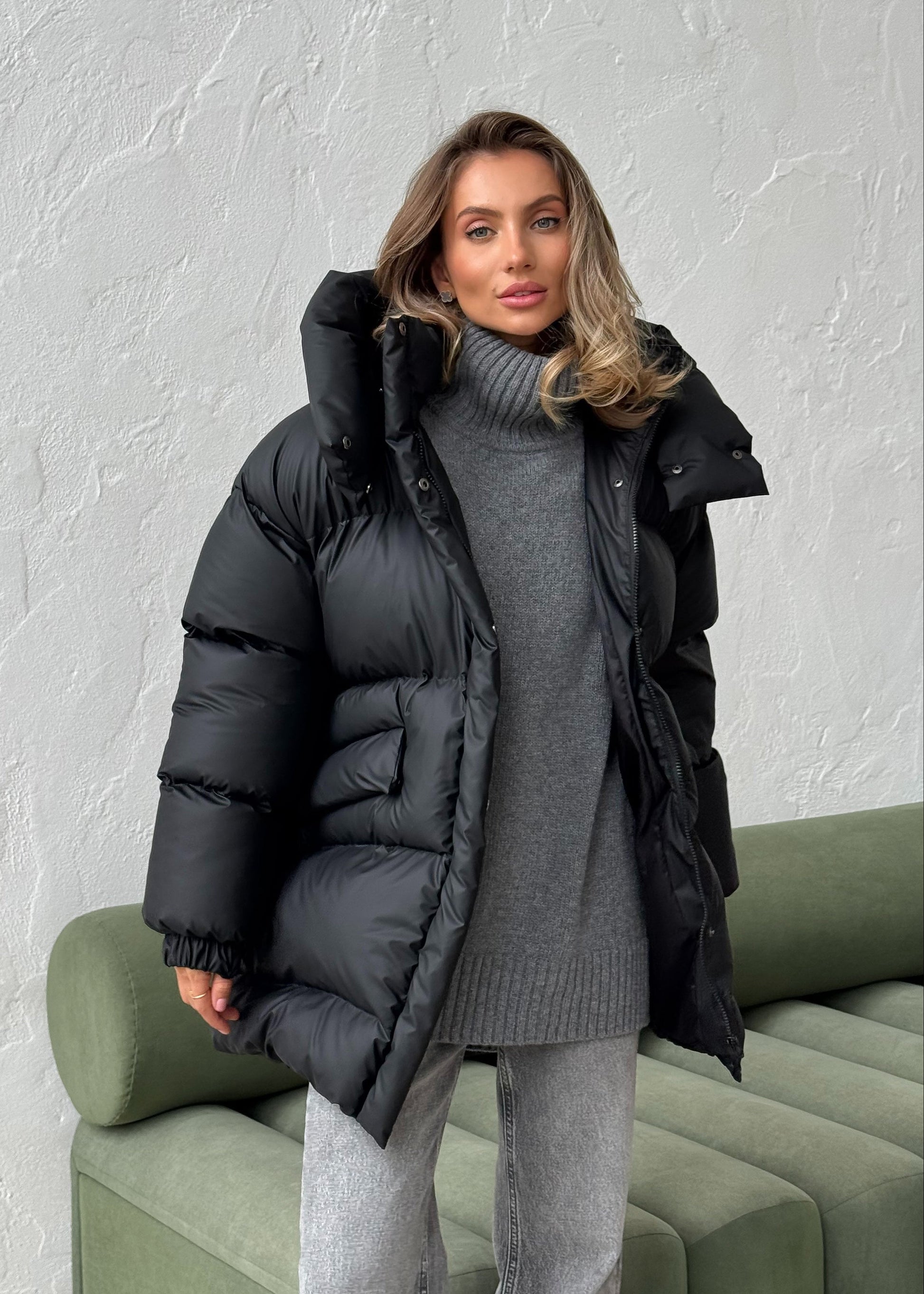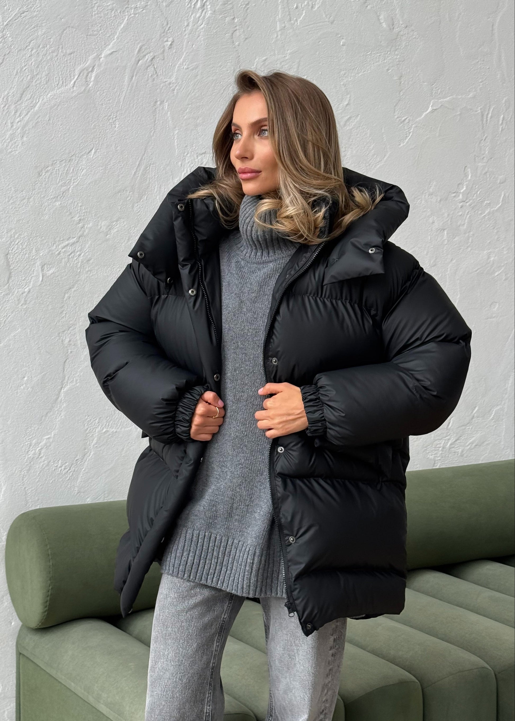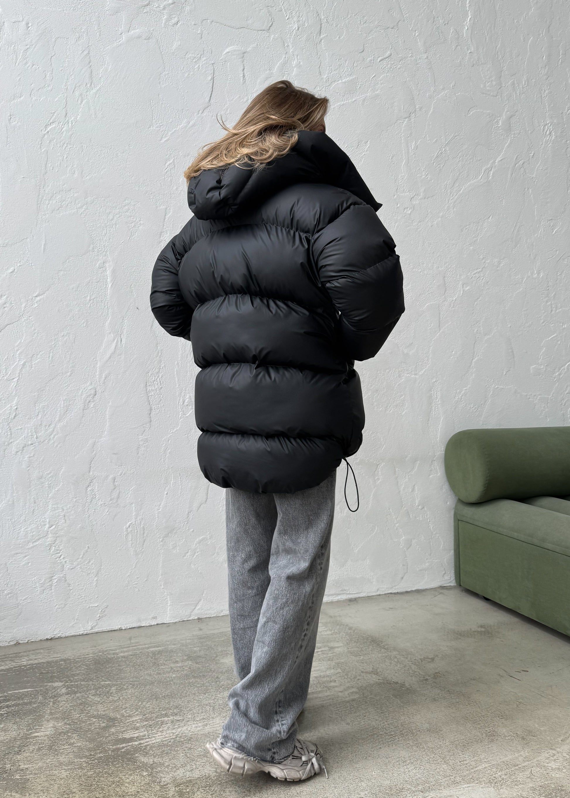 Обʼємний силует з регульованою куліскою по низу дозволяє створити бажану форму, а знімний капюшон додає практичності. Пуховик має дві функціональні кишені та застібку на блискавку з вітрозахисною планкою.