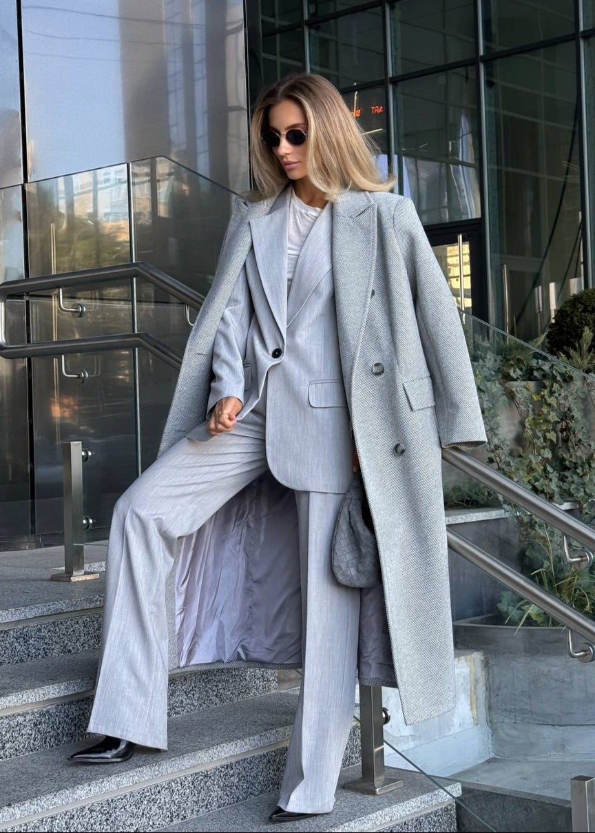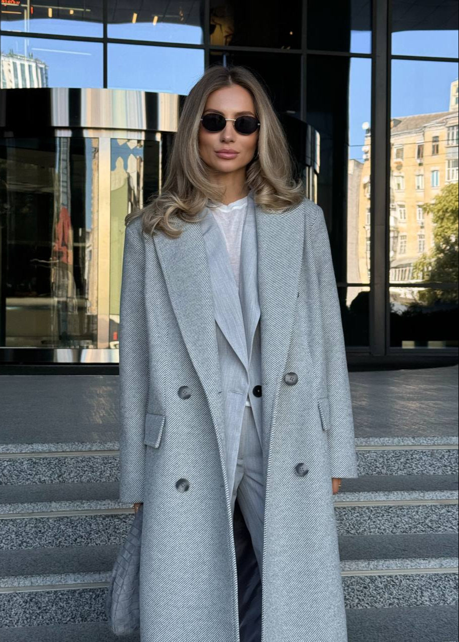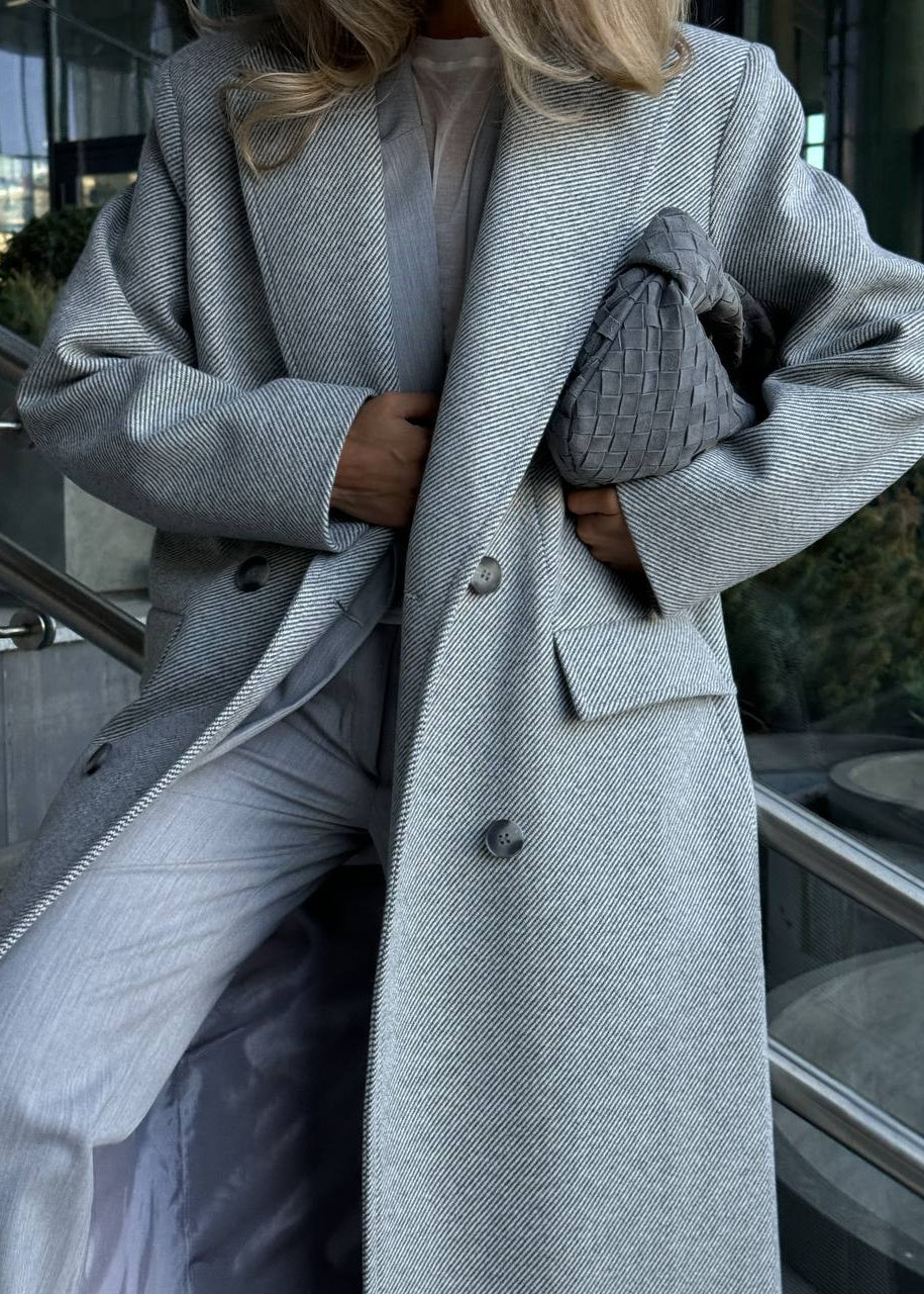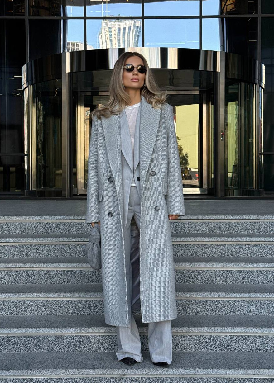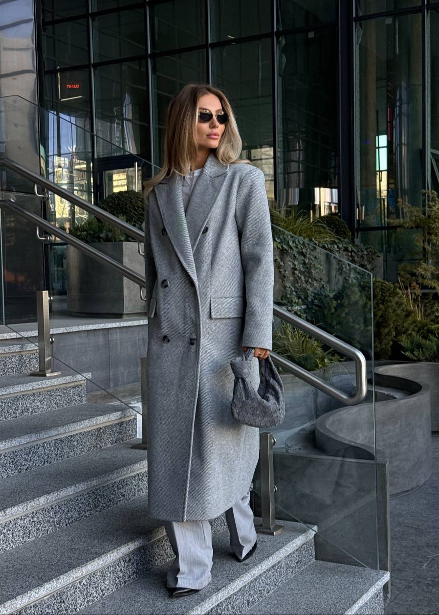 Подовжене пальто прямого силуету. Класичний фасон у сучасному виконанні. Подовжений крій з подвійним рядом ґудзиків додає силуету строгості та елегантності. Вільна посадка робить пальто зручним у щоденному використанні, а універсальний сірий відтінок легко поєднується з будь-яким гардеробом.