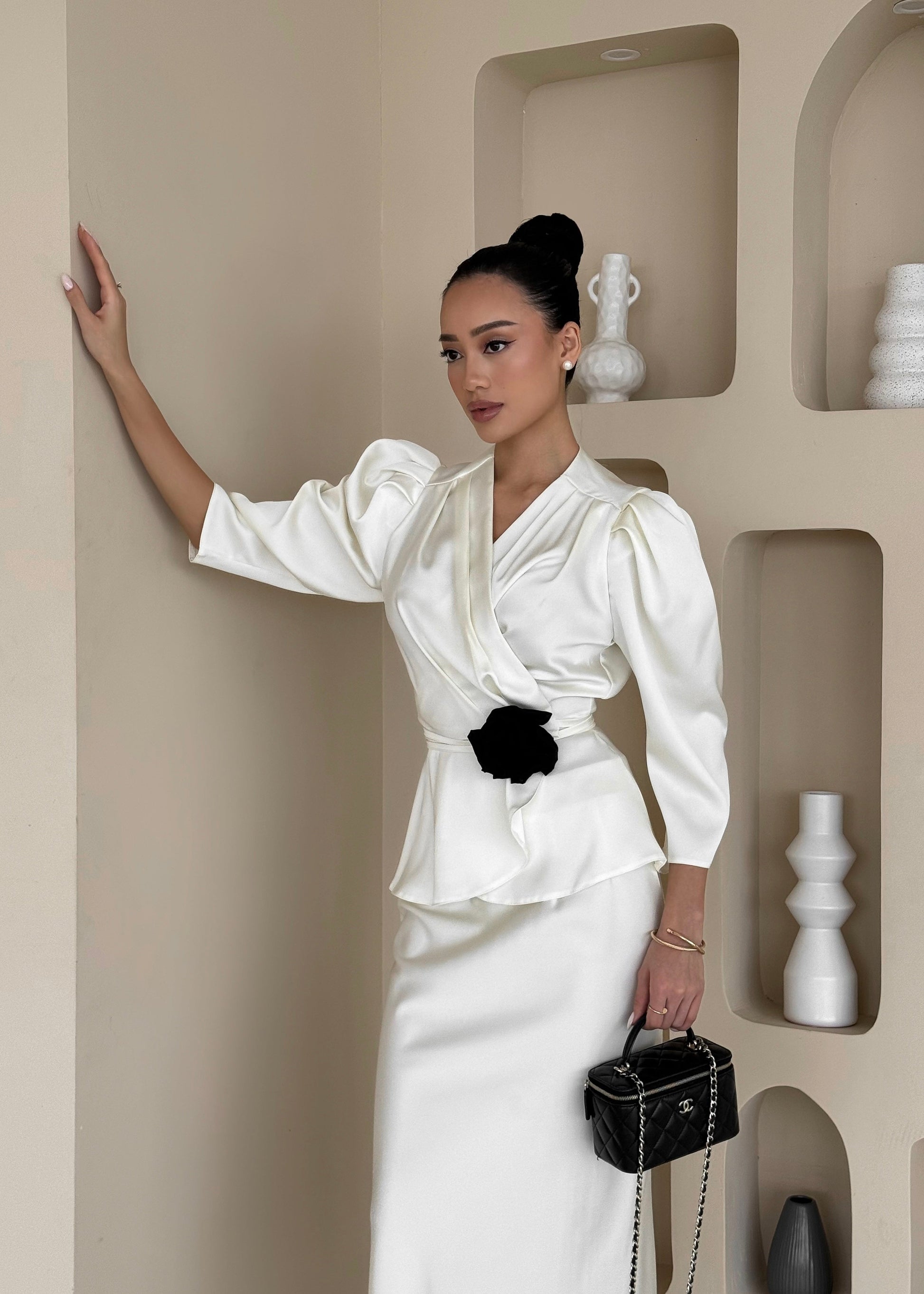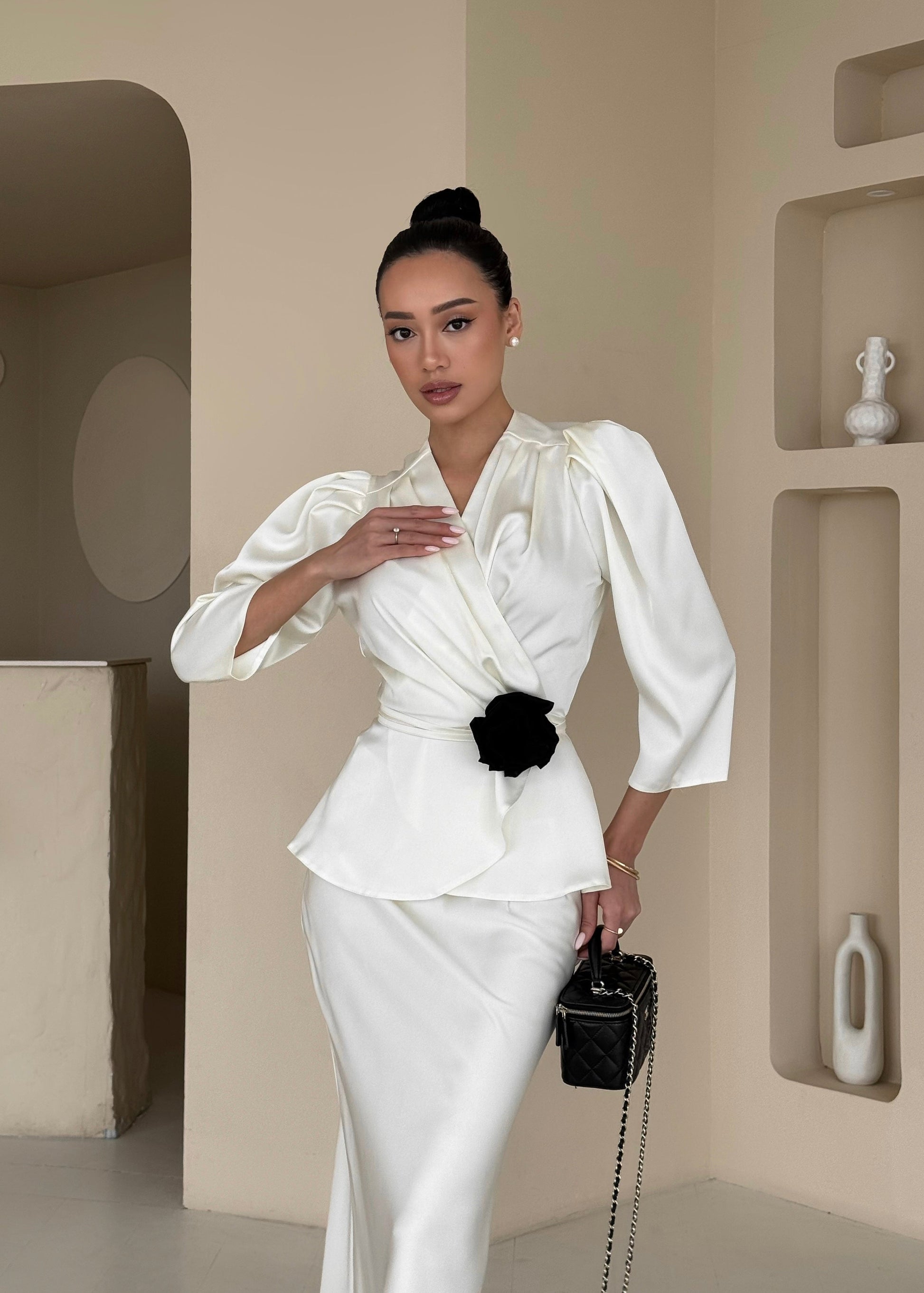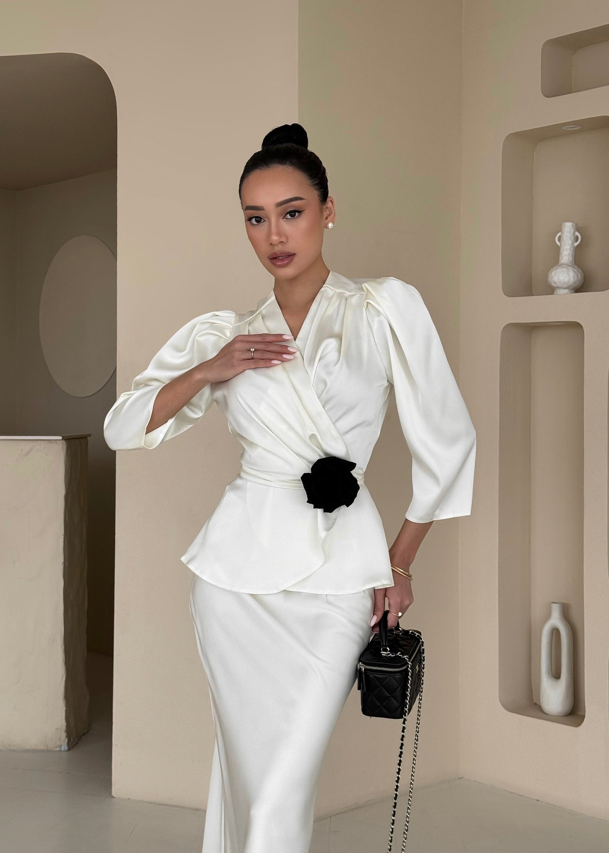 Комплект із делікатного сатину, створений для бездоганного, виваженого образу. М’який благородний блиск тканини підкреслює кожен рух, а скульптурний крій формує витончену силуетну лінію. Акцентний пояс-квітка, що йде в комплекті, підкреслює талію та додає образу характерного вишуканого акценту. Об’ємні плечові рукави створюють елегантну архітектуру верху, а міді-спідниця зі струмким падінням забезпечує довершеність та гармонію всього ансамблю.