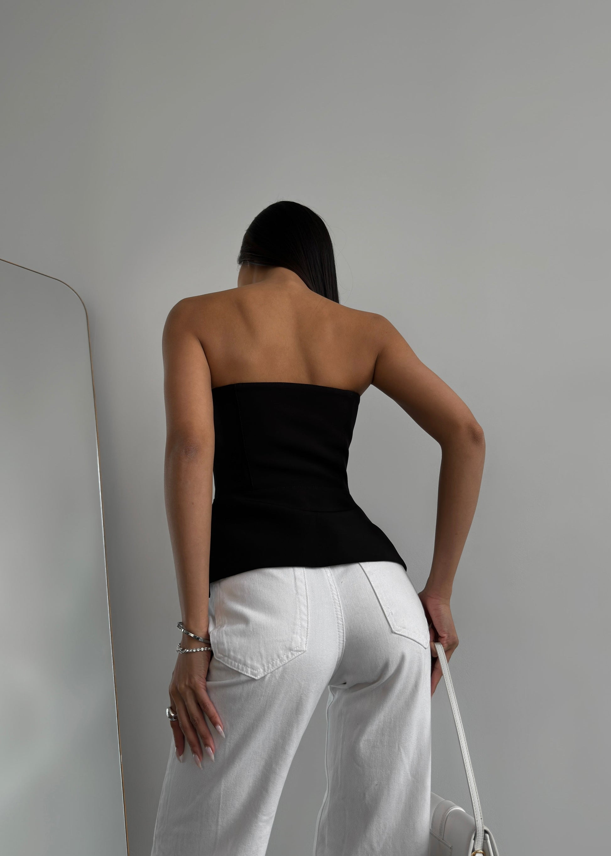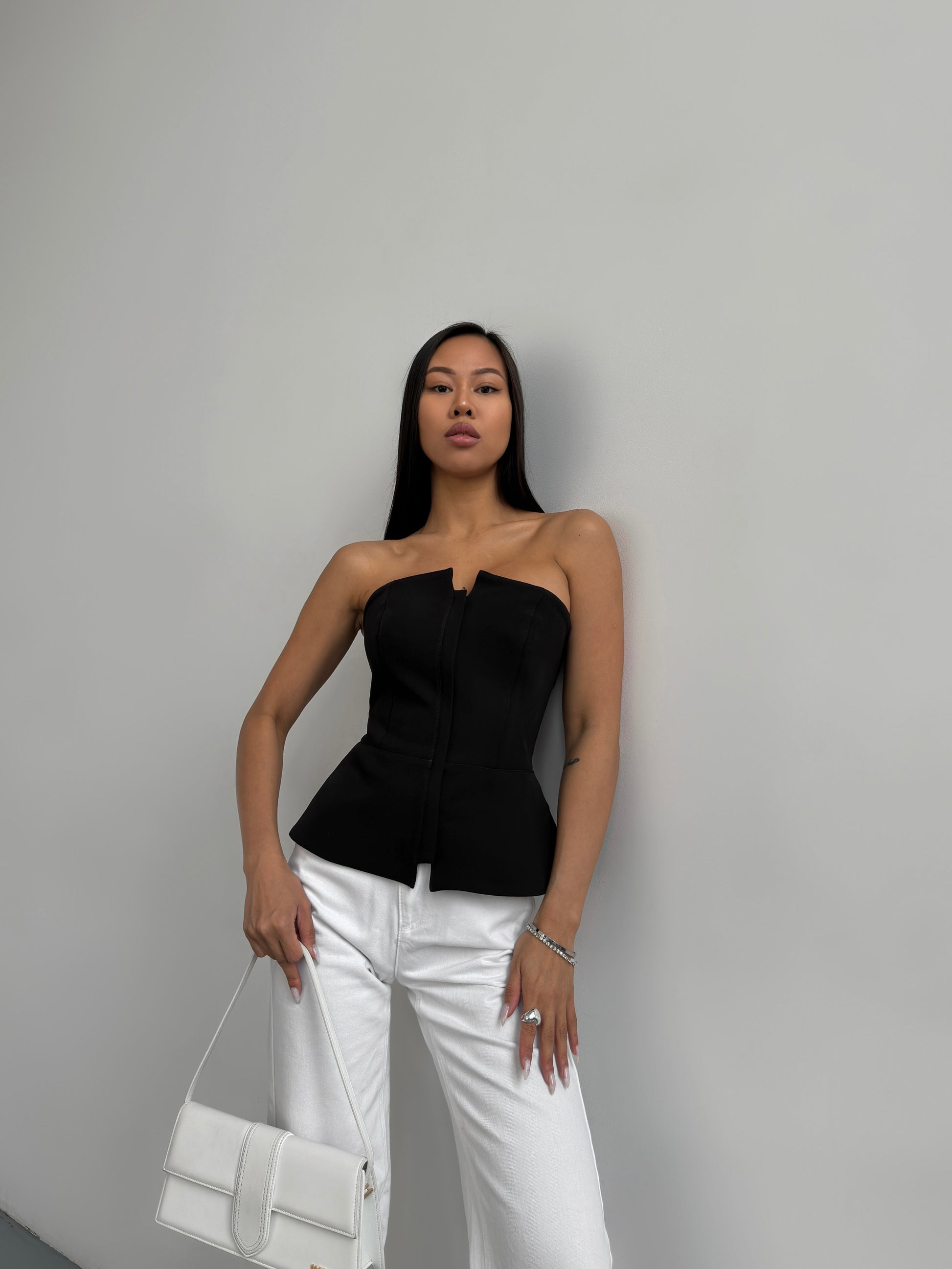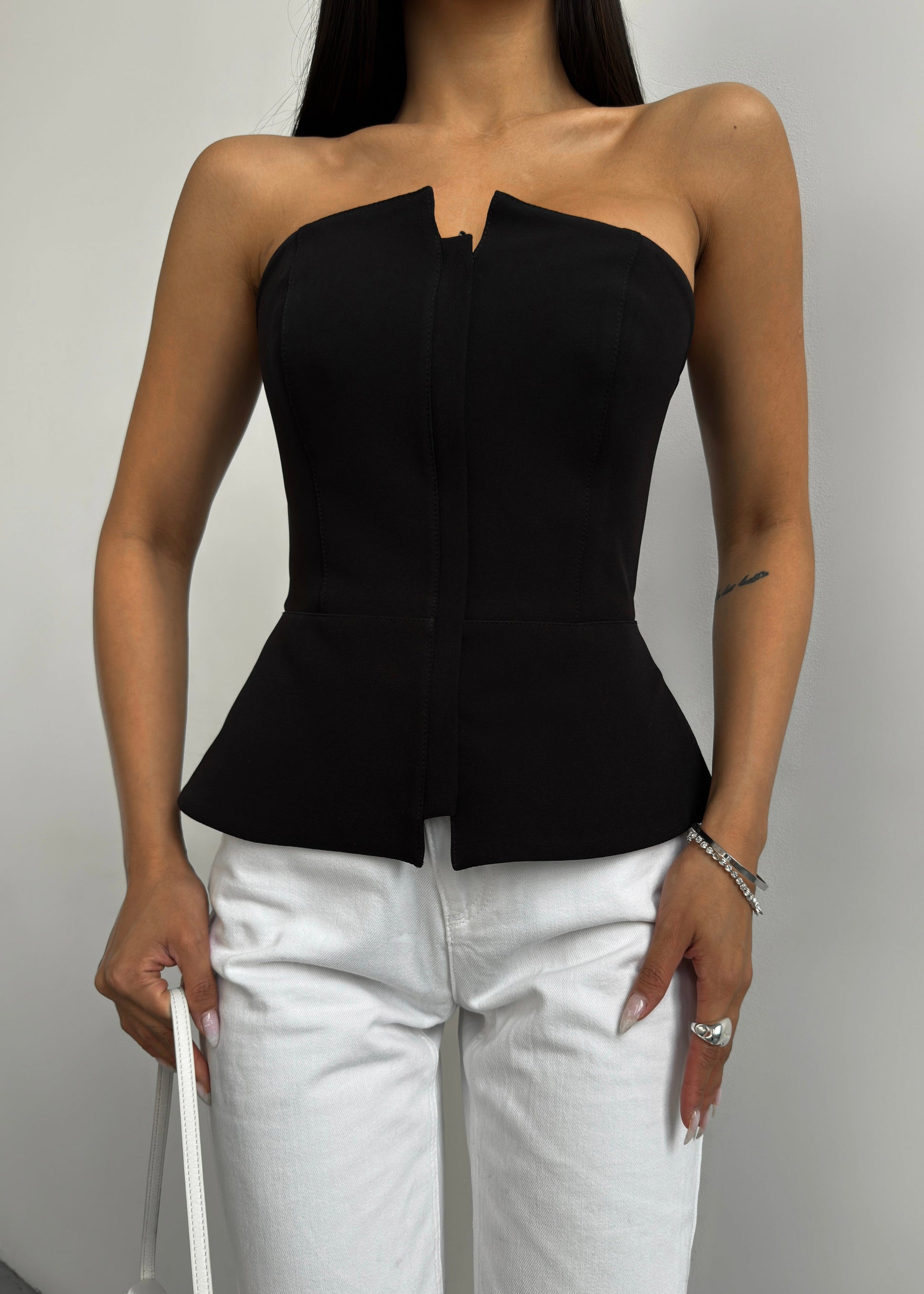 Корсет із костюмного крепу в чорному кольорі.