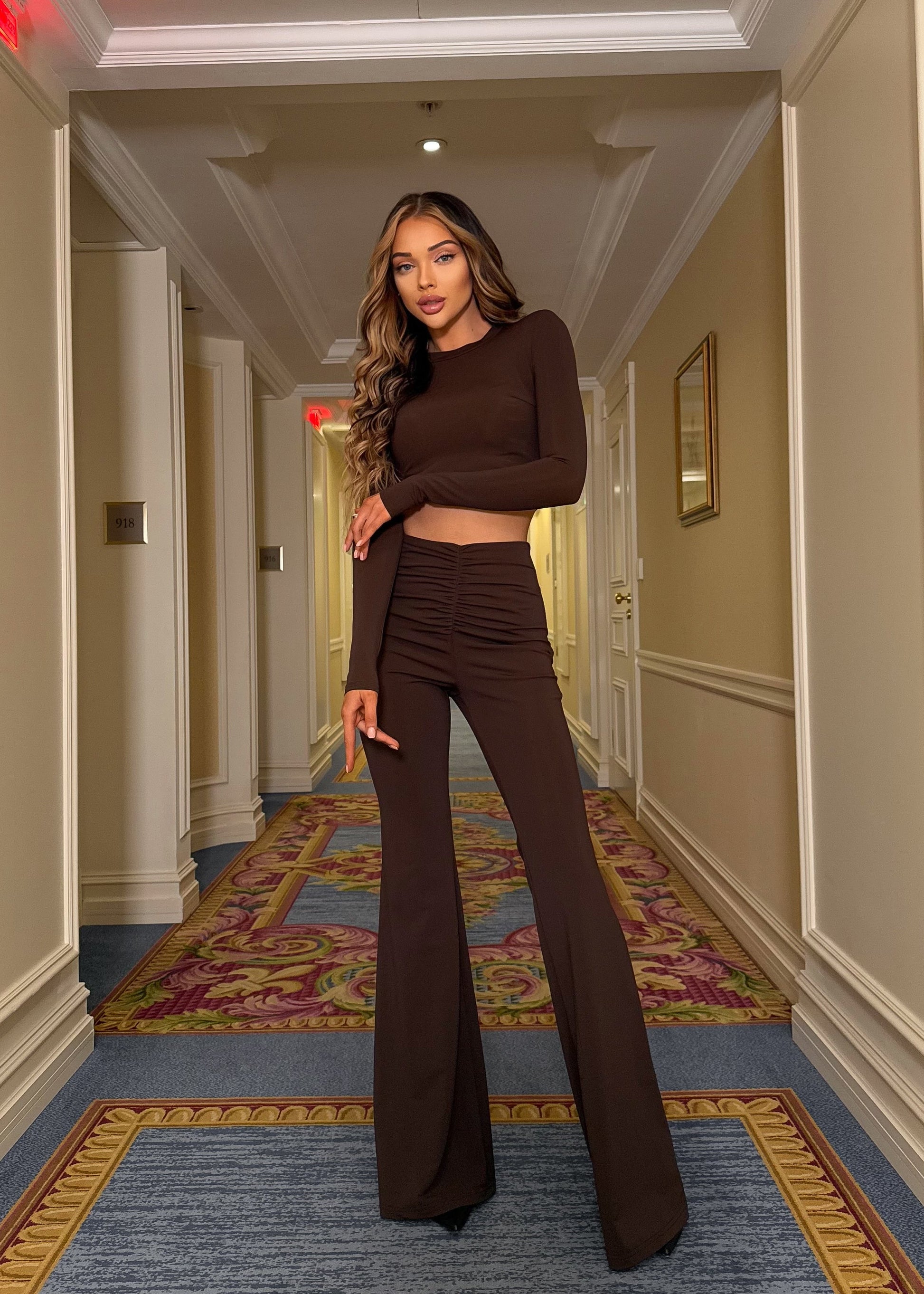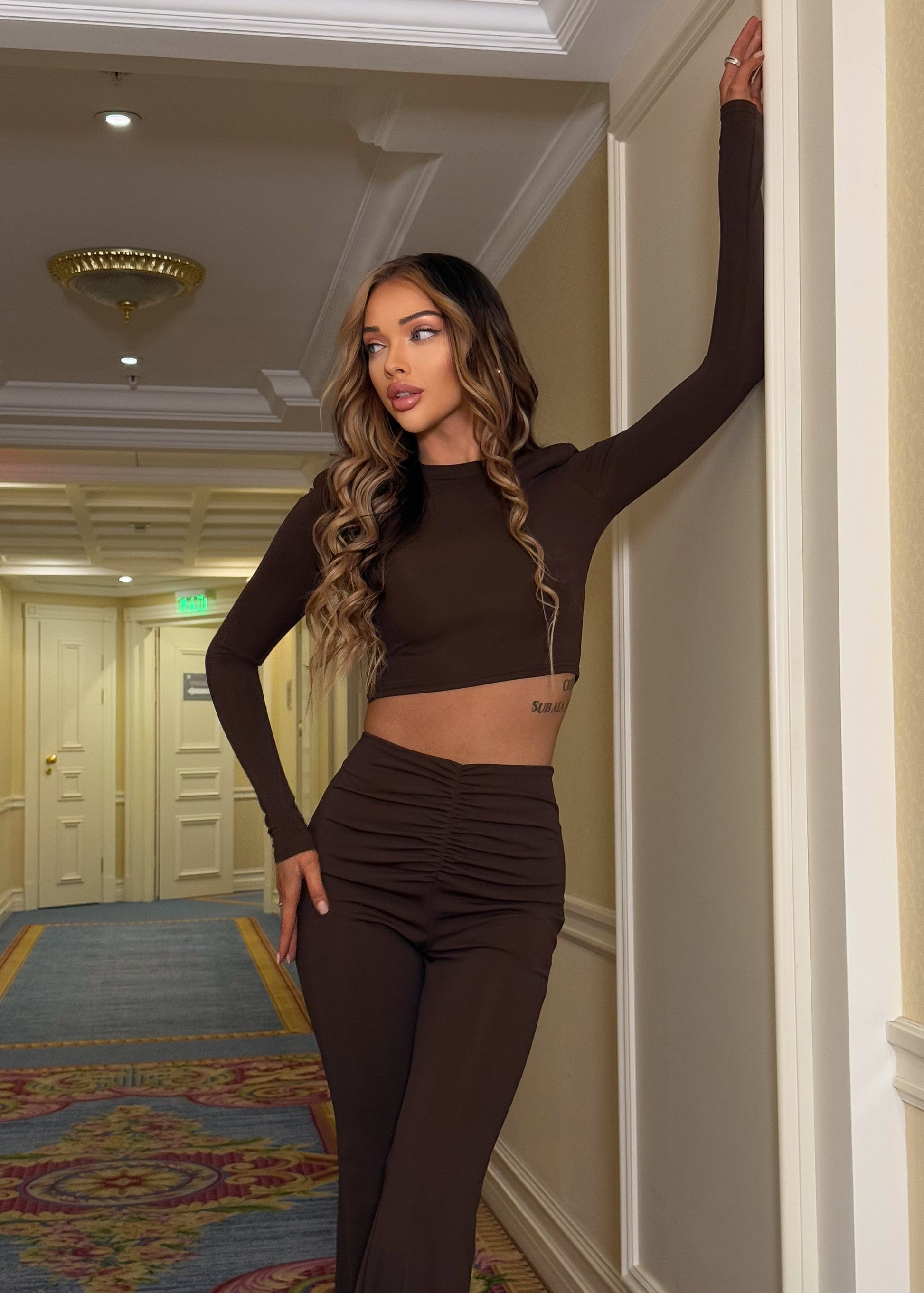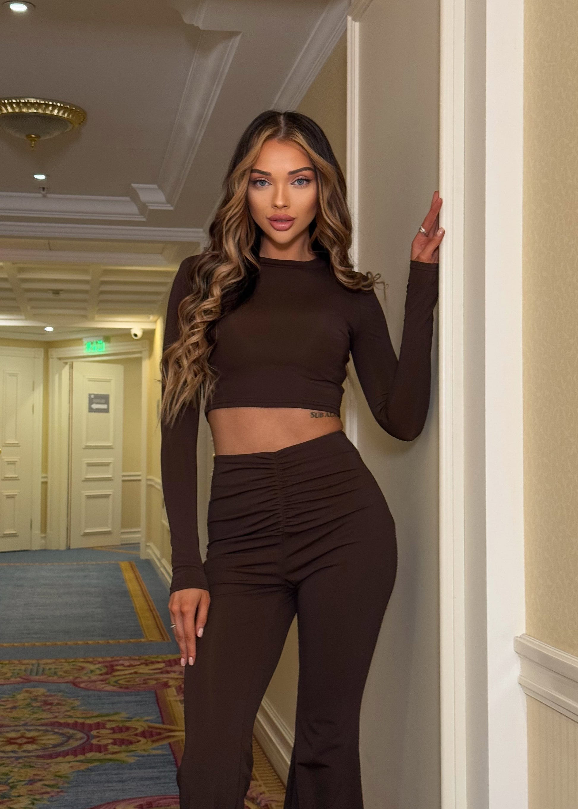 Вишуканий силуетний костюм. Укорочений топ із підплечниками красиво формує лінію плечей та додає образу структури. Штани високої посадки м’яко підкреслюють талію, а драпіровка спереду й ззаду створює витончений акцент. Кльош від колін надає легкого руху та візуально подовжує ноги. Стильний комплект, який бездоганно виділяє фігуру та виглядає святково навіть без зайвих деталей.