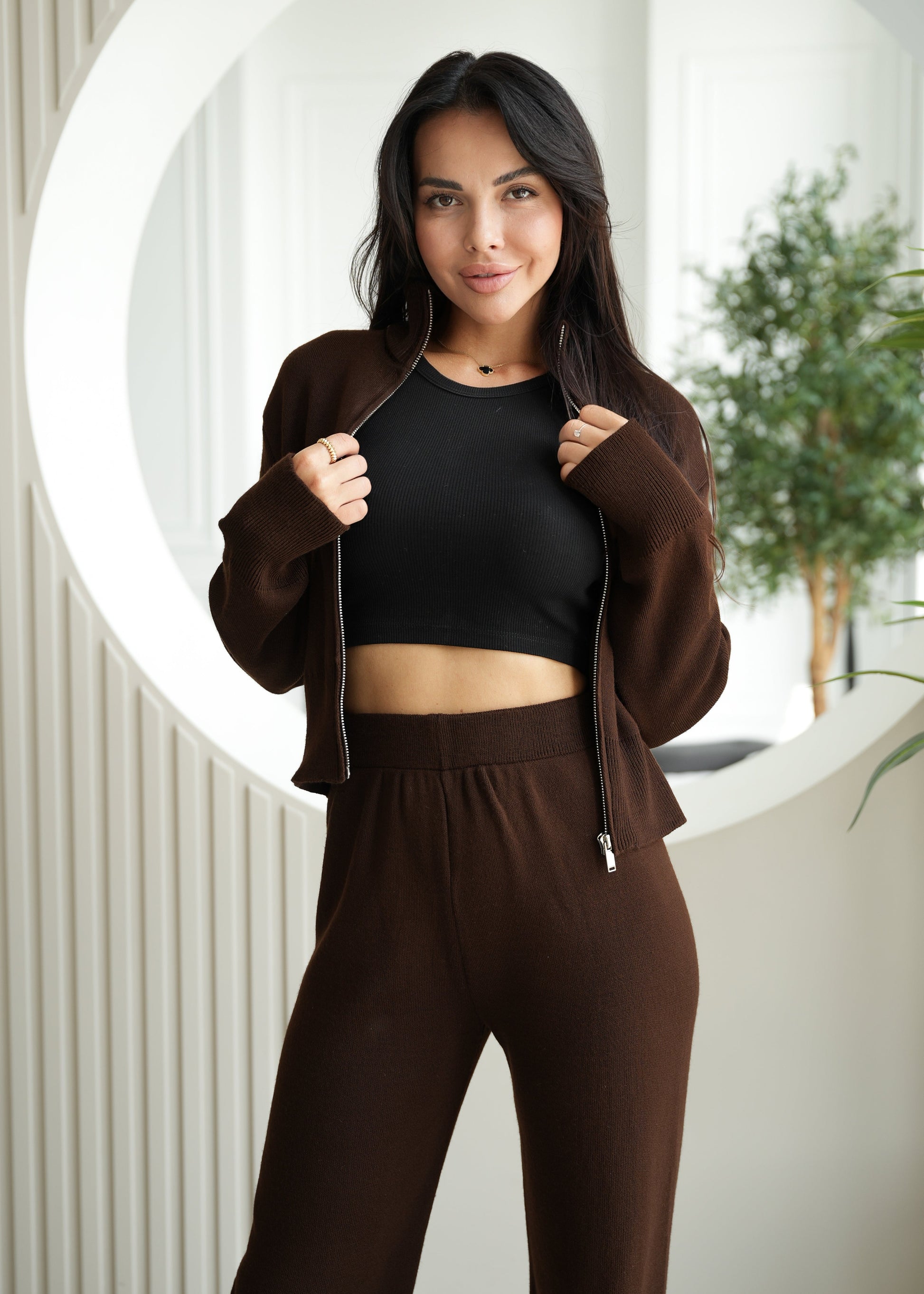 В’язаний костюм з вільною посадкою — комфортний та елегантний варіант для щоденних образів у мінімалістичному стилі. Складається з укороченої кофти на блискавці з довгими рукавами та акуратним коміром-стійкою, а також вільних штанів прямого крою на зручній високій посадці.