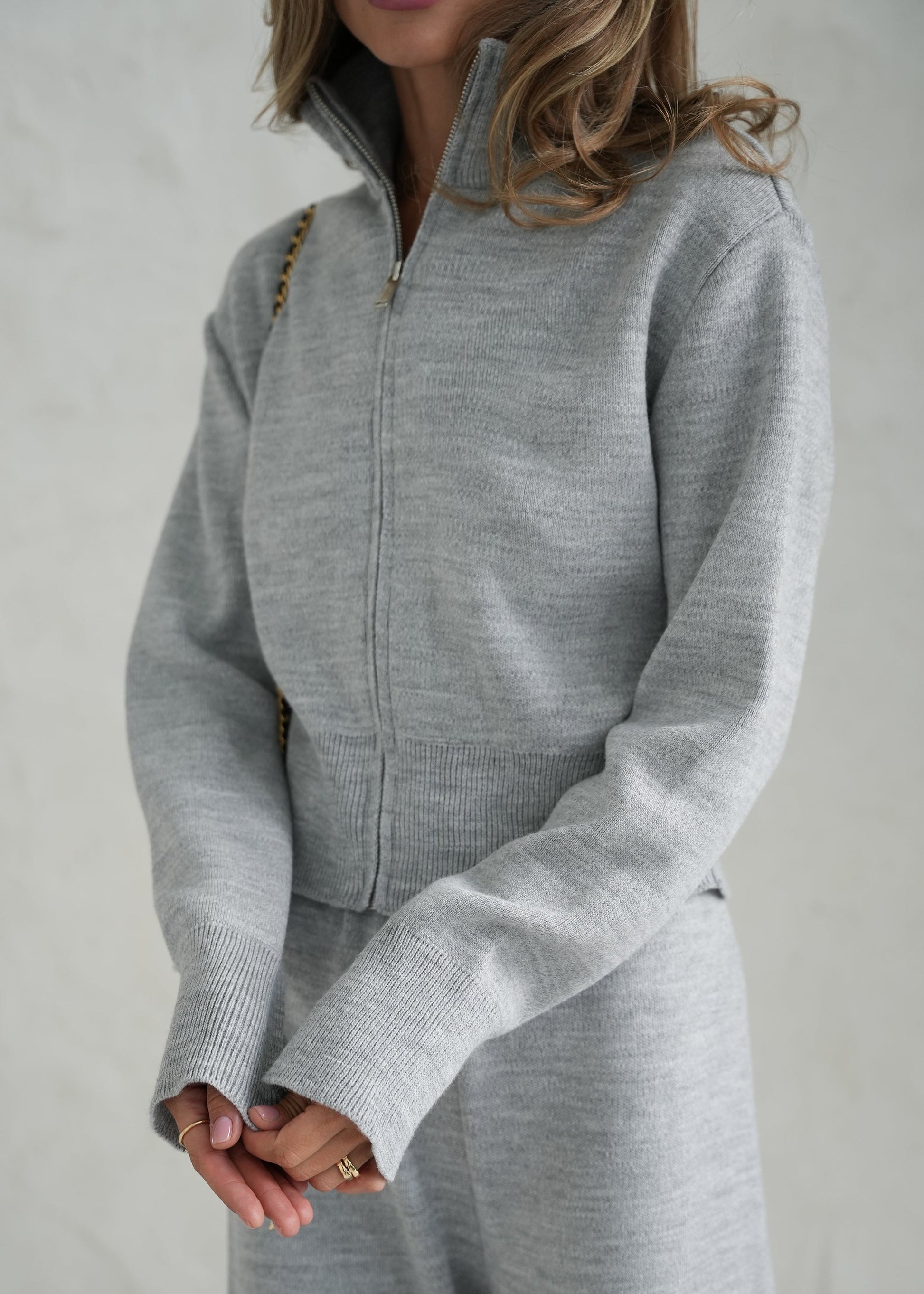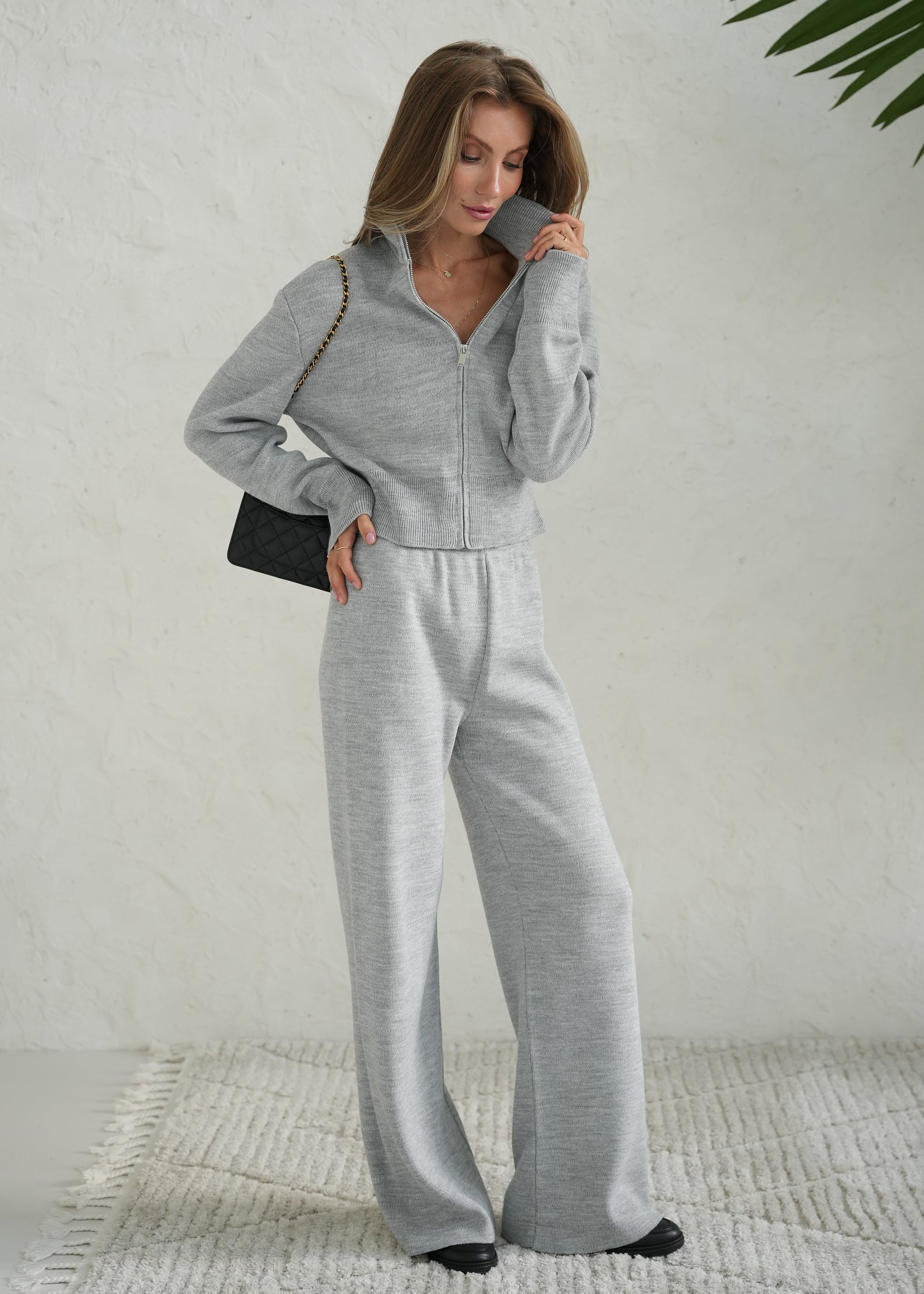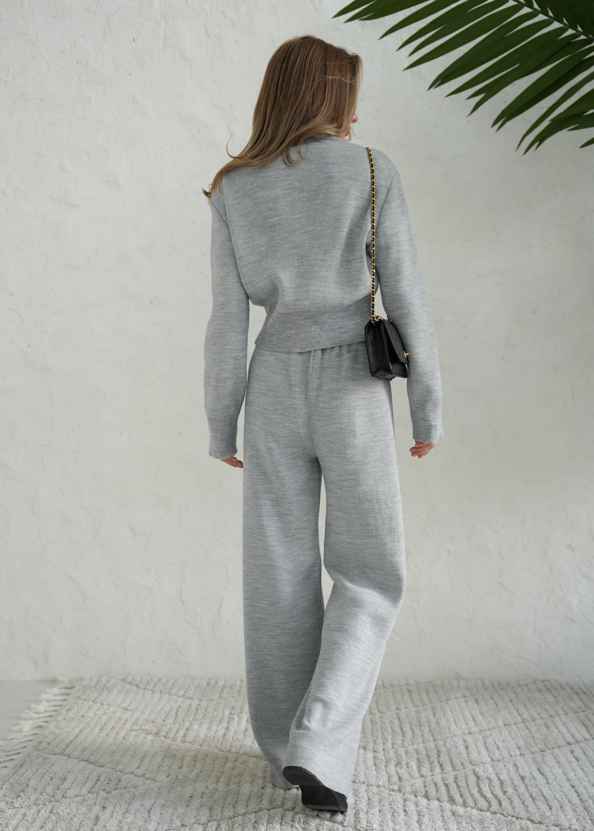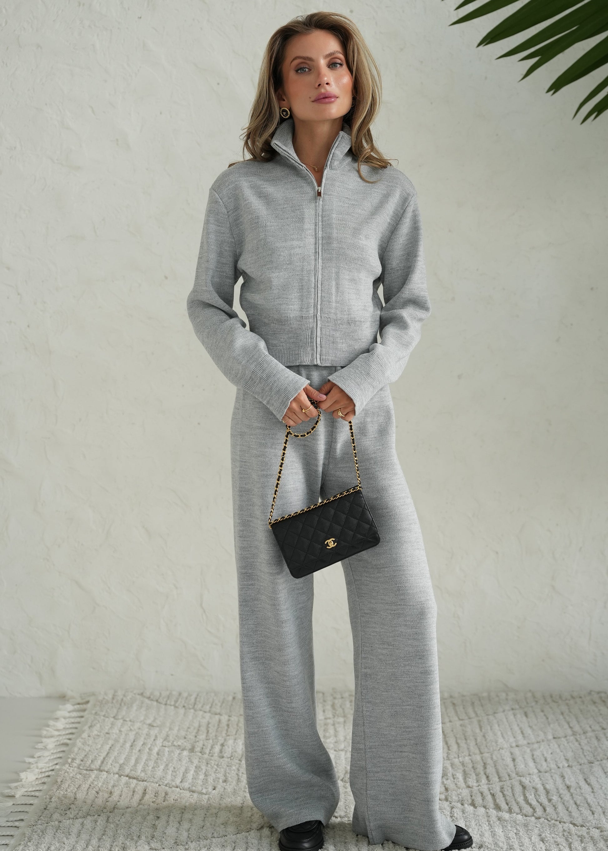 В’язаний костюм з вільною посадкою — комфортний та елегантний варіант для щоденних образів у мінімалістичному стилі. Складається з укороченої кофти на блискавці з довгими рукавами та акуратним коміром-стійкою, а також вільних штанів прямого крою на зручній високій посадці.