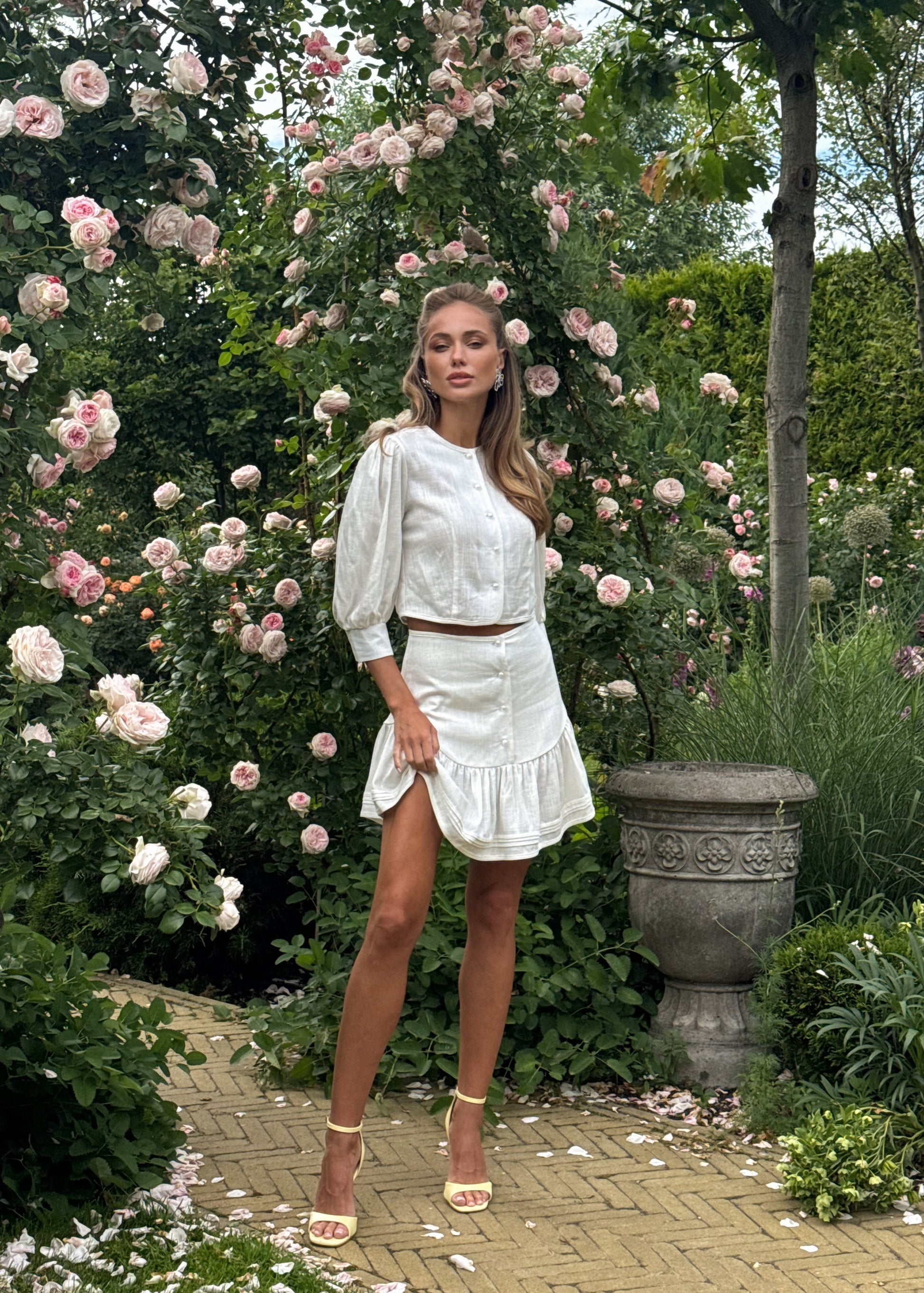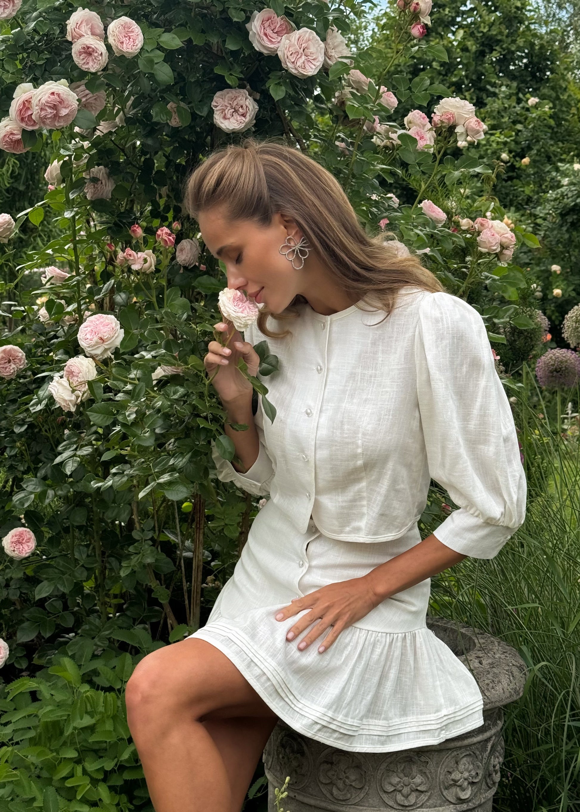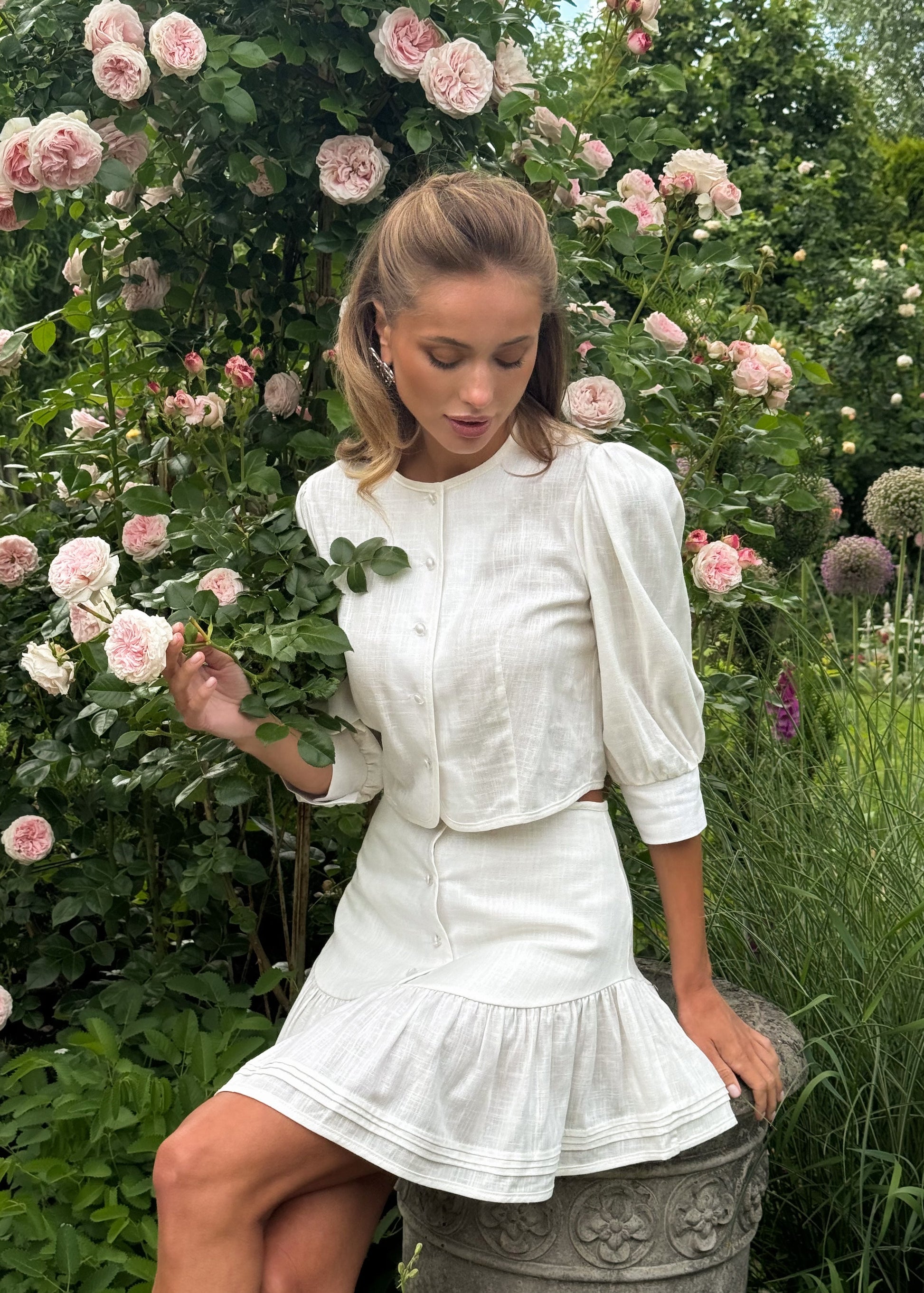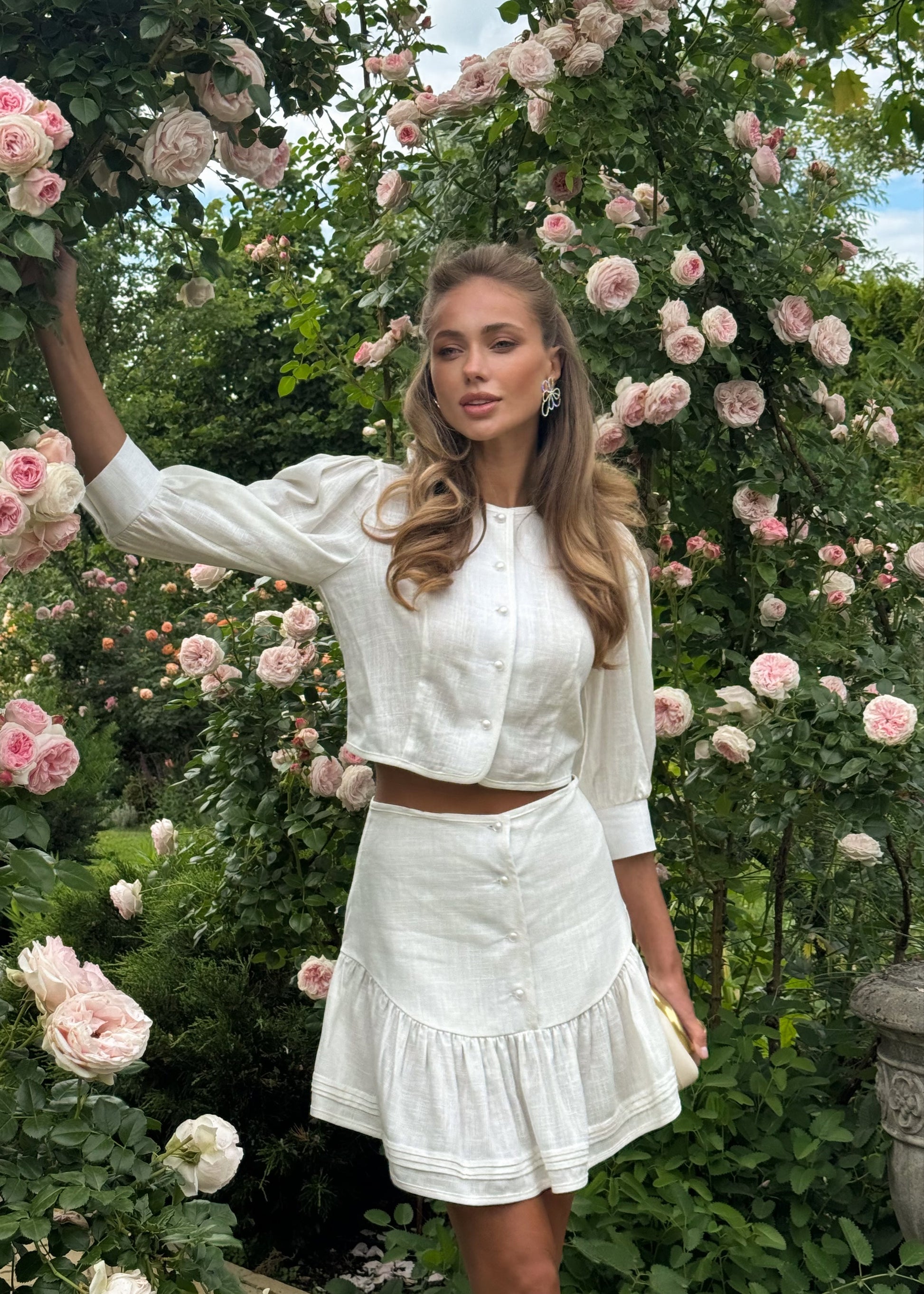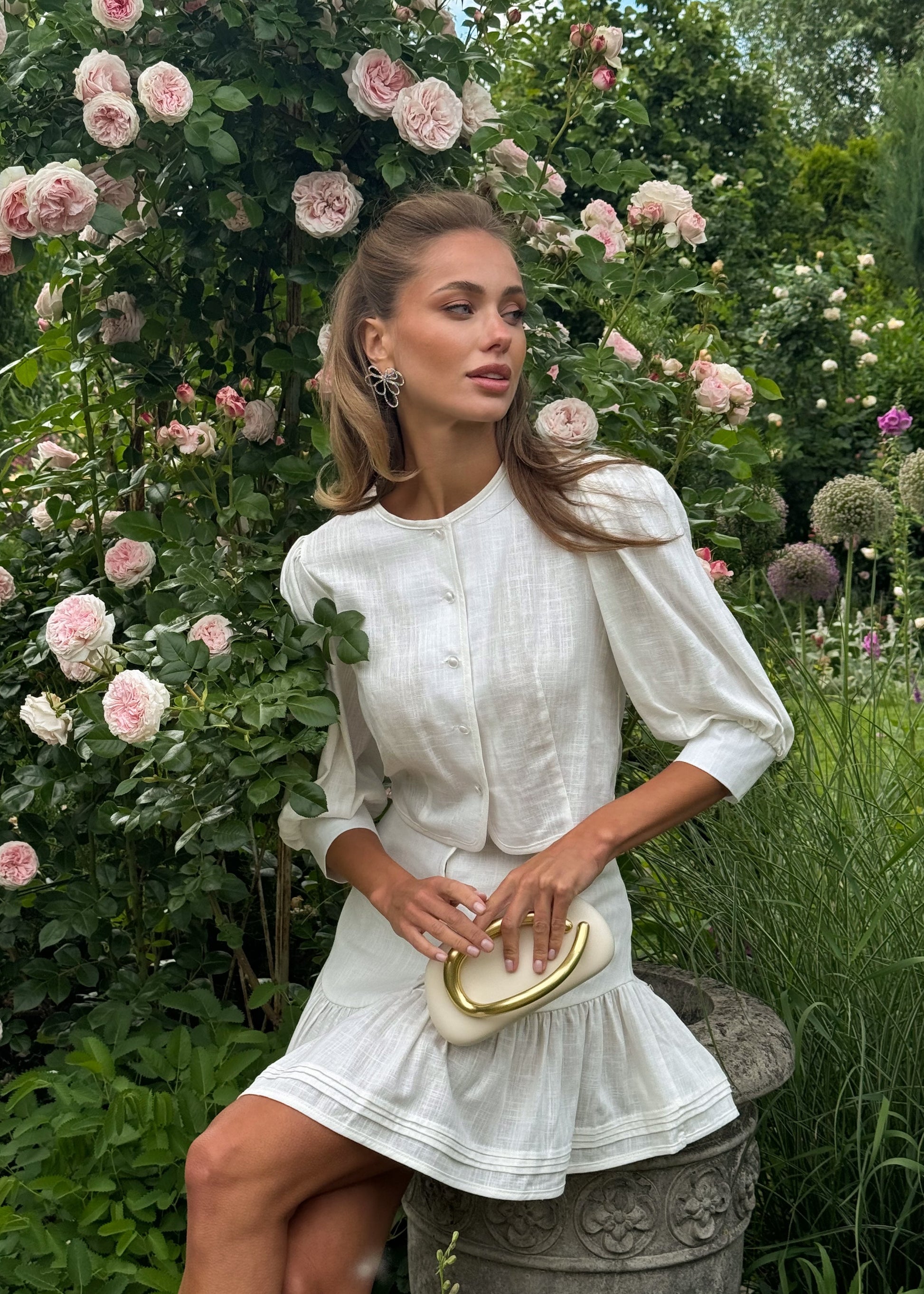 Сорочка з округлим вирізом і перлинними ґудзиками створює лінію чистоти й світла. Об’ємні рукави додають витонченості, а спідниця з воланом зберігає відчуття легкості.