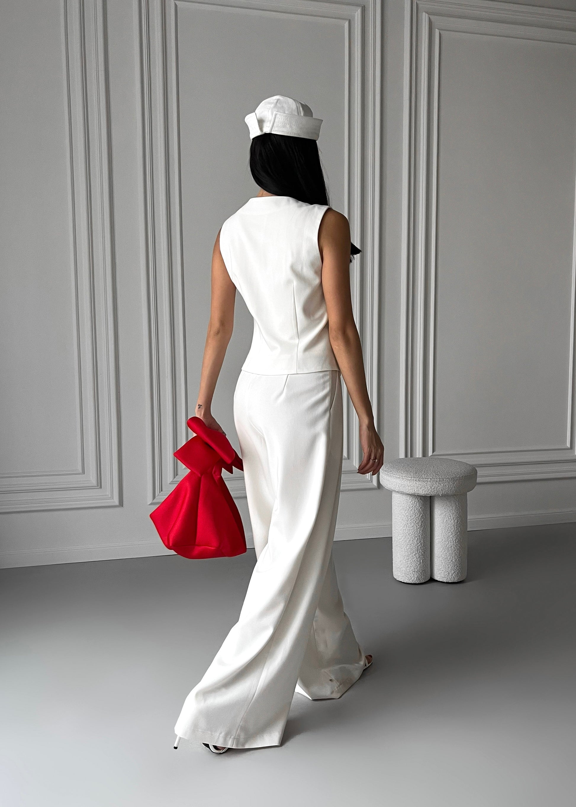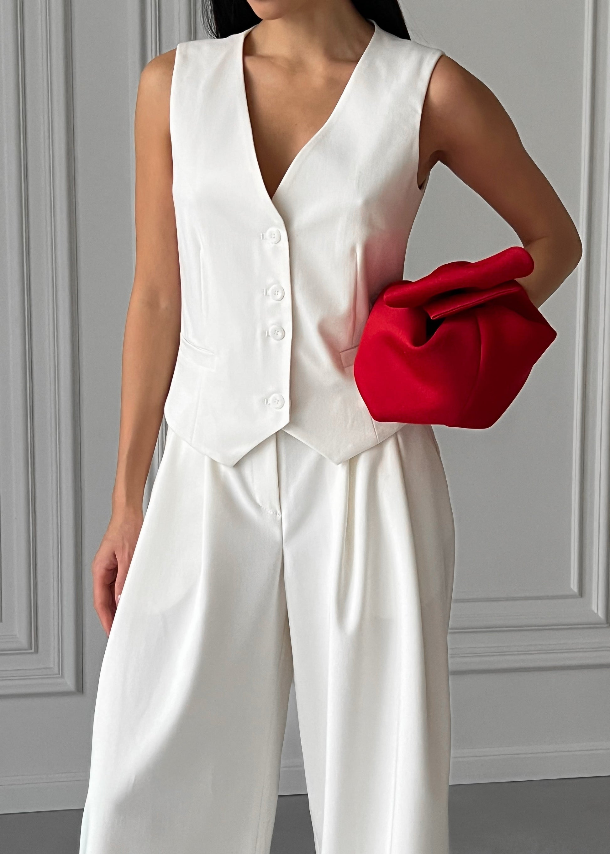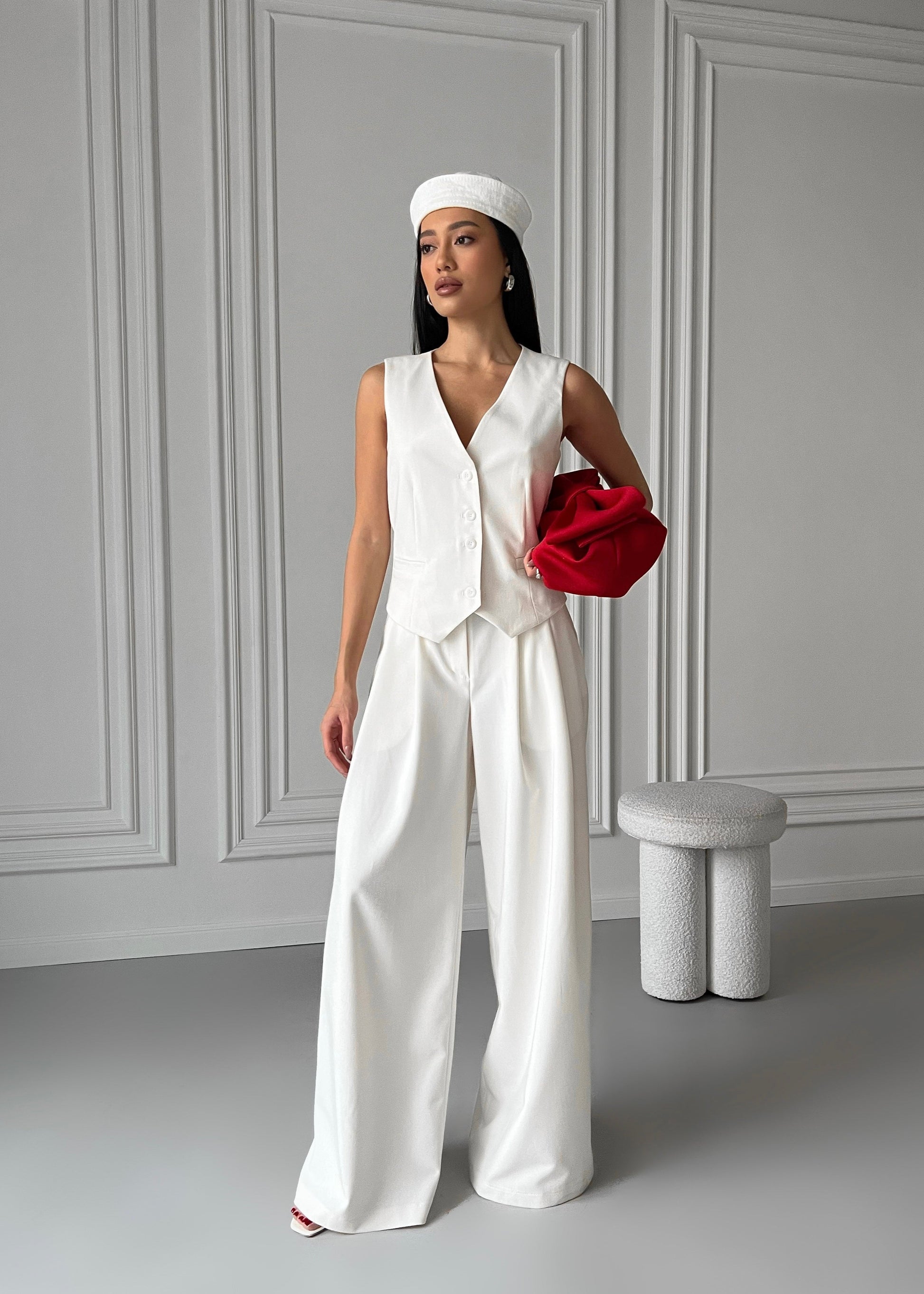 Жилет приталеного крою позначає талію, а штани-палаццо додають простору та руху. Цей дует працює як цілісний образ або як база для власних комбінацій — стримано, впевнено, по-новому.
