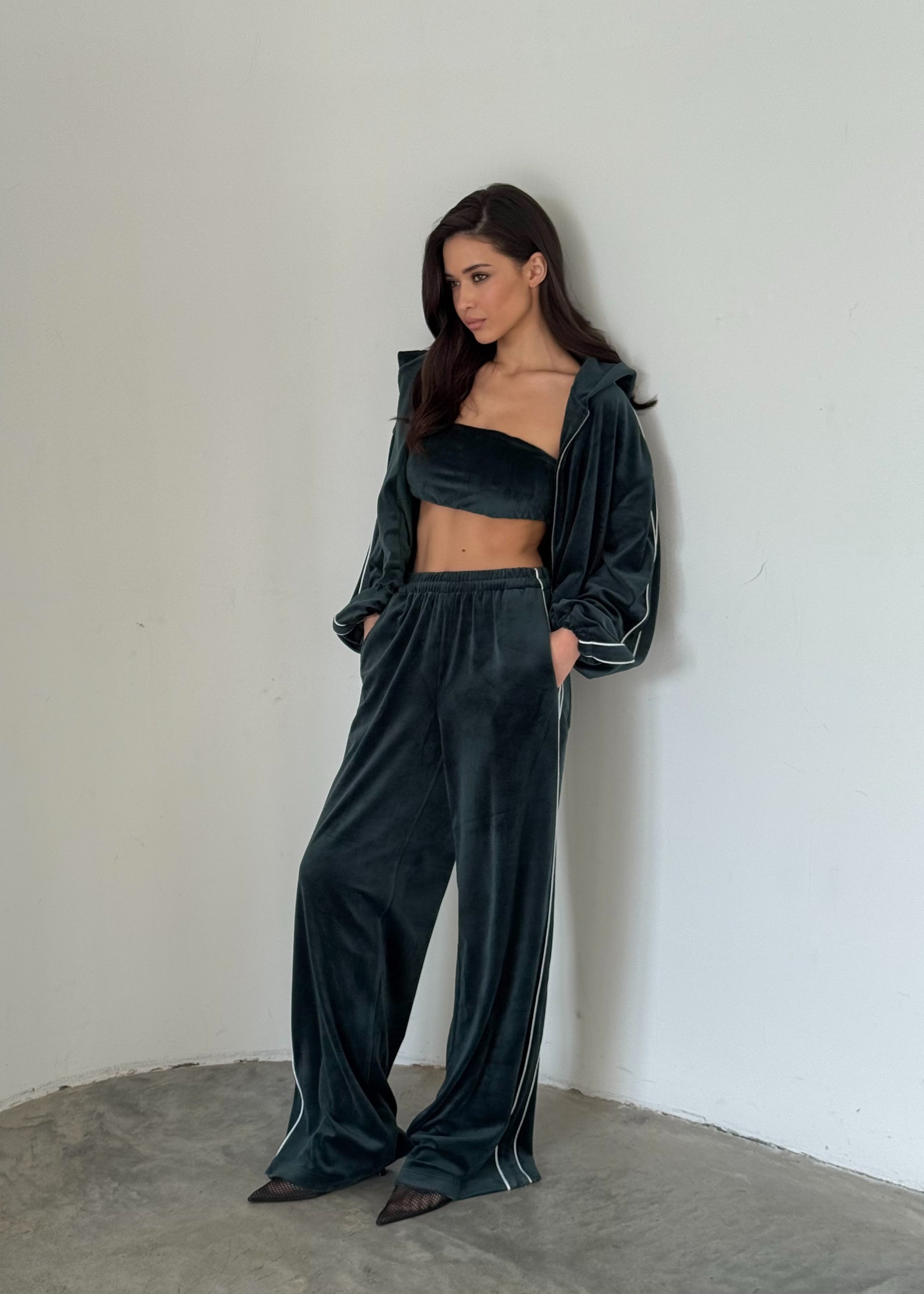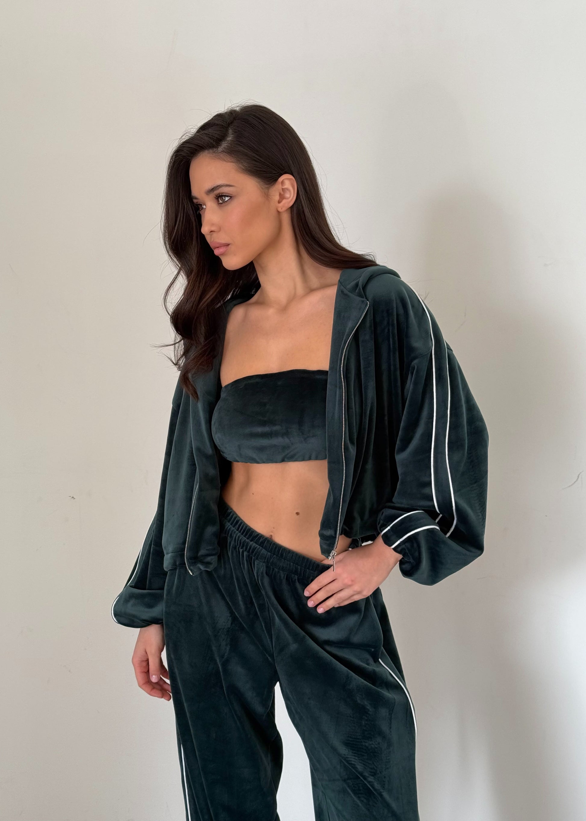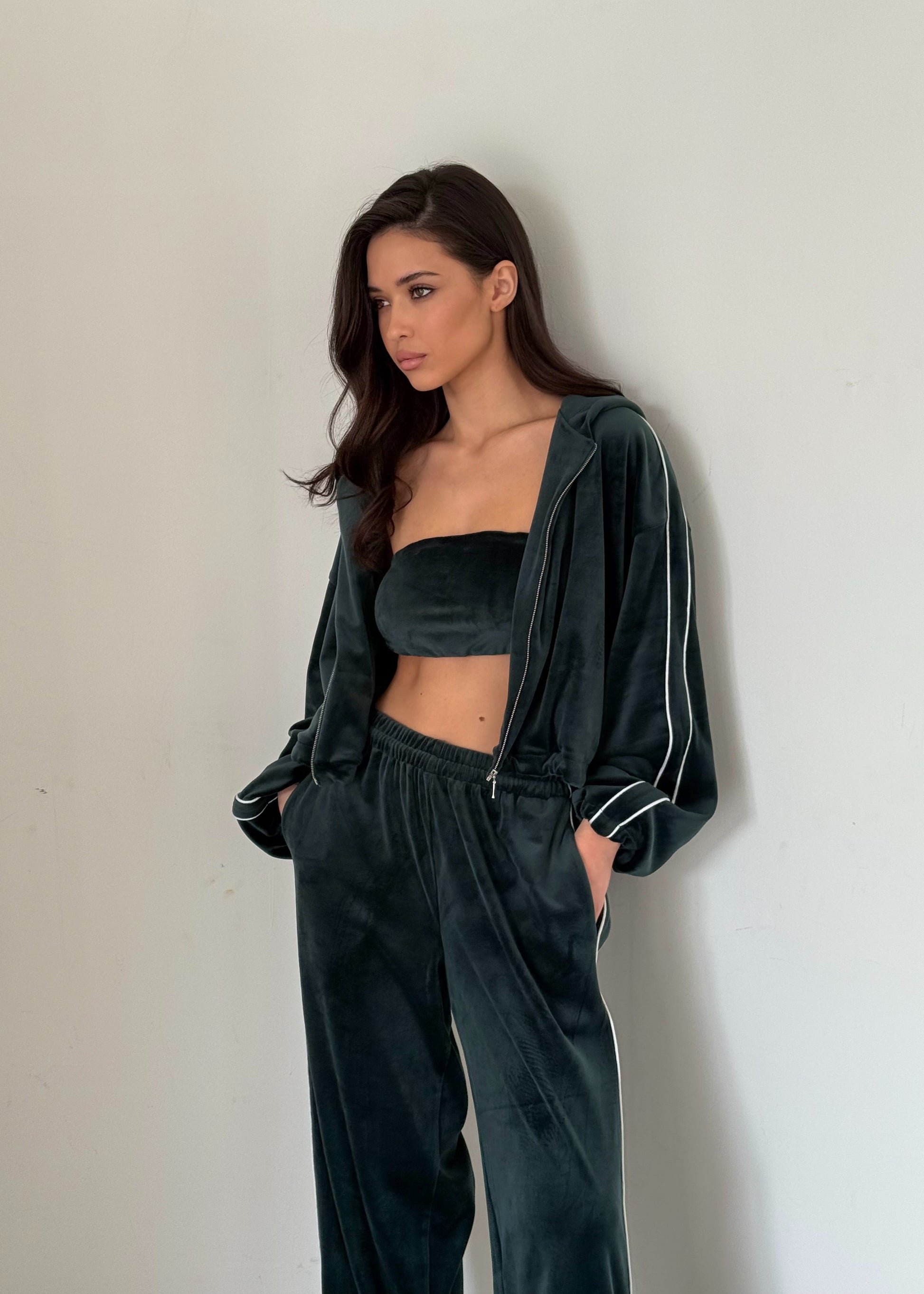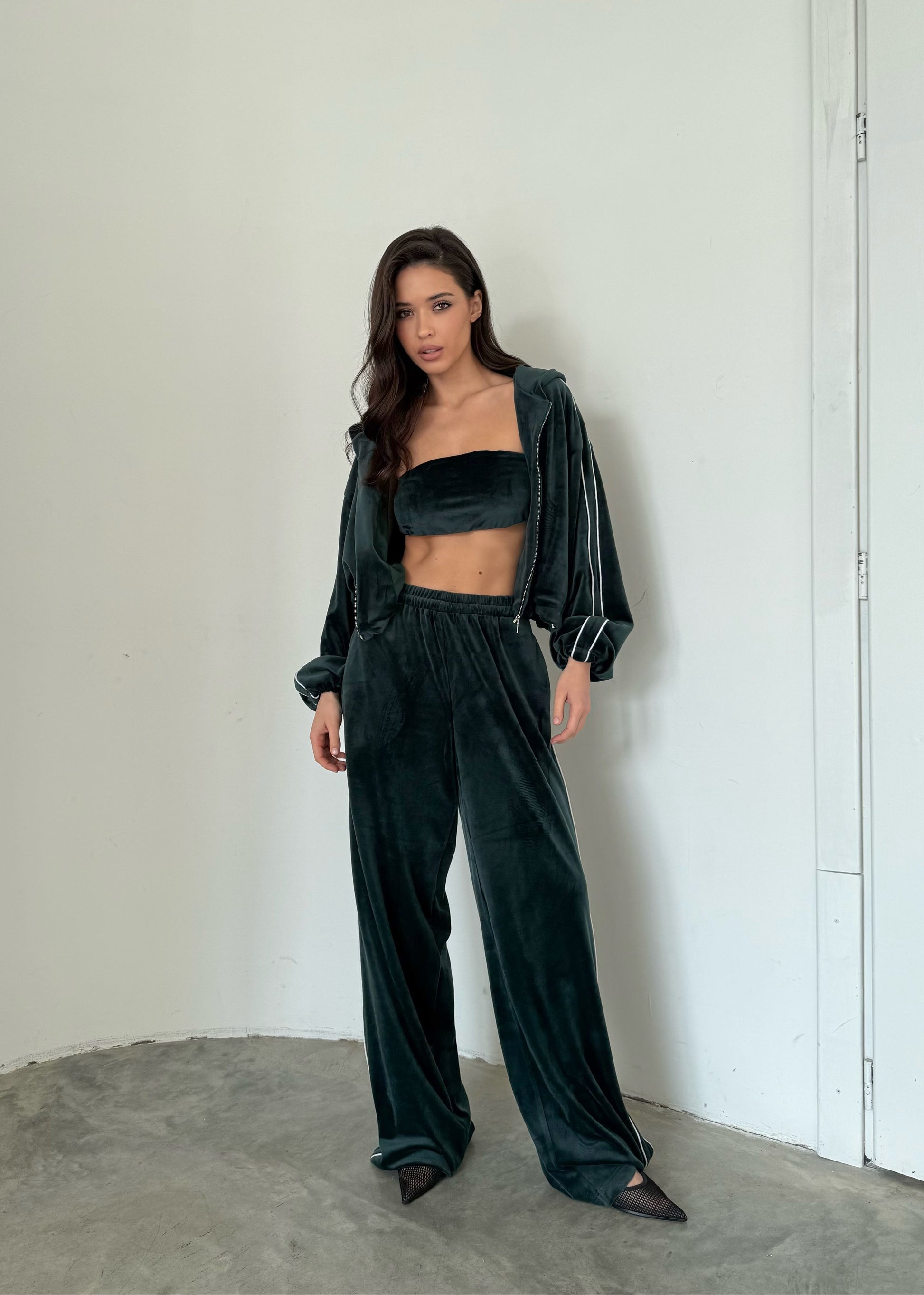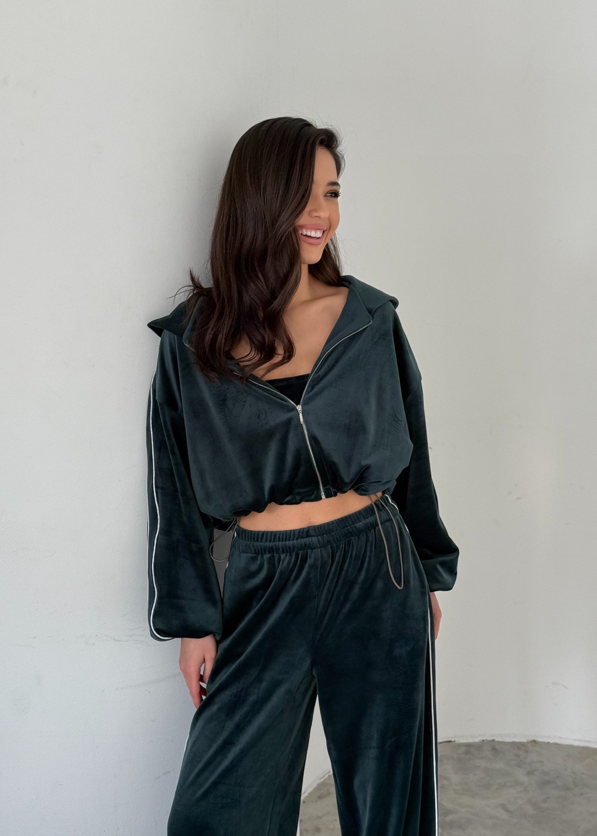 Вишуканий баланс між комфортом і елегантністю. Костюм із м’якого велюрового трикотажу складається з кроп-топа, вільних штанів і об’ємної кофти на блискавці. Глибокий, насичений відтінок та ледь відблискуюча текстура тканини створюють образ розкоші без зусиль.