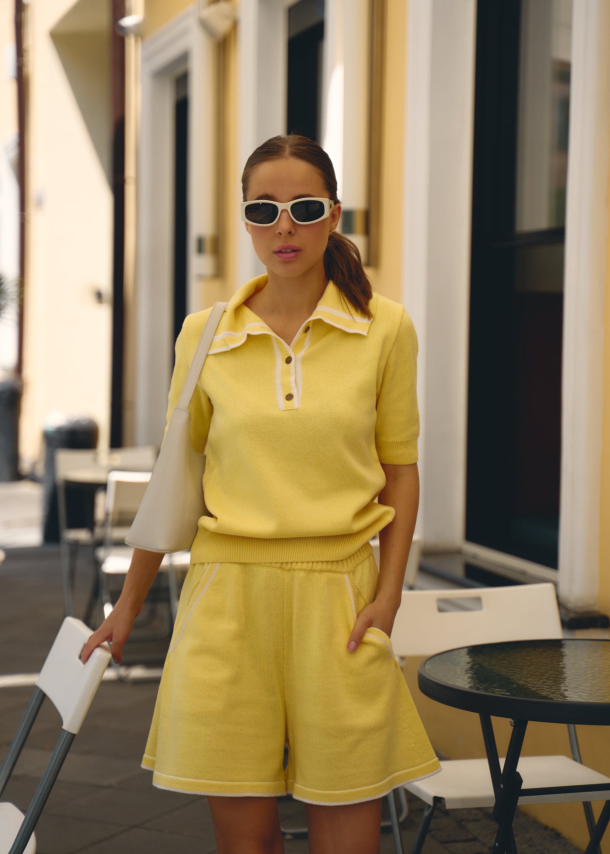 Футболка-поло з класичним коміром і шорти прямого крою — мʼякі, комфортні, дихаючі. Акцентні контрастні смужки додають ритму — мінімальний жест, що привертає увагу.