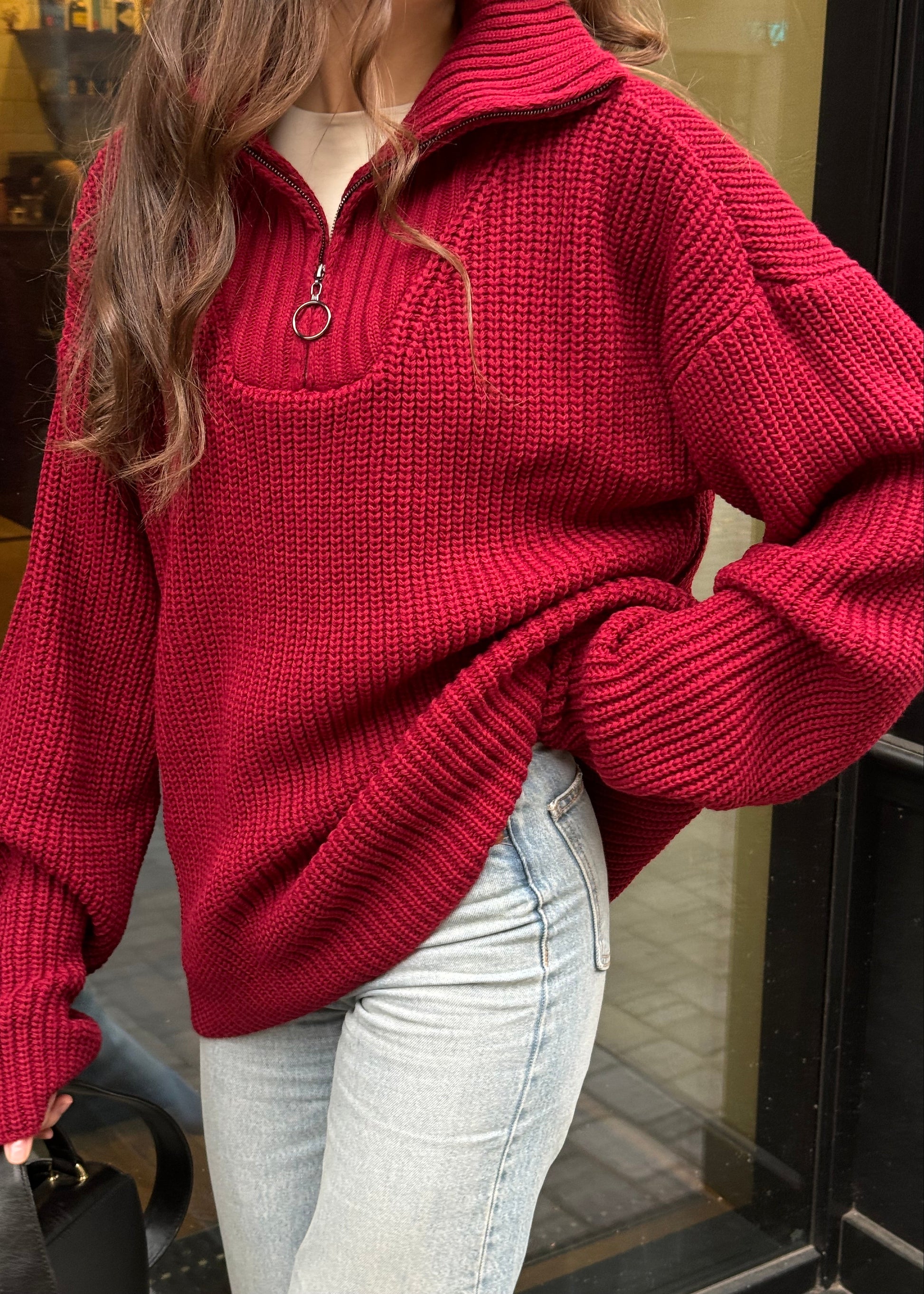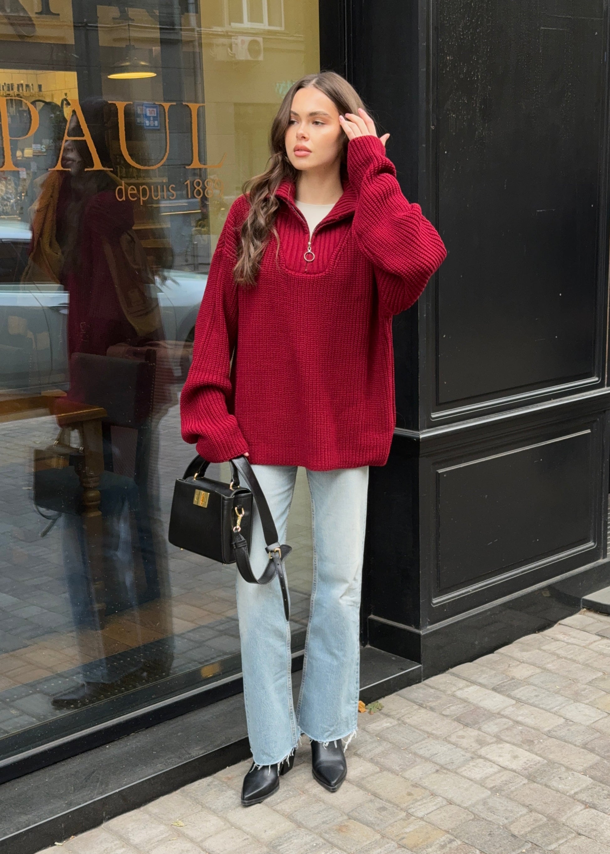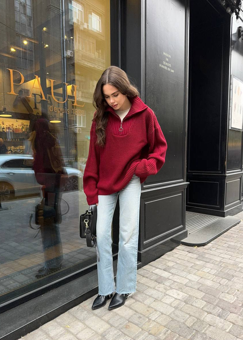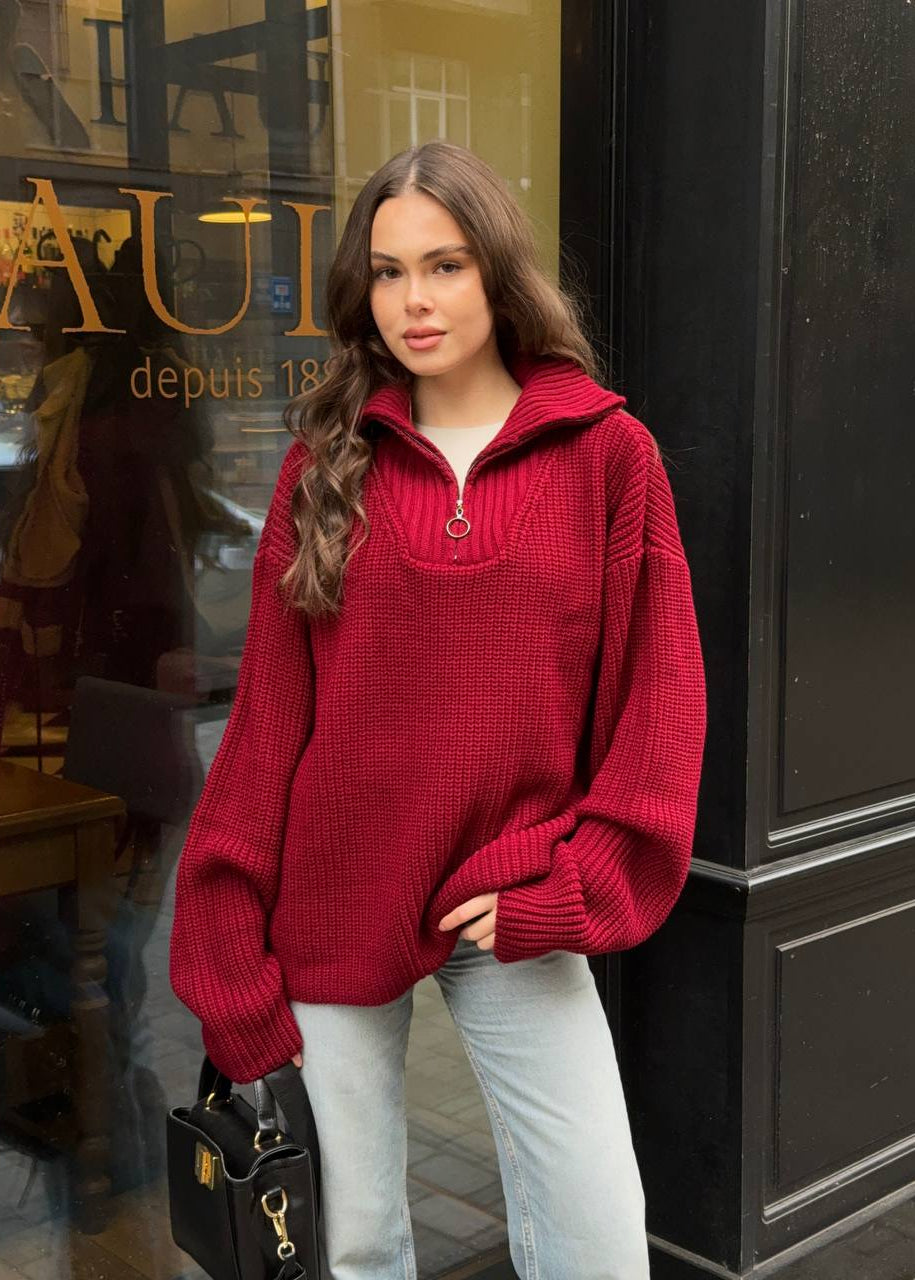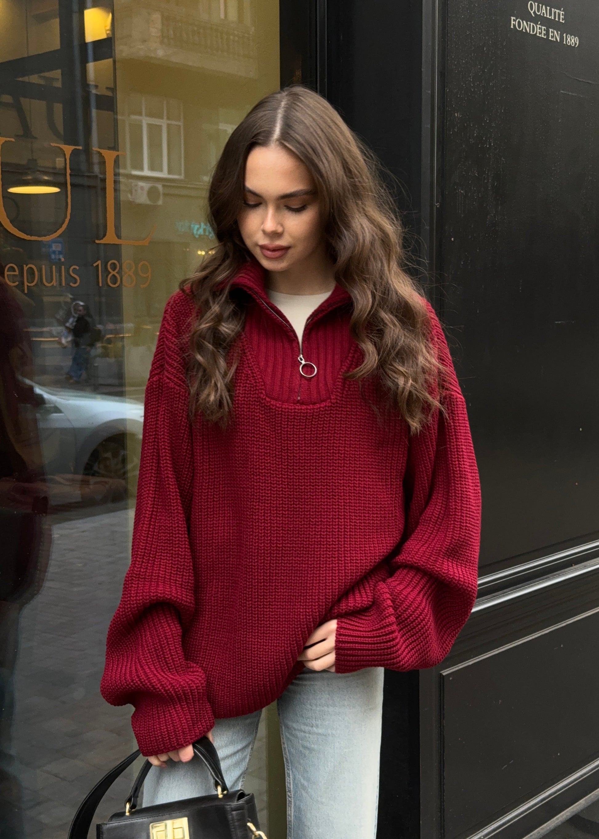 Об’ємна фактурна в’язка у глибокому винному відтінку створює стильний акцент у будь-якому образі. Комір-поло на блискавці дозволяє варіювати глибину вирізу — від спортивної невимушеності до більш елегантного настрою. Вільний крій додає комфорту та виглядає гармонійно як у тандемі з міні-спідницею та високими чоботами, так і з широкими брюками чи джинсами.