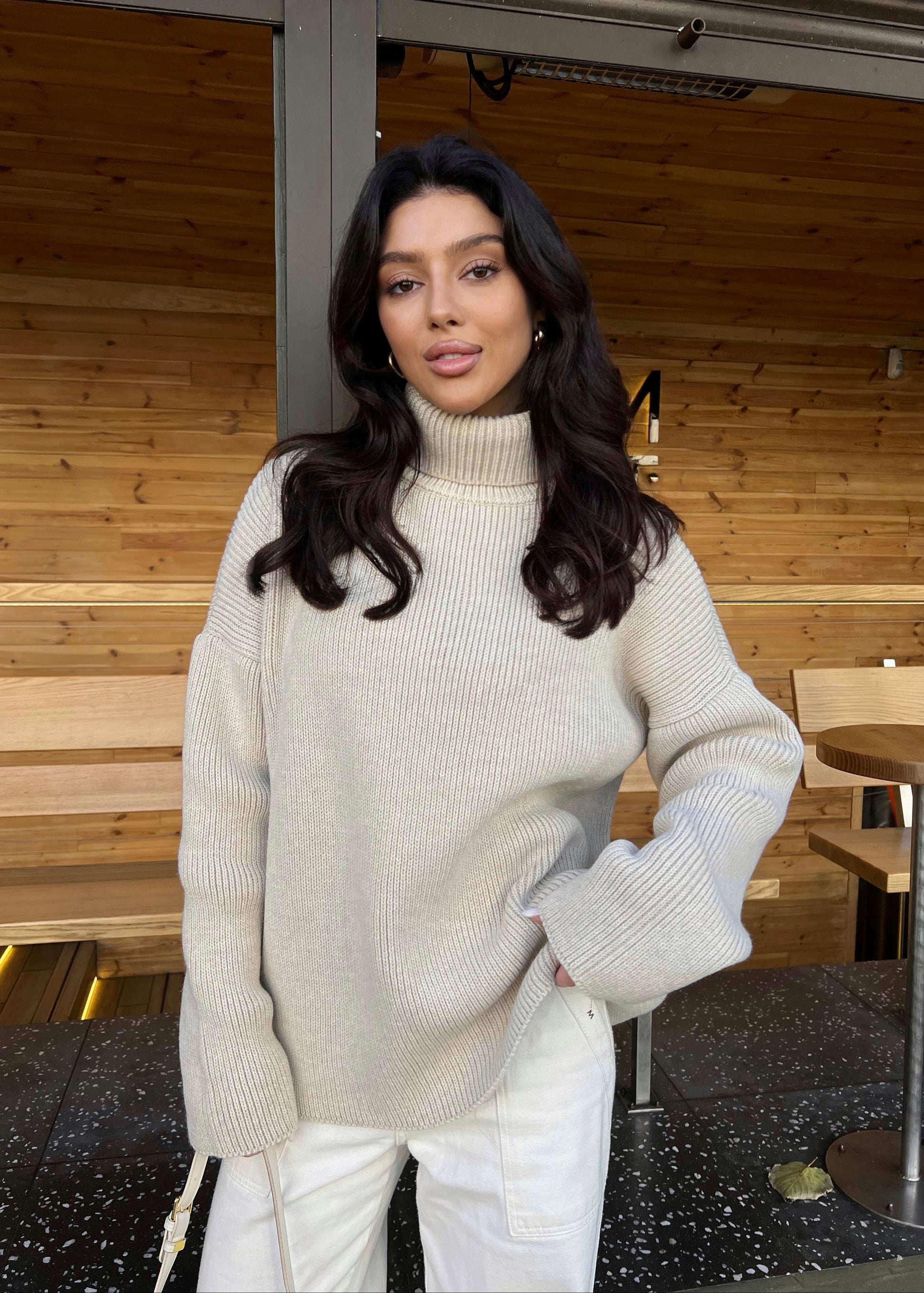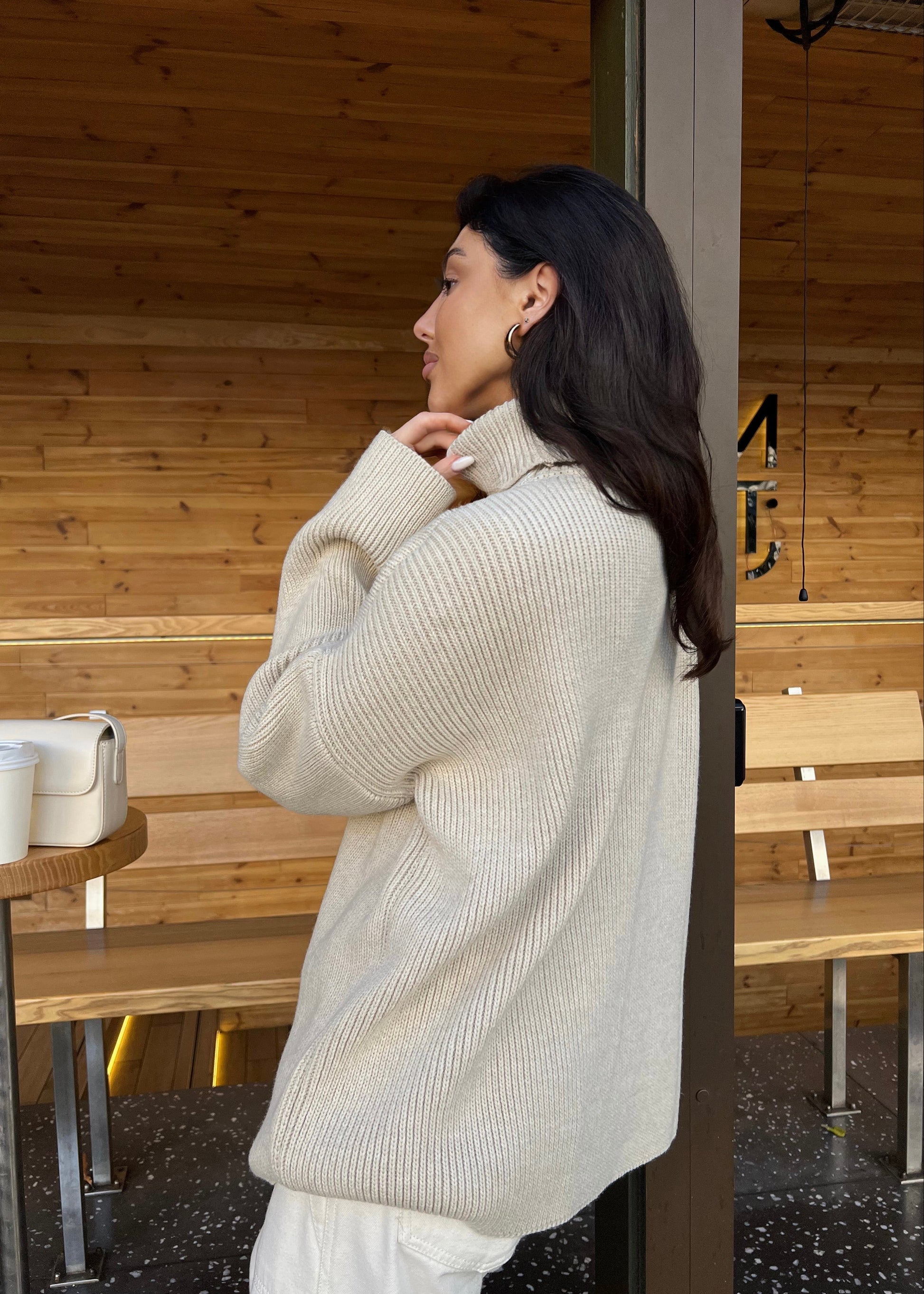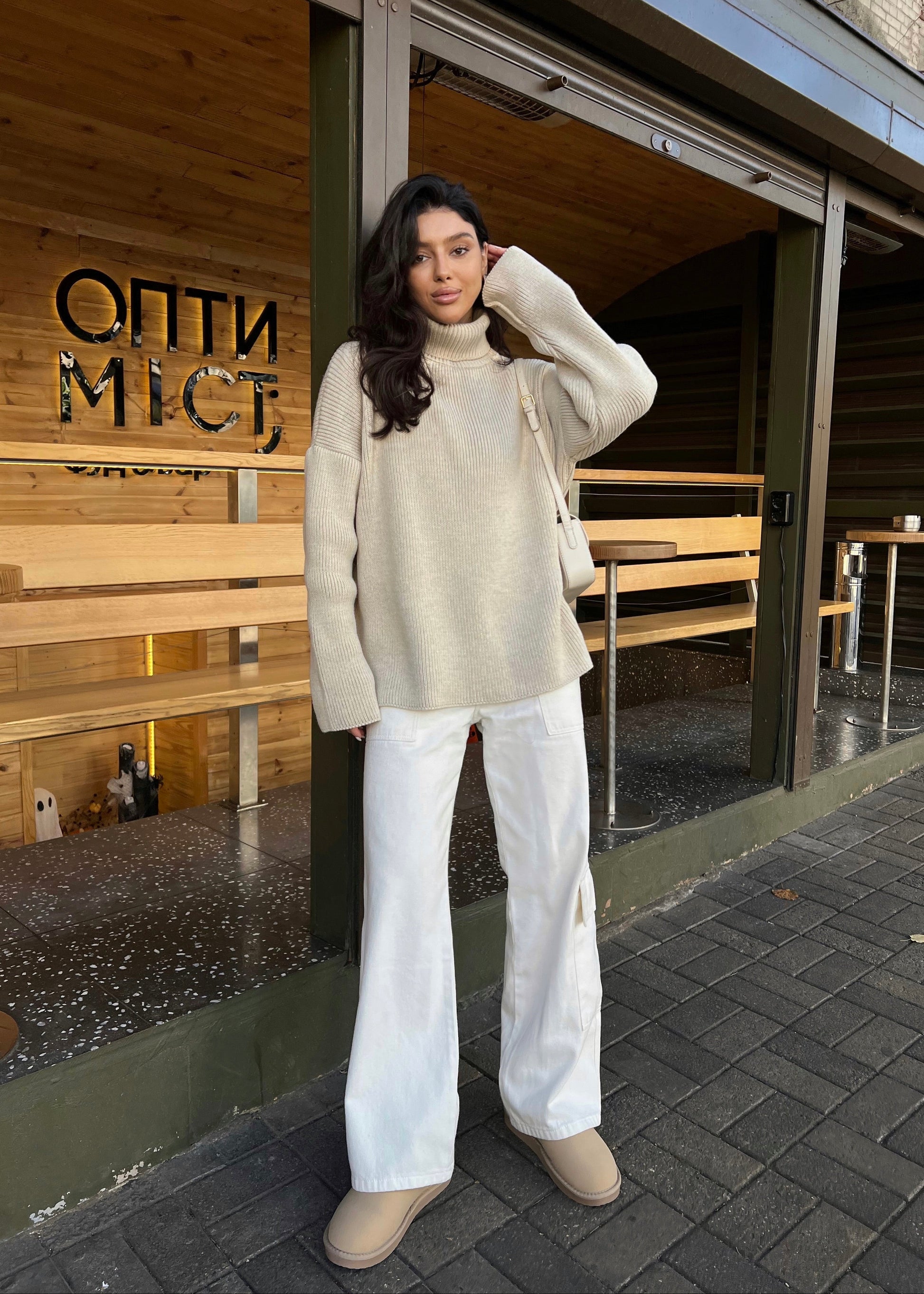 Модель має вільний крій, занижену лінію плеча та об’ємний комір-гольф, який м’яко облягає шию. Подовжений силует дозволяє комбінувати светр із джинсами, спідницями чи легінсами — для створення стильного, але невимушеного образу.