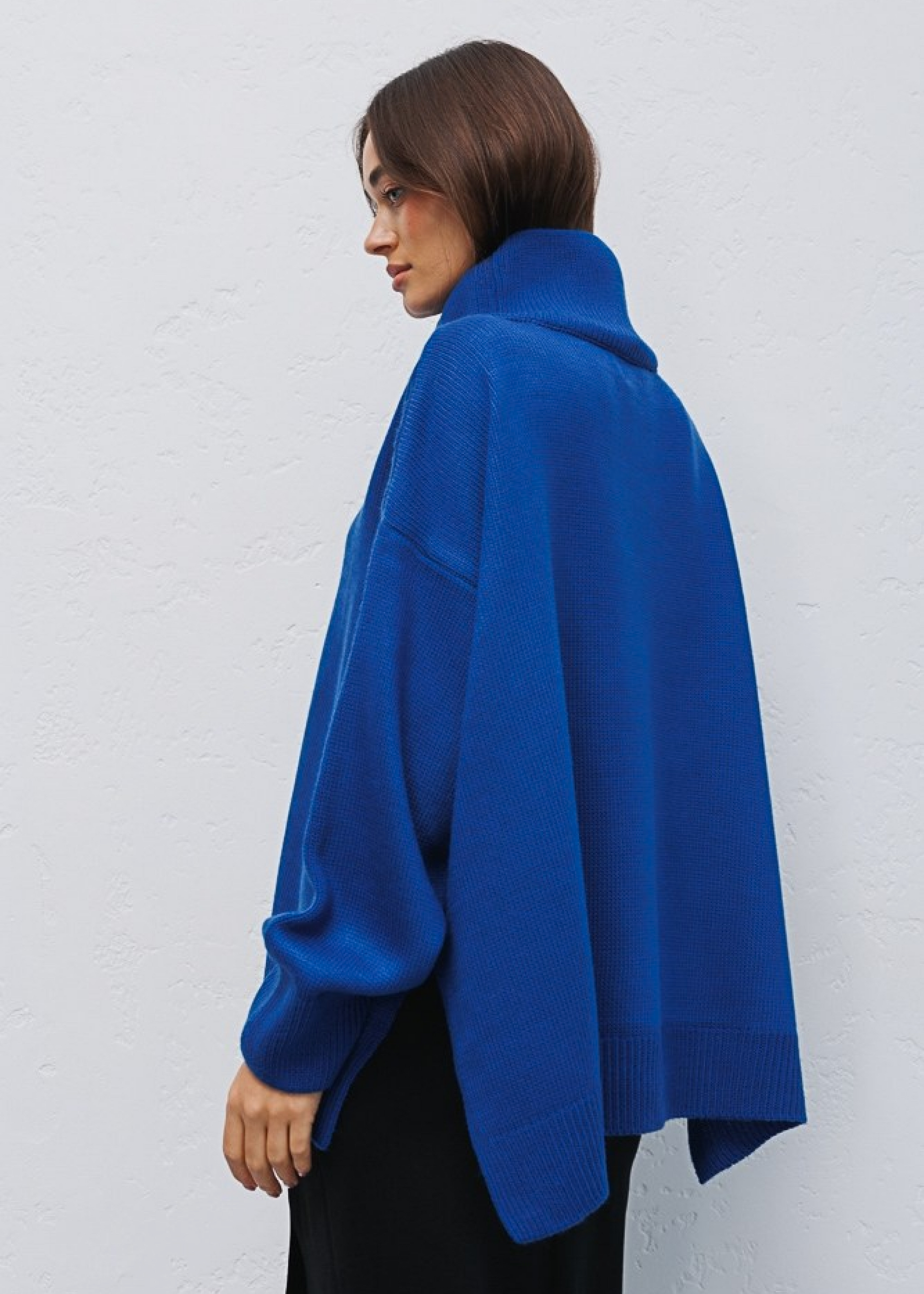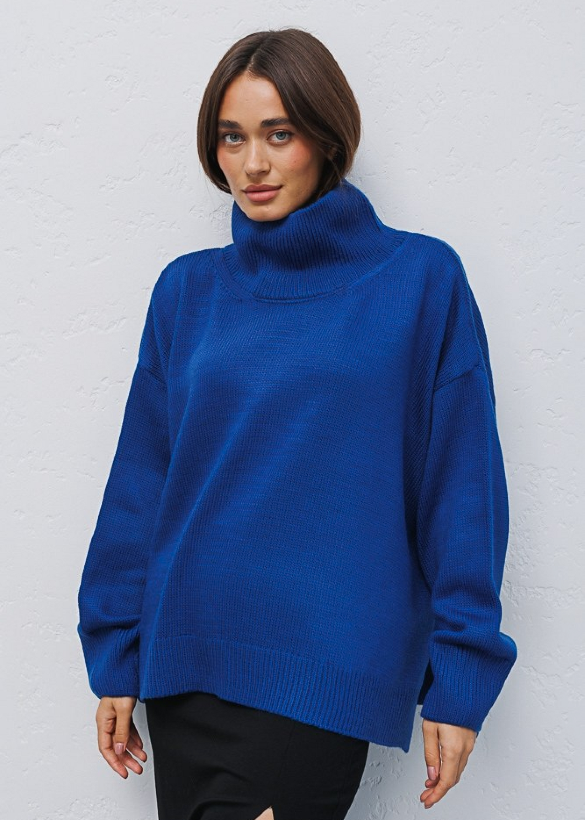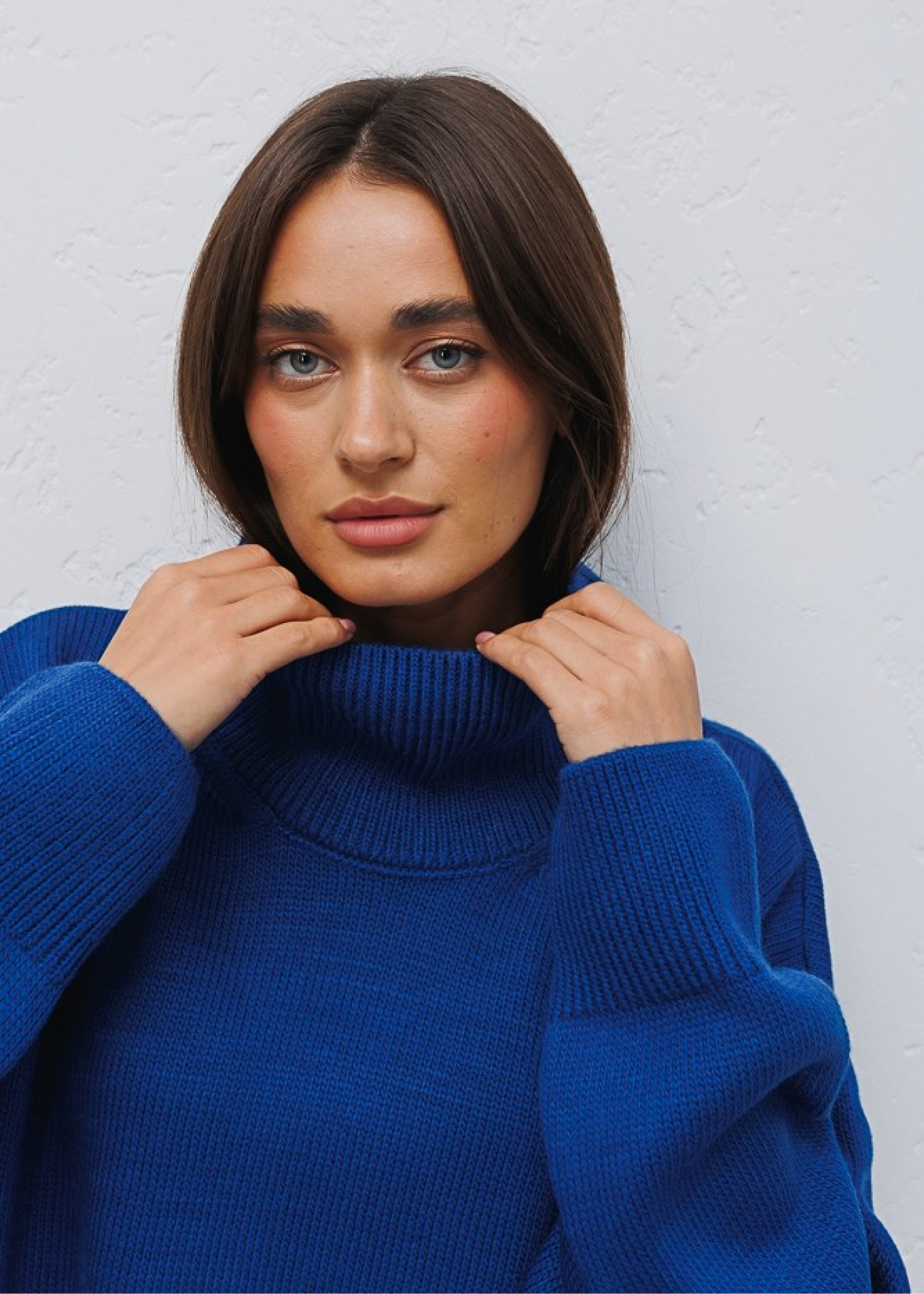 Затишний oversize светр з м’якої пряжі. Стильний об’ємний светр глибокого відтінку електрик — акцентна річ, яка поєднує комфорт і мінімалізм. Виготовлений із м’якої трикотажної пряжі, цей светр має вільний крій, спущену лінію плеча та широкий комір, який можна носити як стоячи, так і м’яко відвернувши.