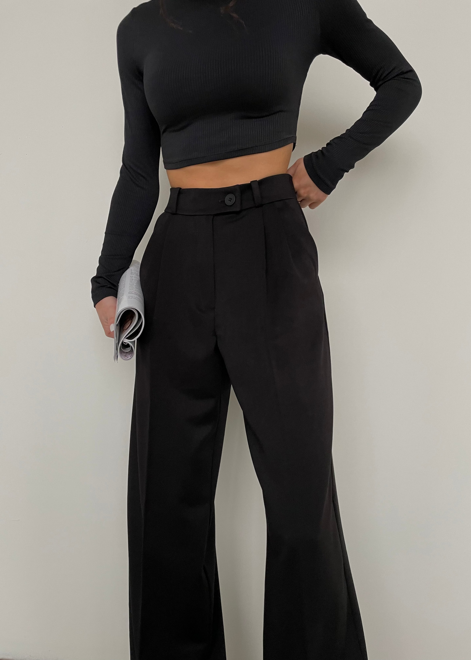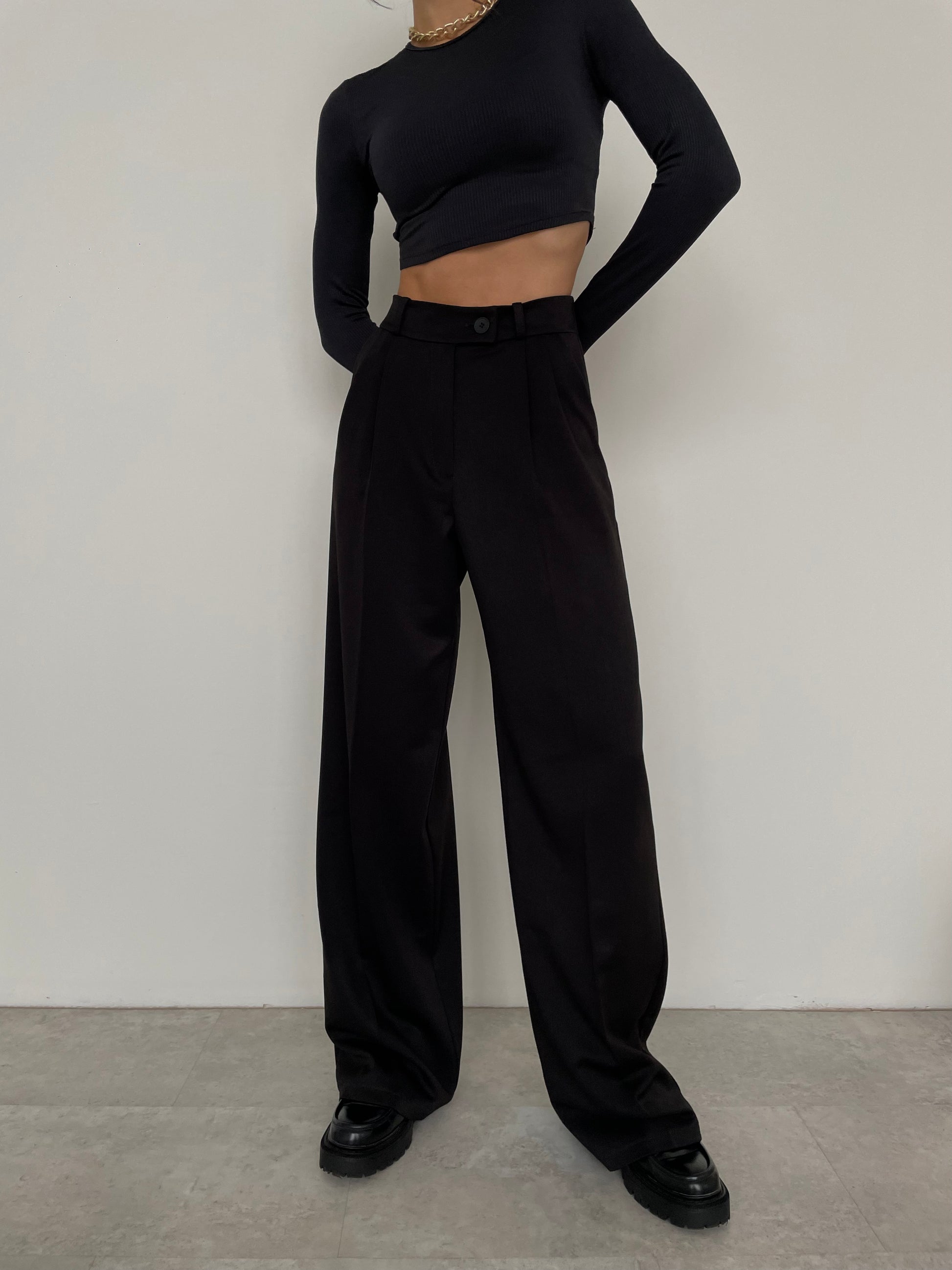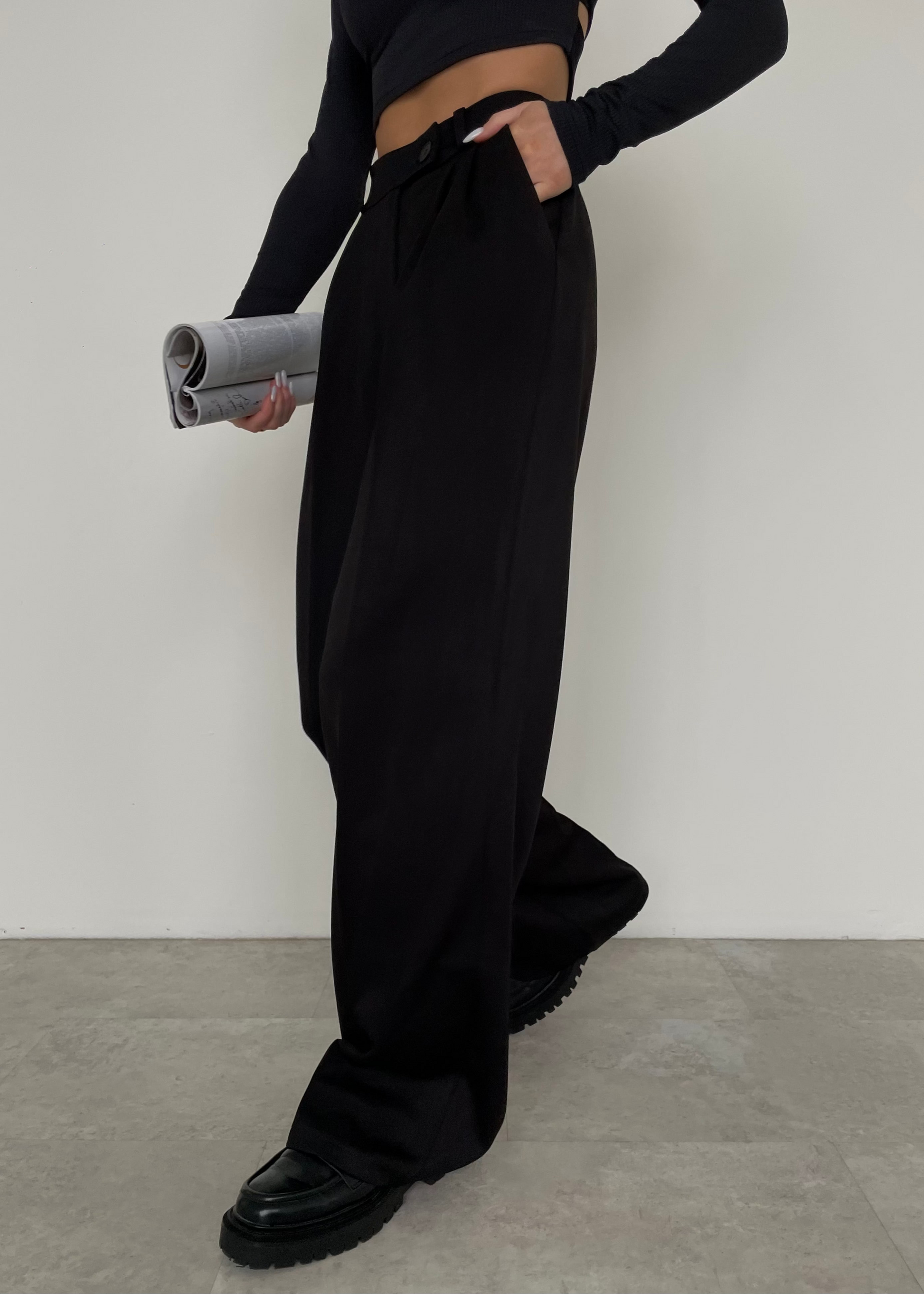 Штани палаццо виконані з якісної костюмної тканини із вмістом вовни та поліестеру — поєднання, яке забезпечує комфорт, тепло та довговічність виробу. Модель має високу посадку, пасок із ґудзиком, защипи спереду та класичний широкий крій, що візуально подовжує силует. Ідеальний вибір для елегантних, сучасних образів на кожен день або офіс.