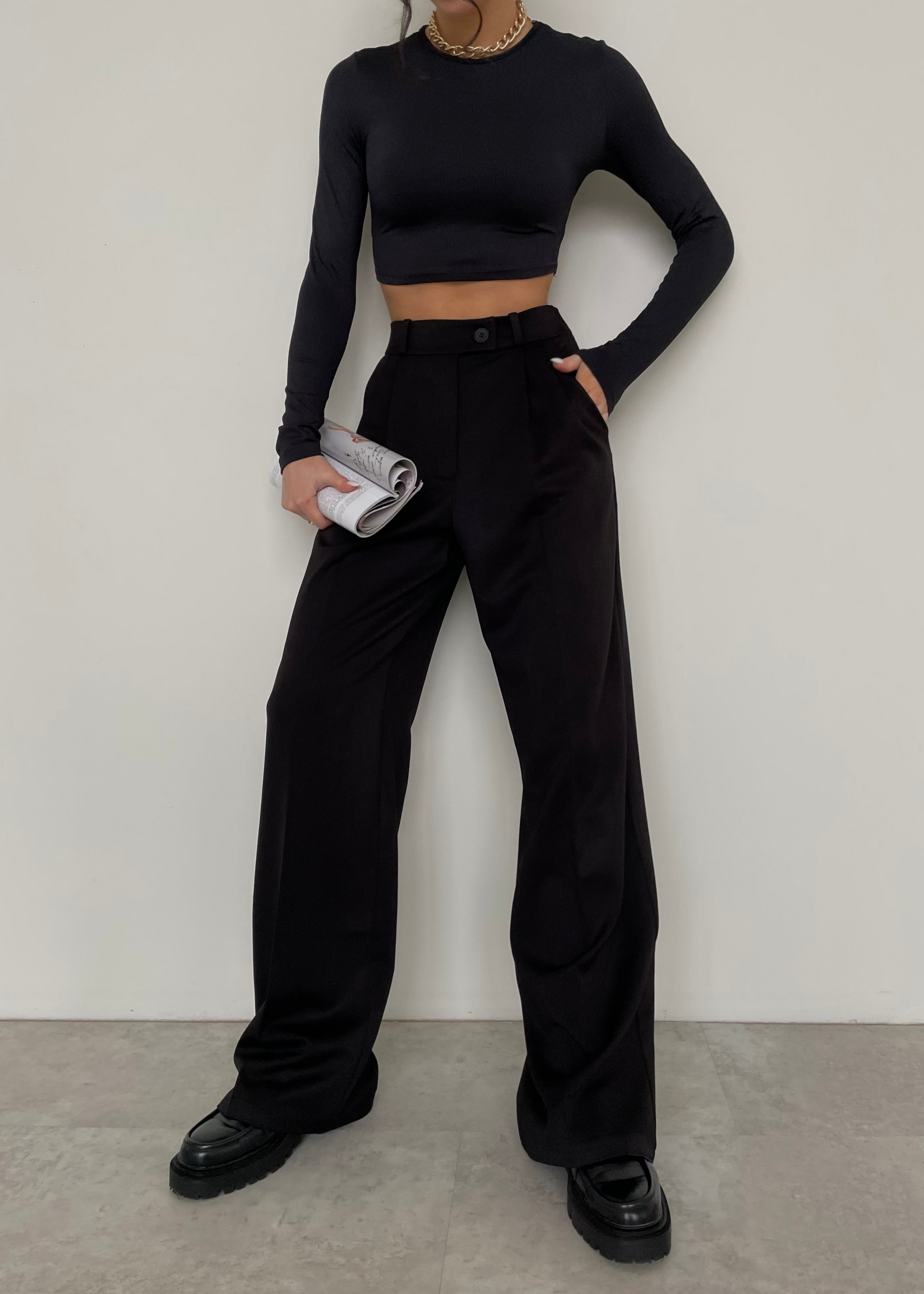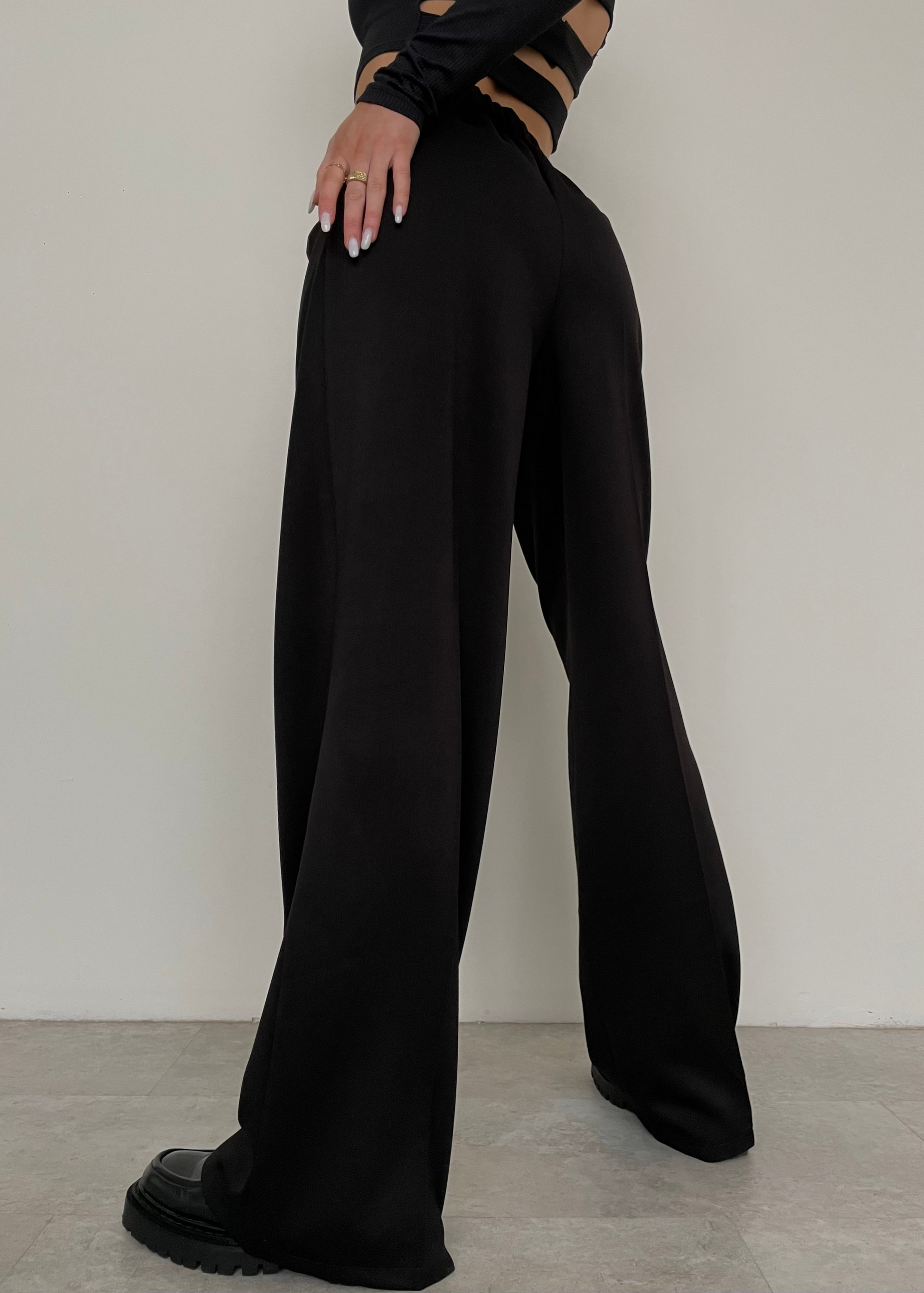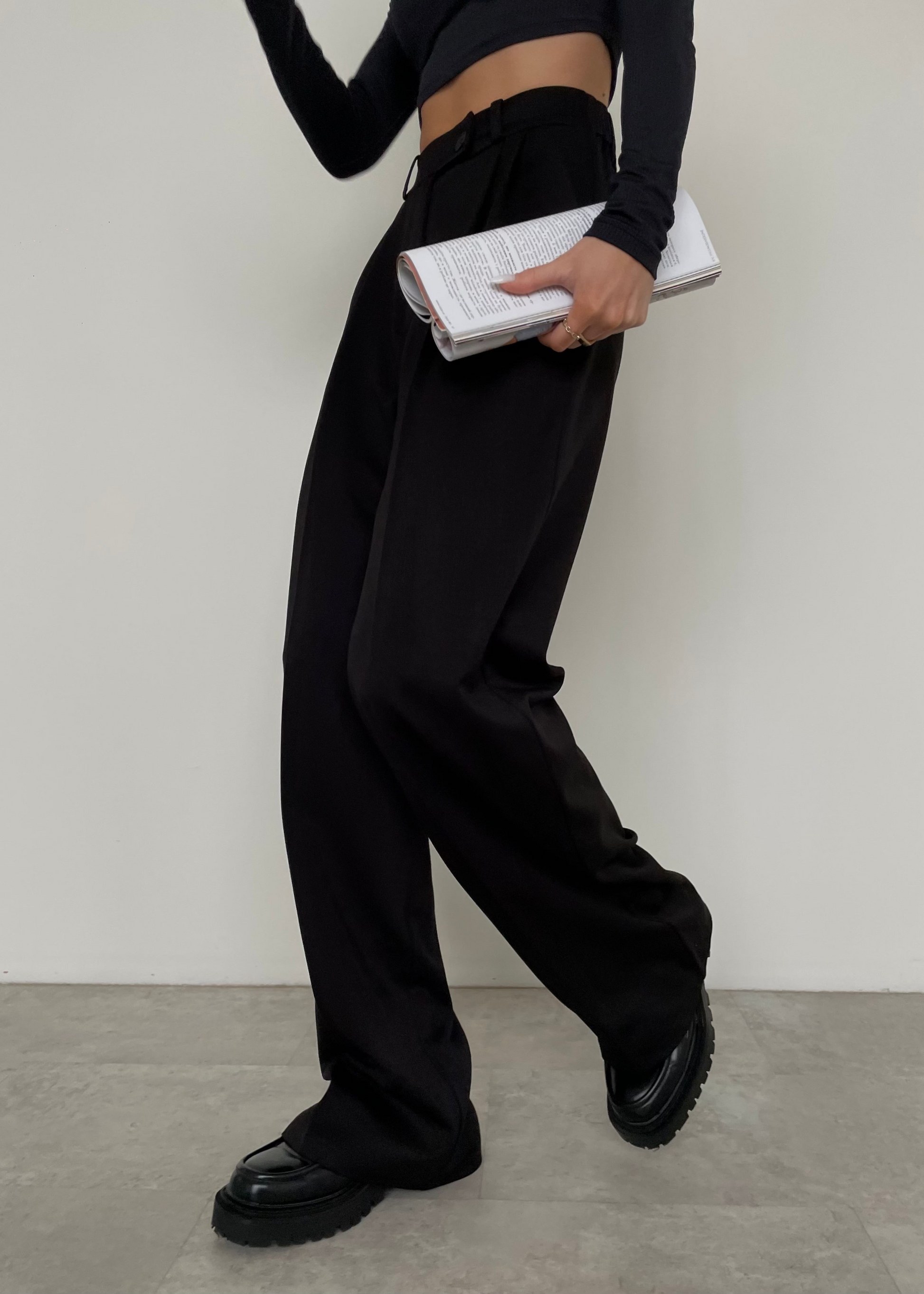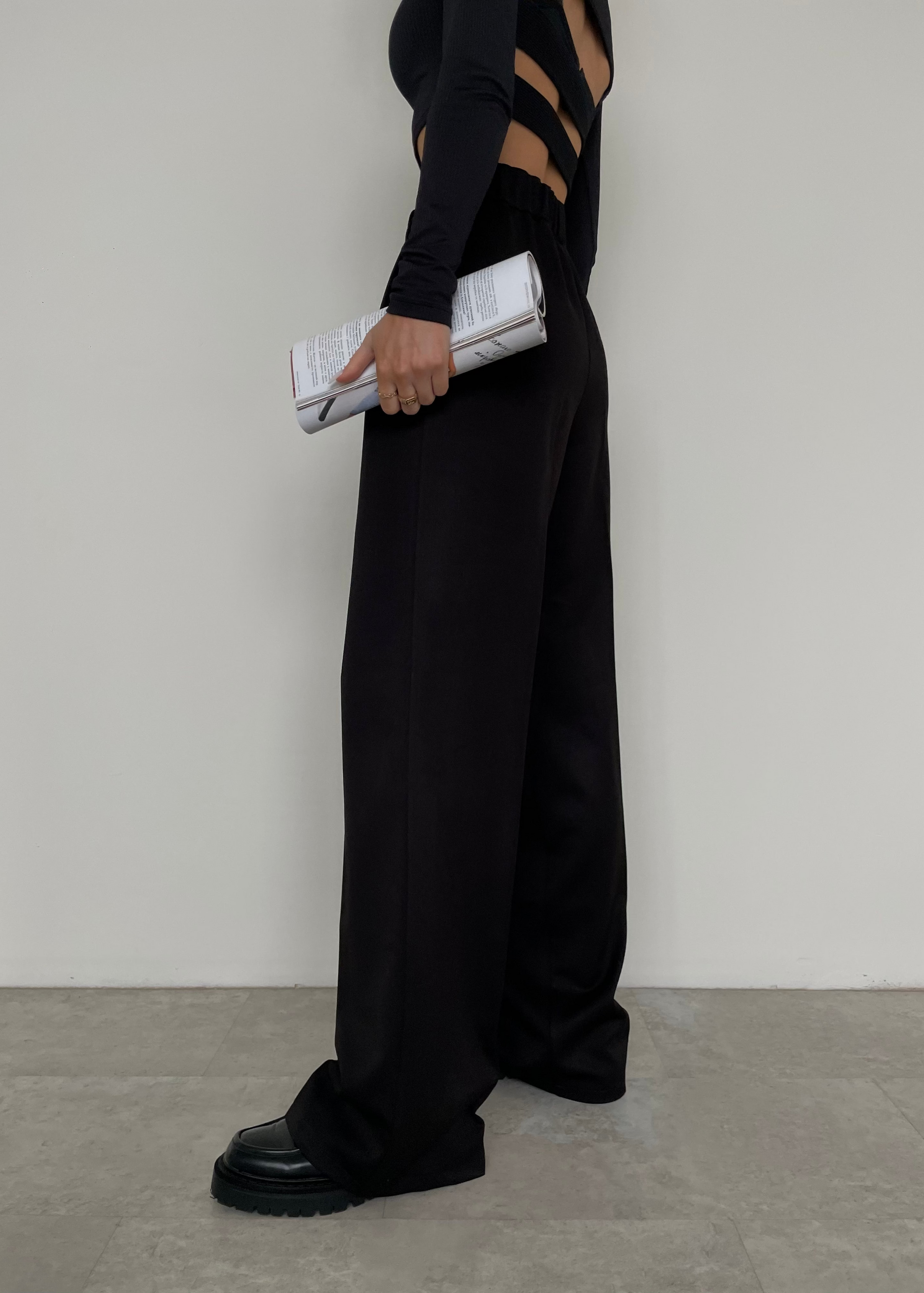 Штани палаццо виконані з якісної костюмної тканини із вмістом вовни та поліестеру — поєднання, яке забезпечує комфорт, тепло та довговічність виробу. Модель має високу посадку, пасок із ґудзиком, защипи спереду та класичний широкий крій, що візуально подовжує силует. Ідеальний вибір для елегантних, сучасних образів на кожен день або офіс.
