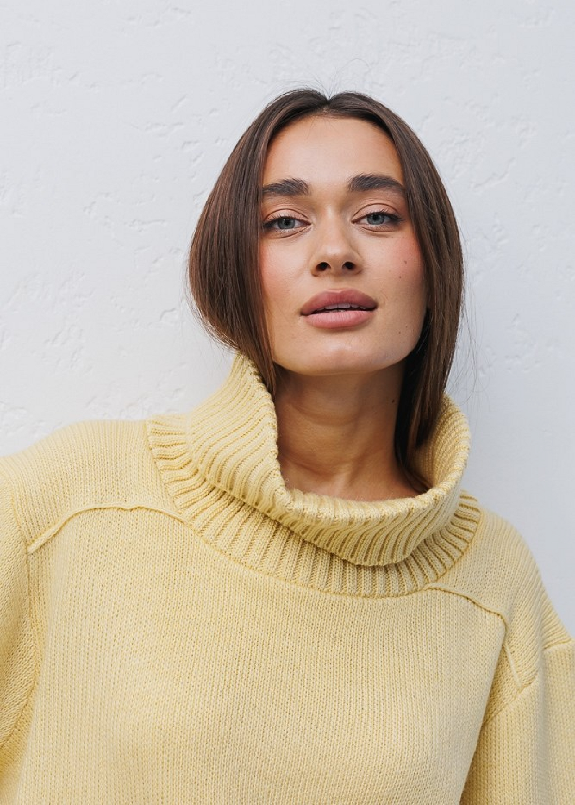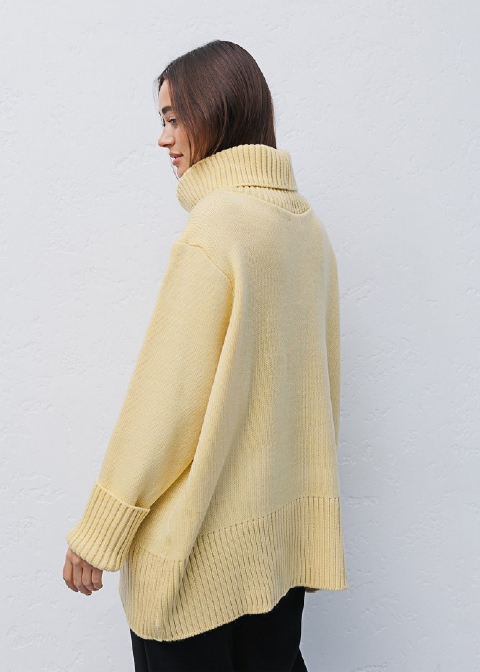 Затишний oversize светр з м’якої пряжі. Стильний об’ємний светр — акцентна річ, яка поєднує комфорт і мінімалізм. Виготовлений із м’якої трикотажної пряжі, цей светр має вільний крій, спущену лінію плеча та широкий комір, який можна носити як стоячи, так і м’яко відвернувши.