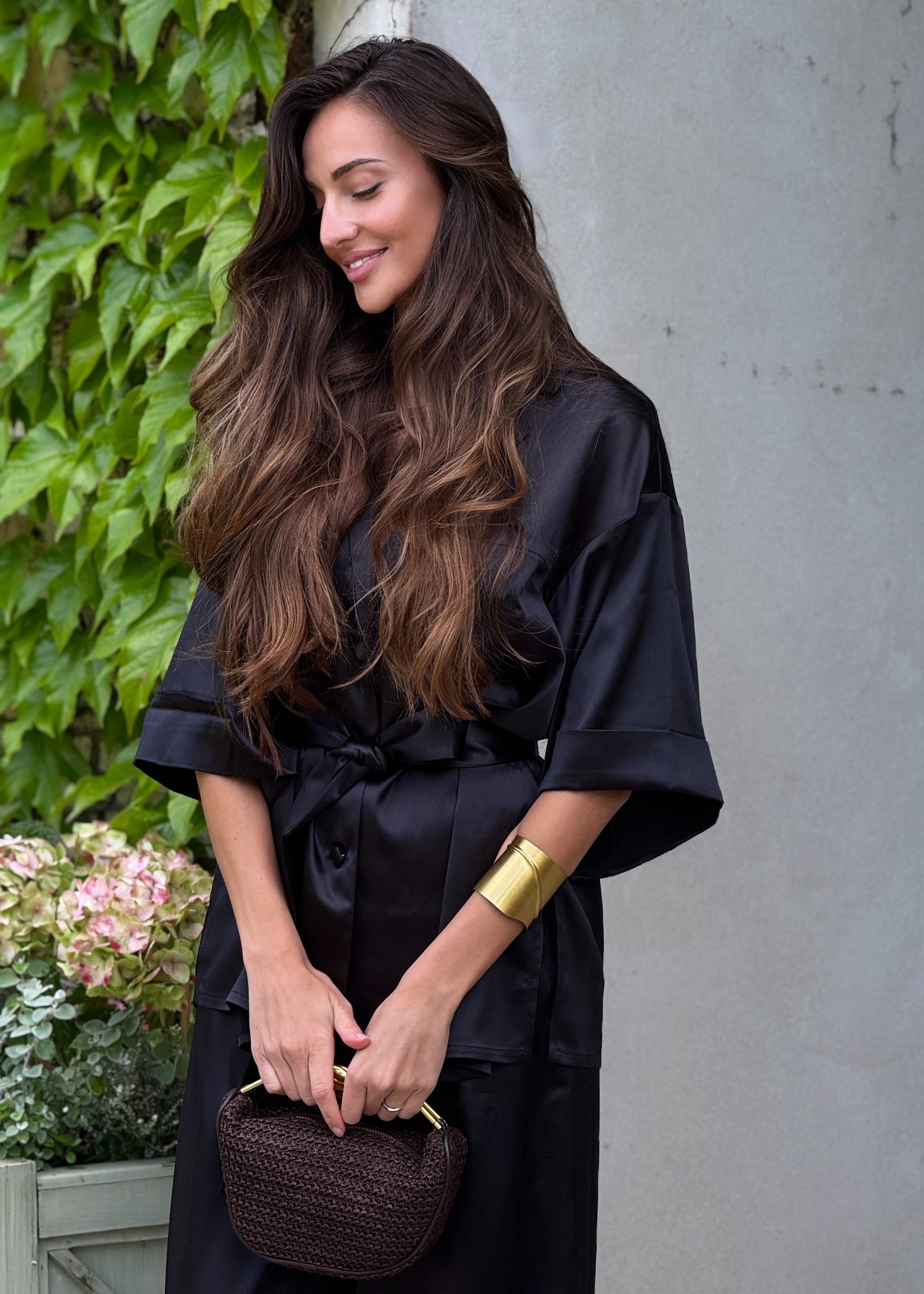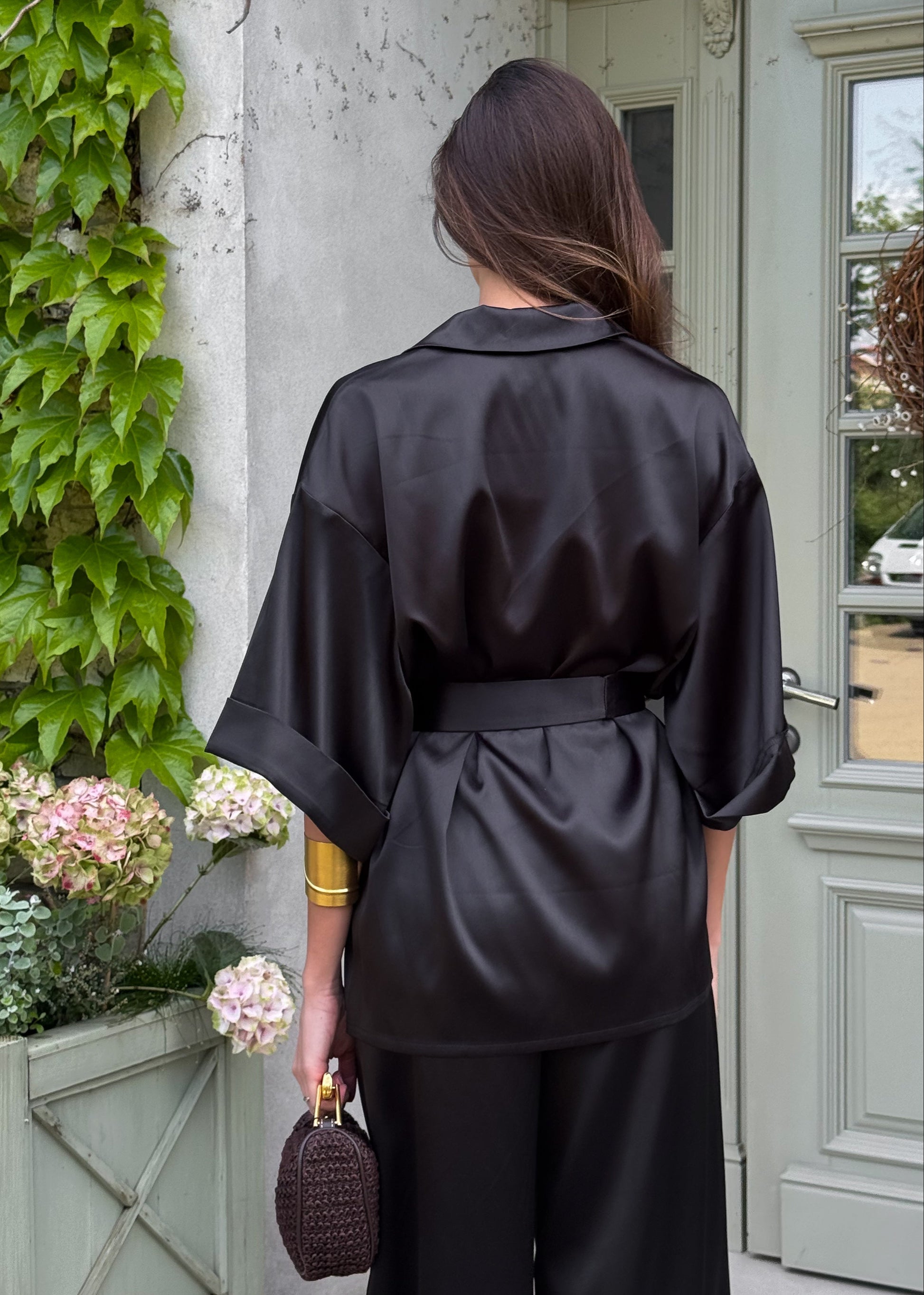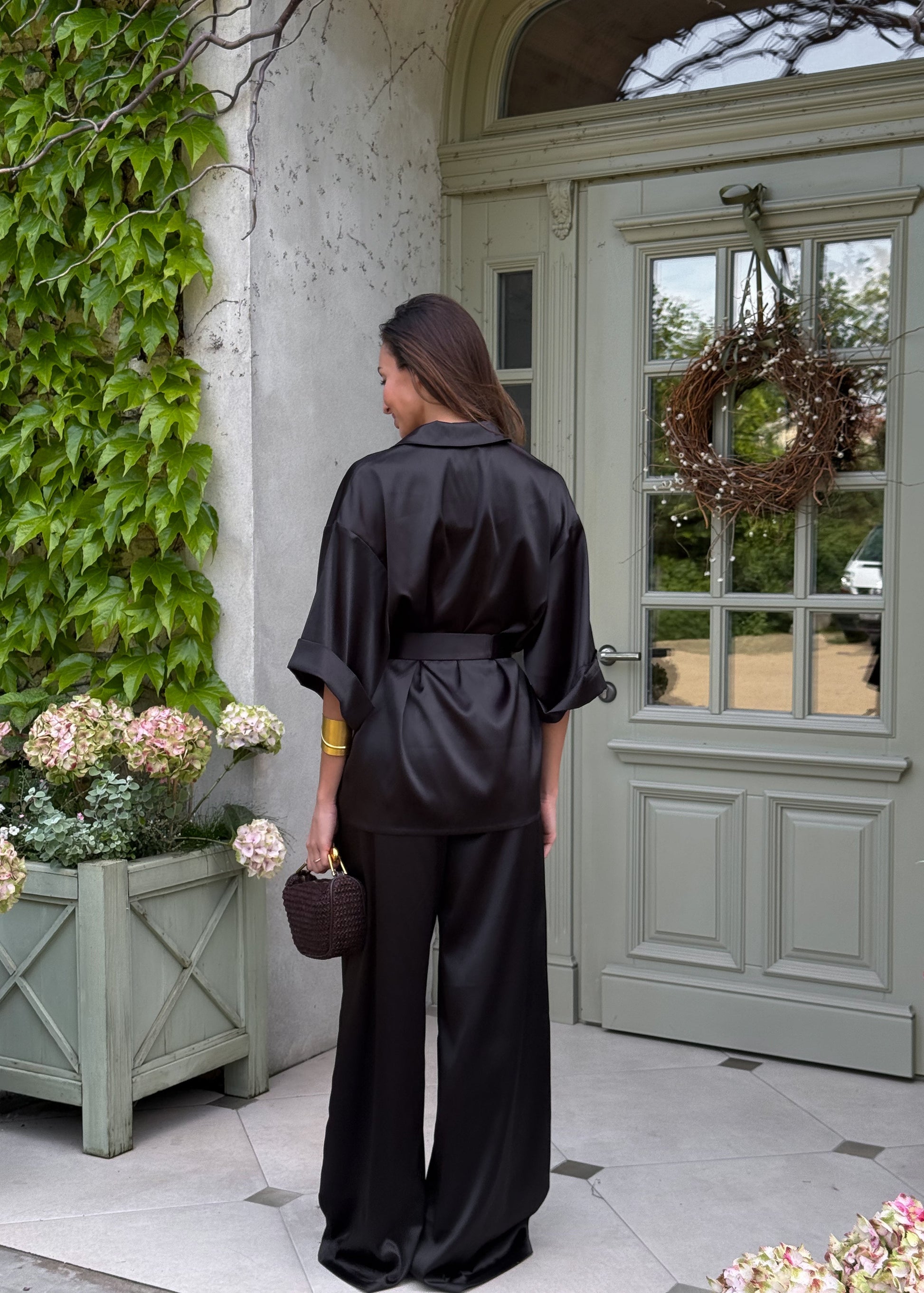 Елегантний сатиновий комплект із легкою шовковистою текстурою. Верх — вільна сорочка зі спущеною лінією плечей і широкими рукавами, що м’яко огортають силует. Пояс підкреслює талію й додає образу гармонії. Штани — з високою посадкою та розкльошеним кроєм, створюють плавну лінію руху й ідеально витягують силует.