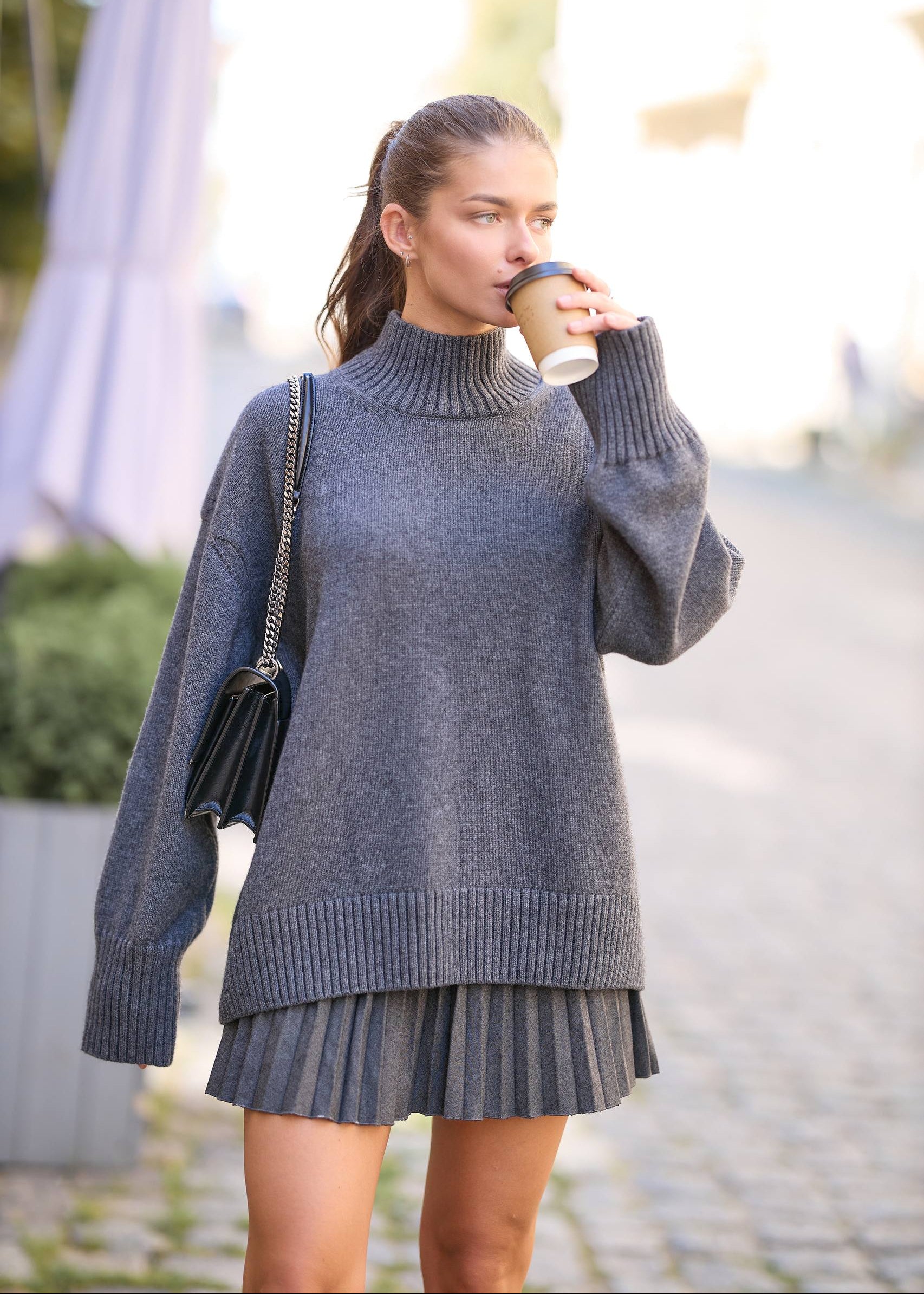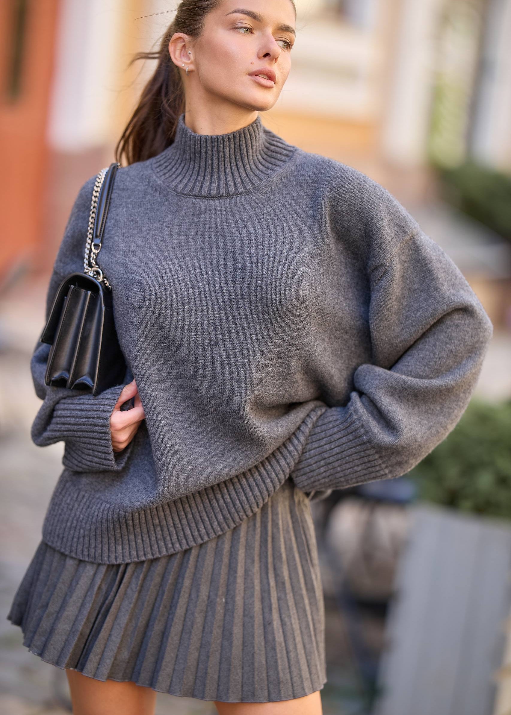 Базовий светр вільного силуету, виконаний із преміальної пряжі — 50% кашеміру та 50% мериносової шерсті. Матеріал надзвичайно м’який, легкий та приємний до тіла, забезпечує комфорт і виглядає бездоганно. Модель має високий комір-стійку та акцентні широкі манжети й нижню резинку, що додають виробу структури. Ідеальний вибір для елегантних повсякденних образів.