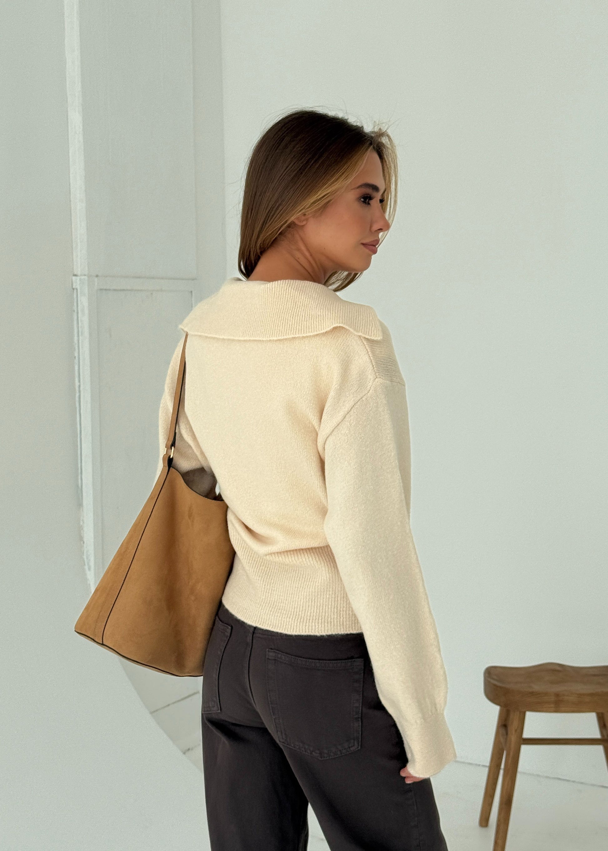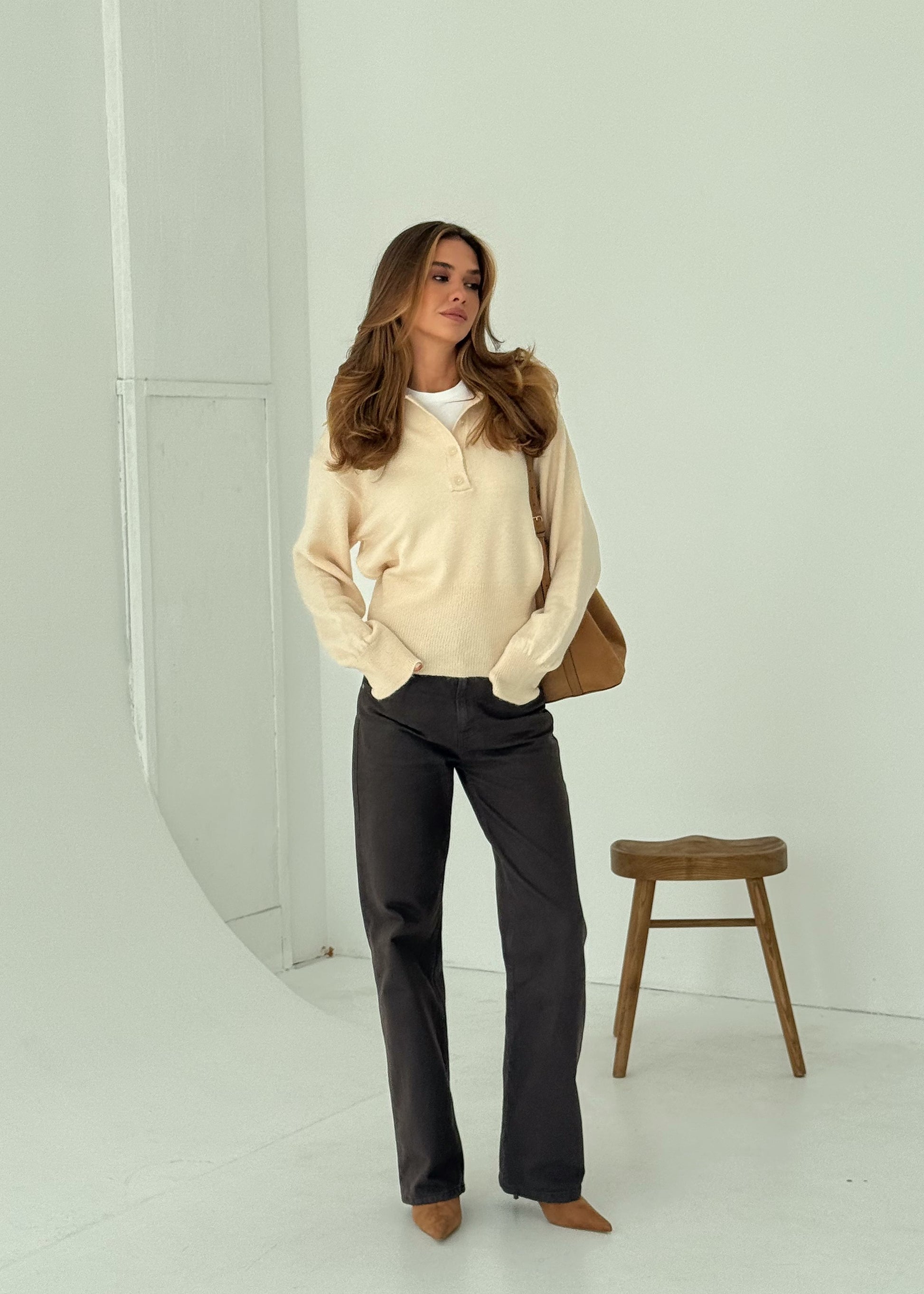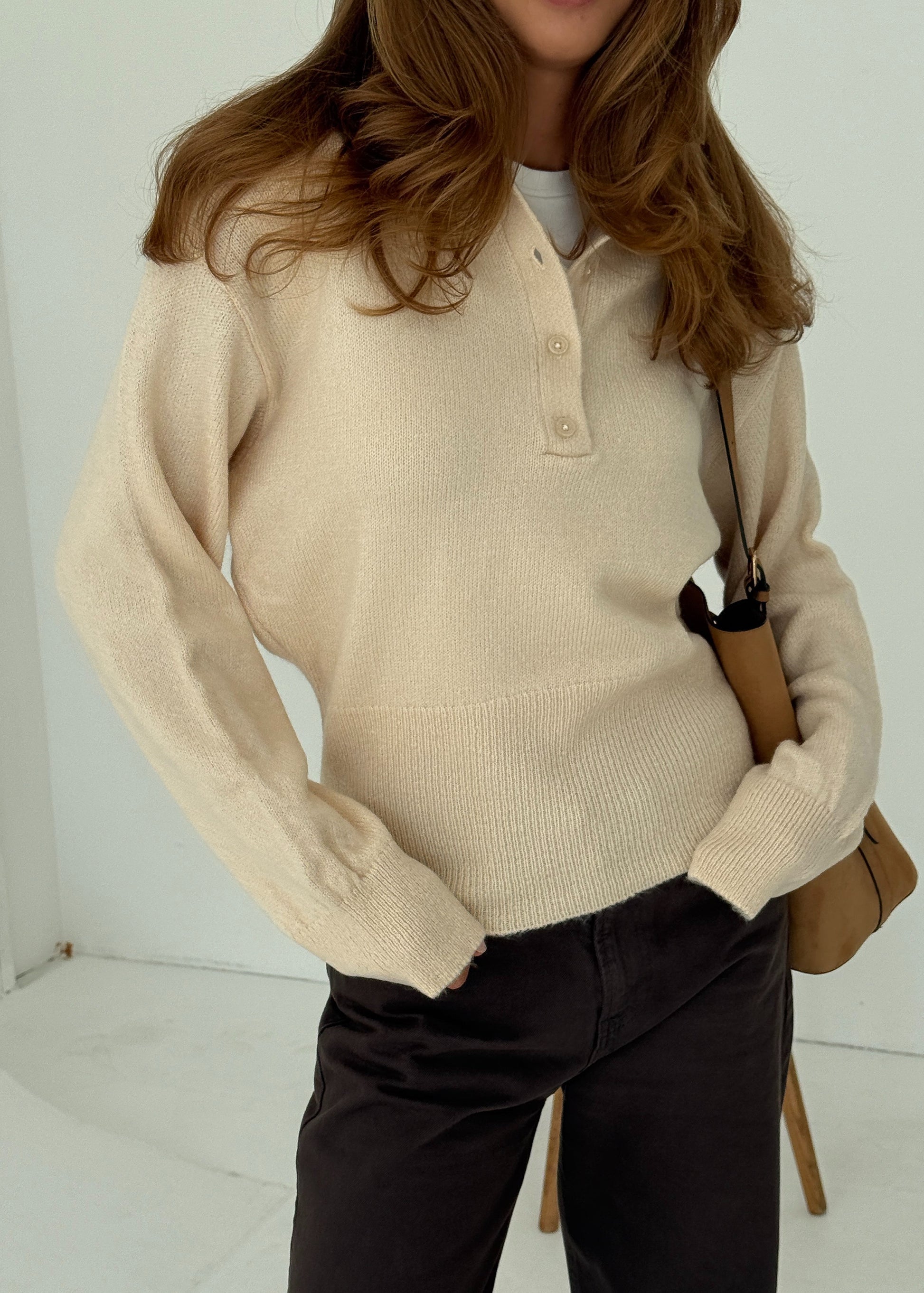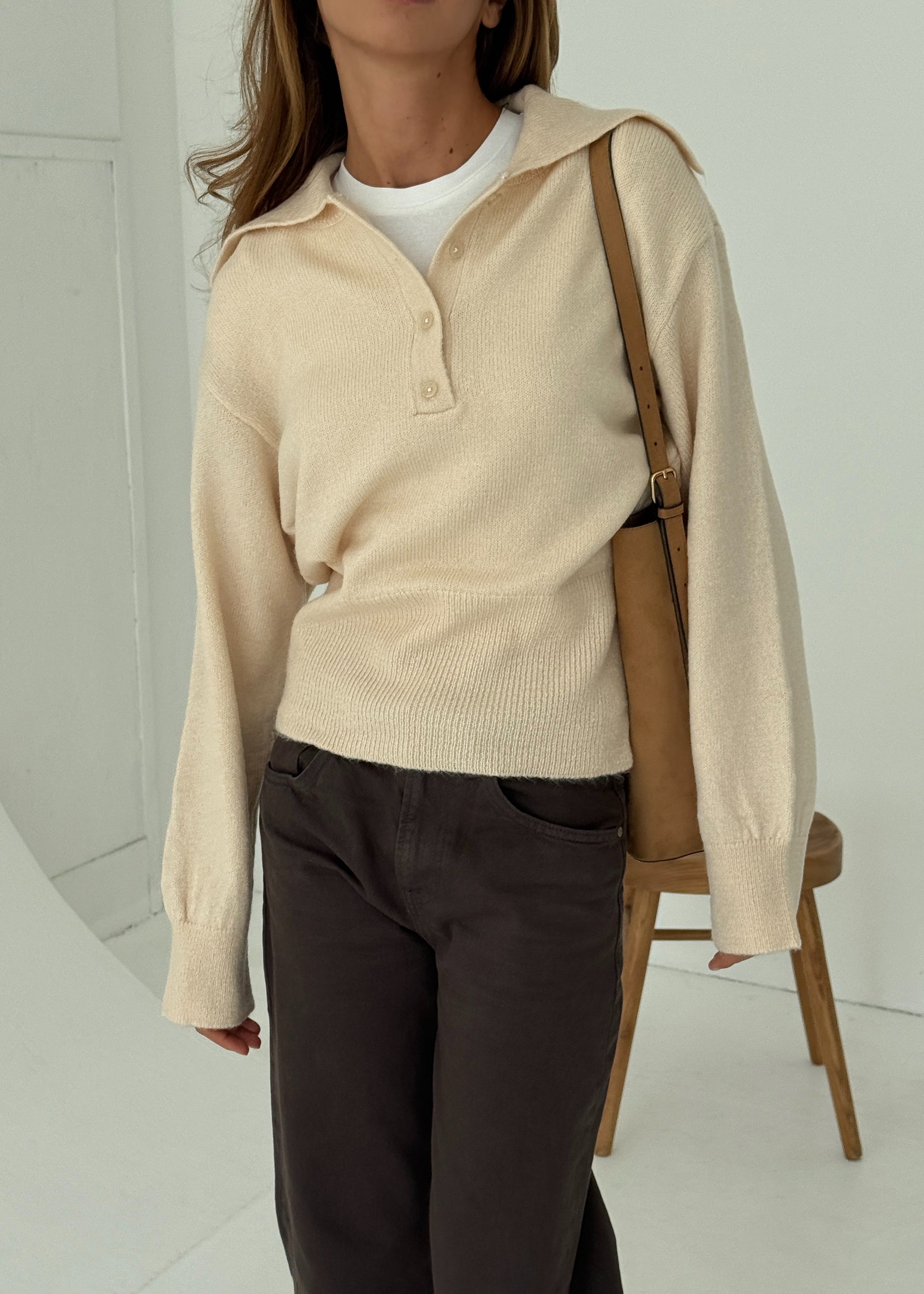 Светр з верхом на ґудзиках дозволяє варіювати глибину вирізу — від спортивної невимушеності до більш елегантного настрою. Вільний крій додає комфорту та виглядає гармонійно як у тандемі з міні-спідницею та високими чоботами, так і з широкими брюками чи джинсами.