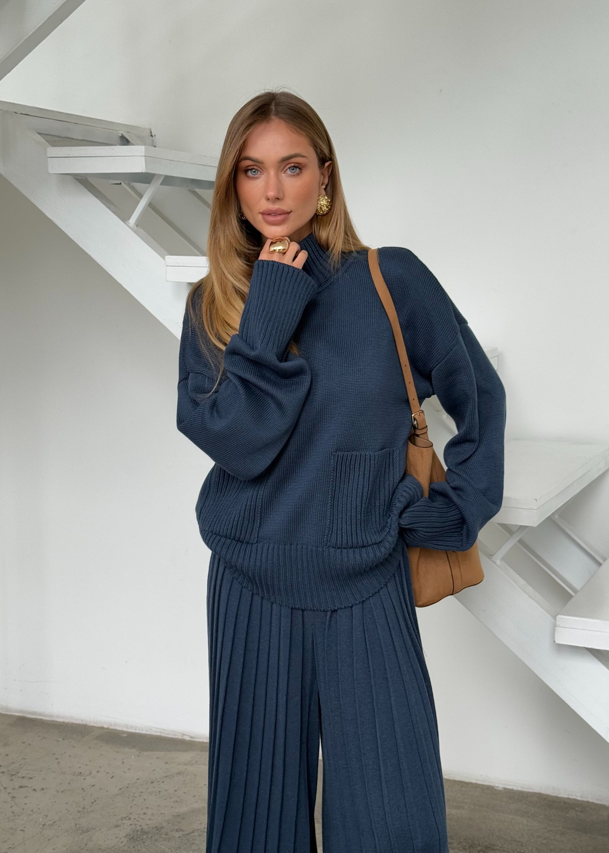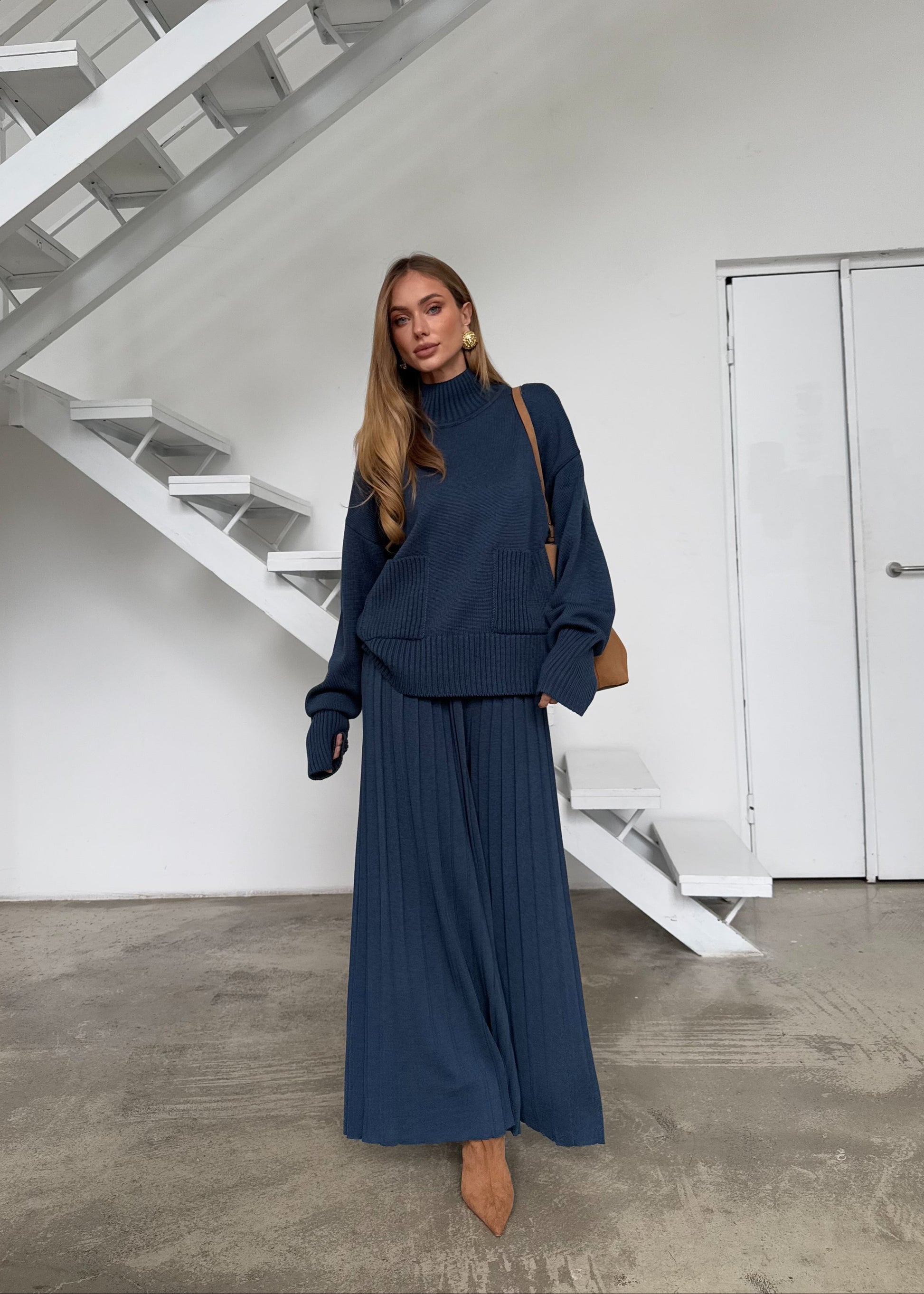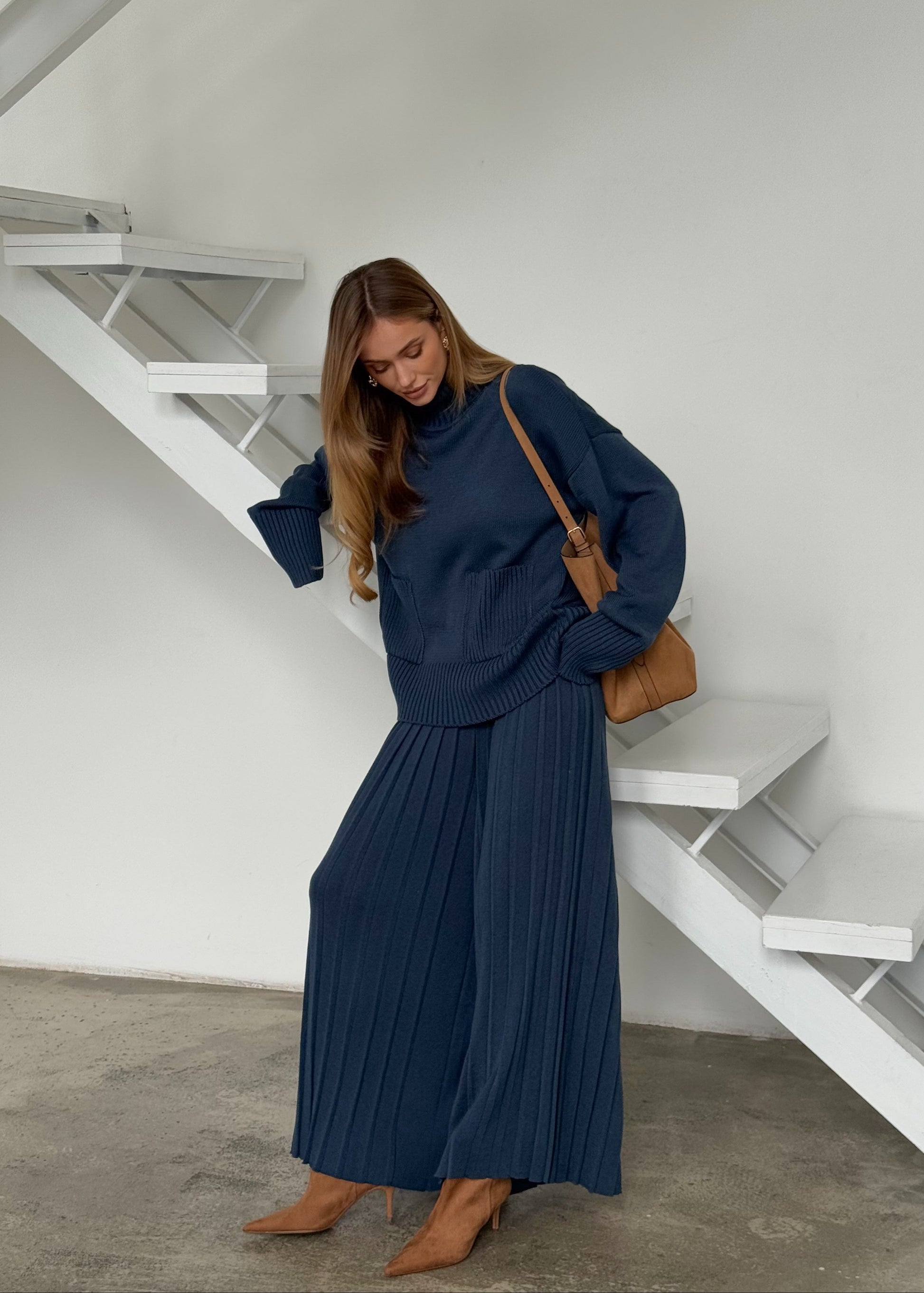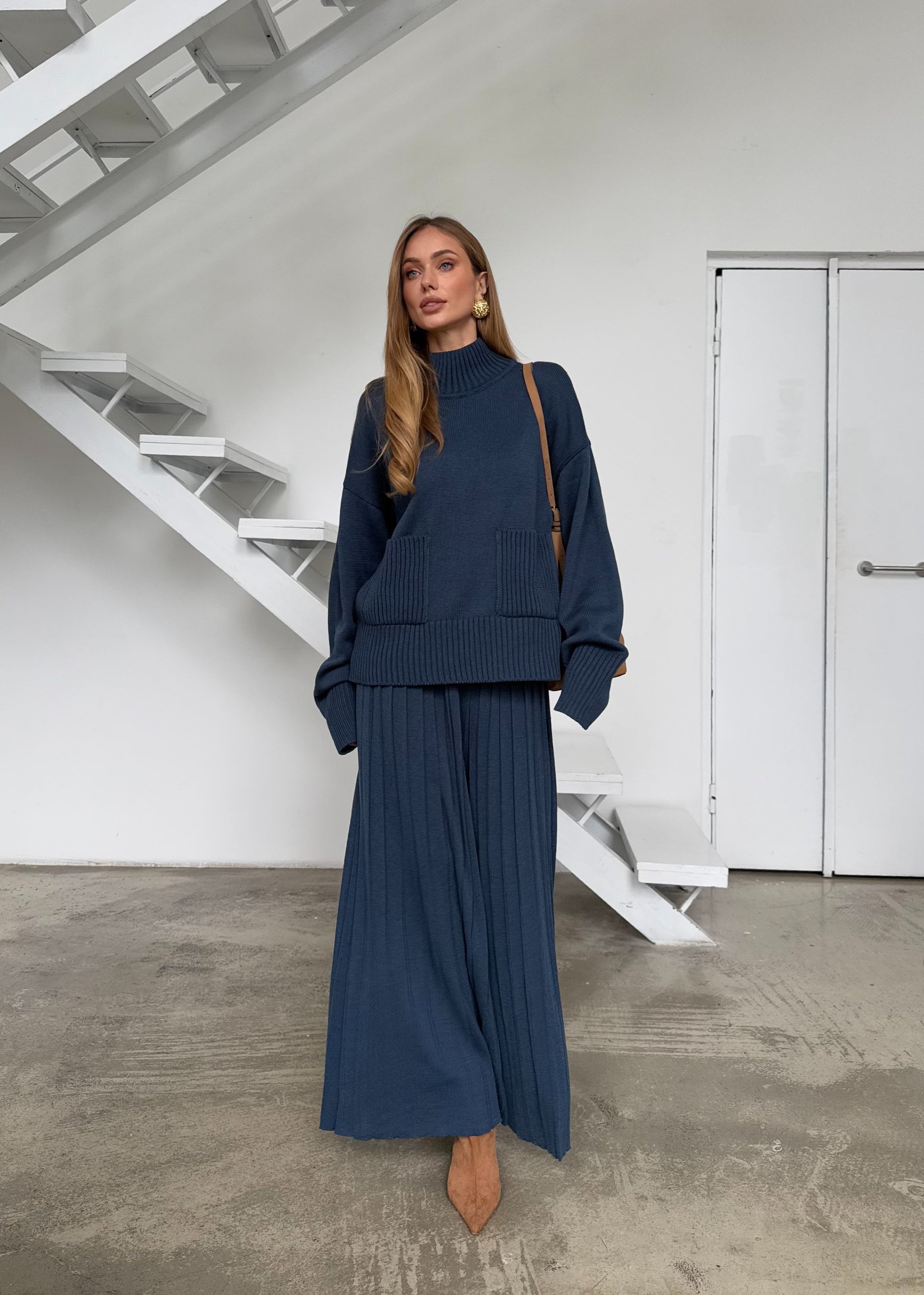 Оверсайз-светр із високим горлом і виразною фактурною в’язкою доповнений широкими плісированими штанами, що створюють відчуття легкості руху.