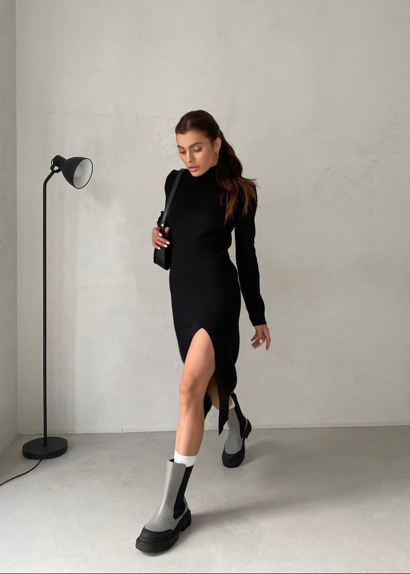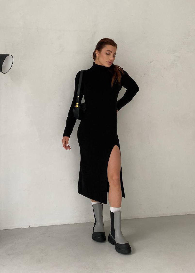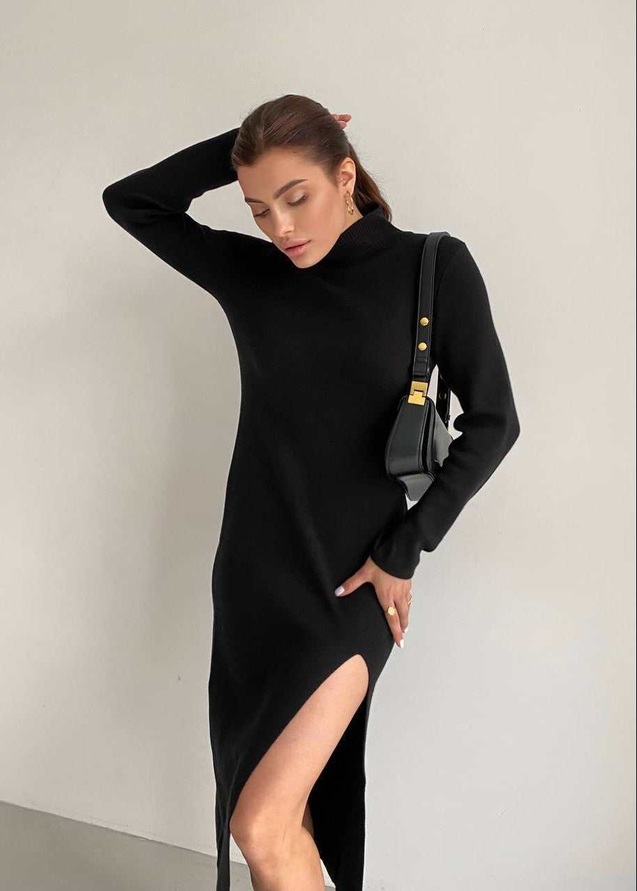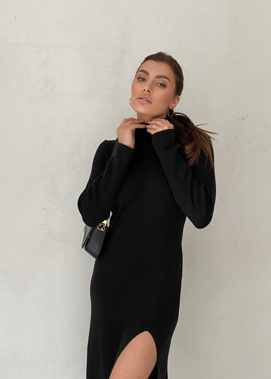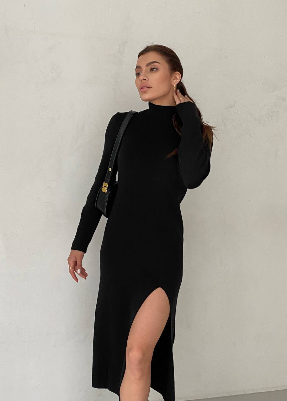 Силуетна сукня з м’якого трикотажу, що ідеально підкреслює фігуру. Модель має довгі рукави, високий комір-стійку та ефектний розріз спереду, який додає образу жіночності та впевненості.