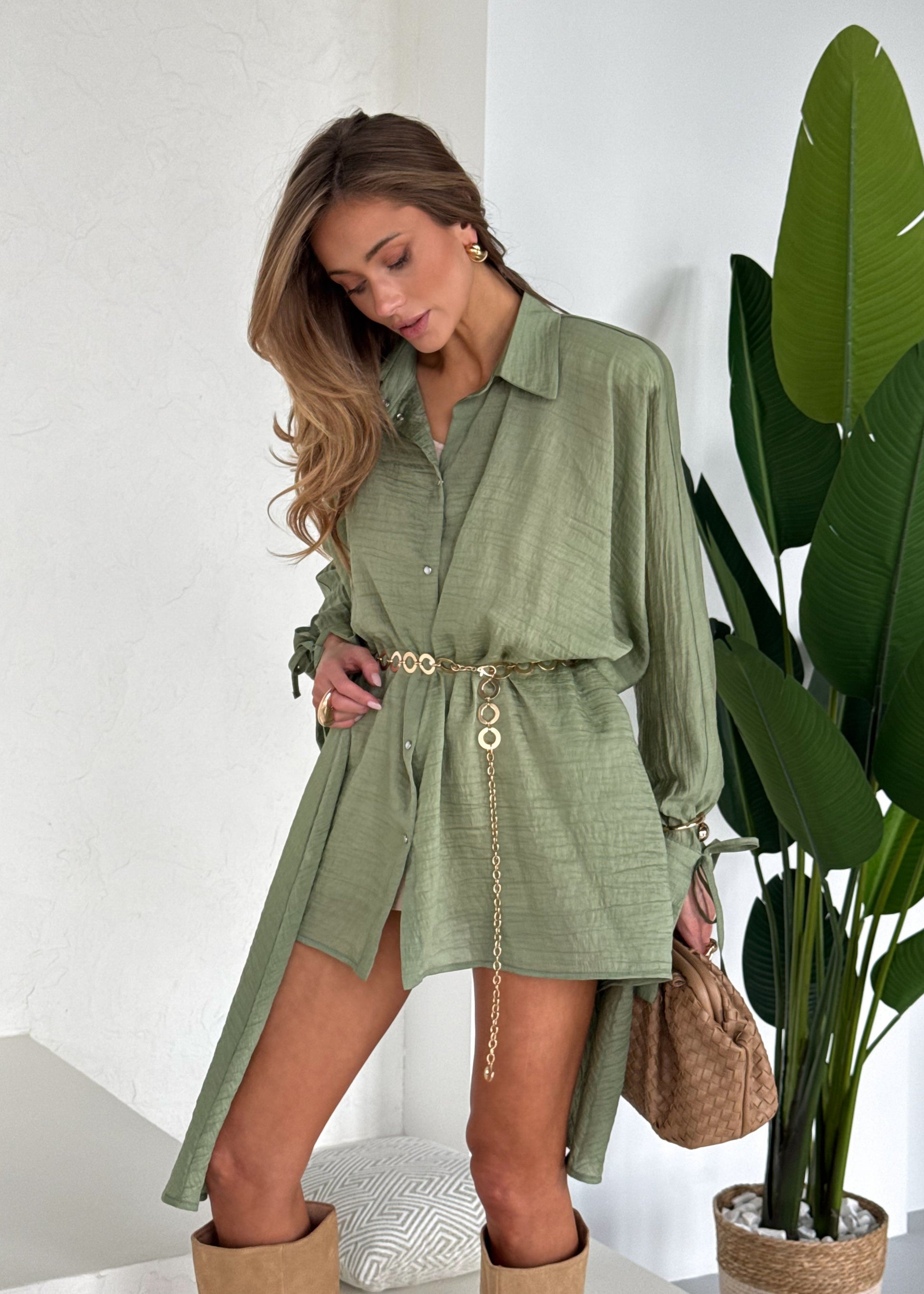 Легка сукня-сорочка з модалу з м’яким переливом і ніжною текстурою. Має подовжений силует, акцентні довгі рукави з манжетами та універсальний крій.