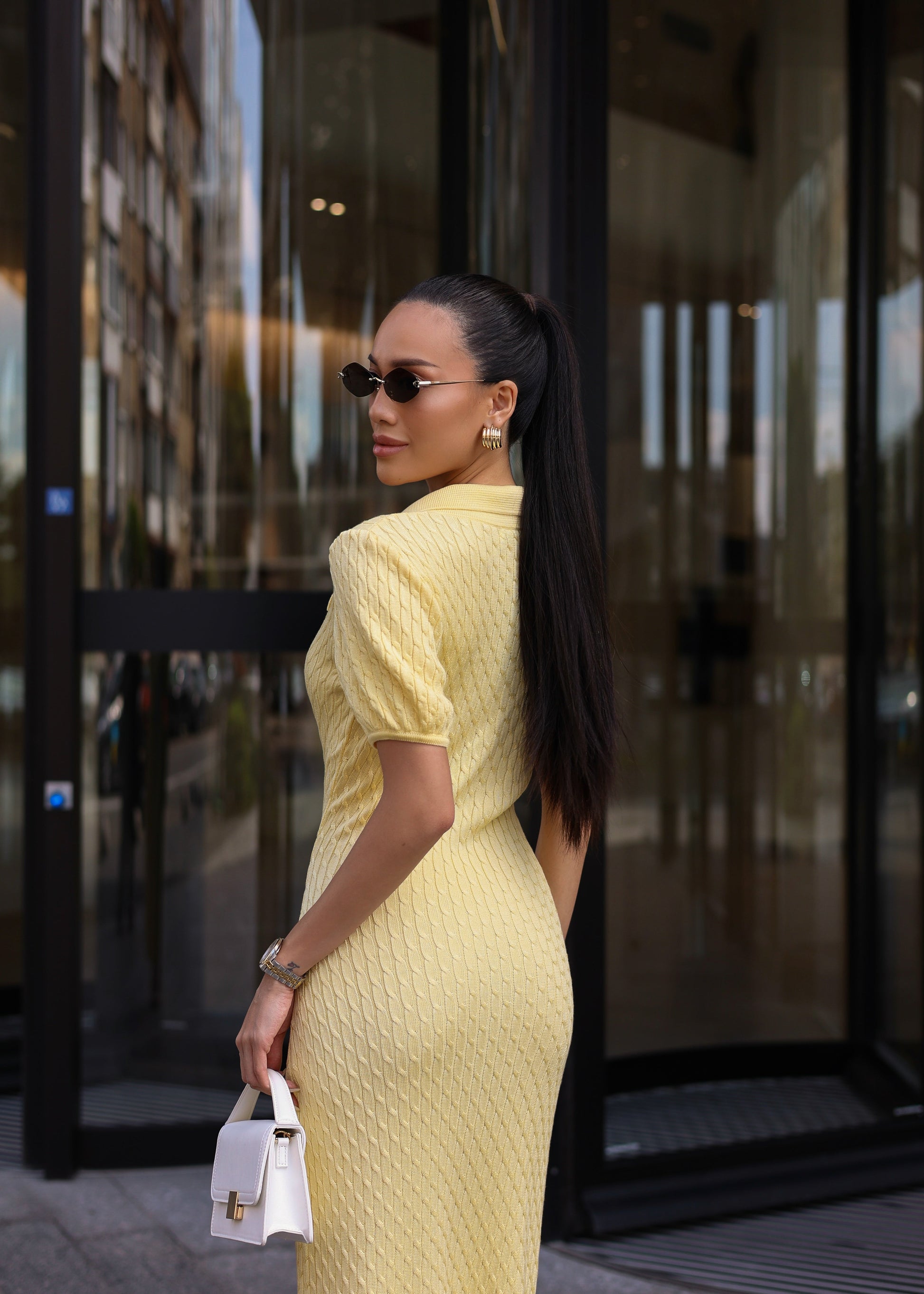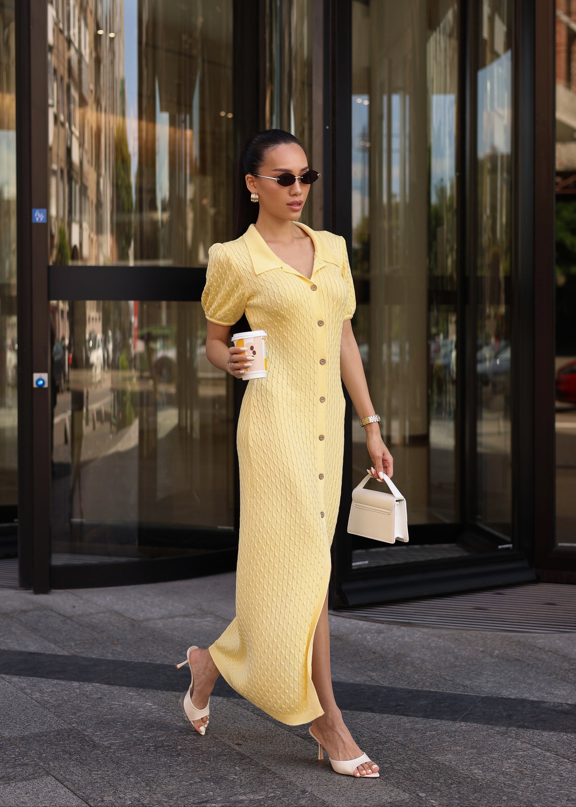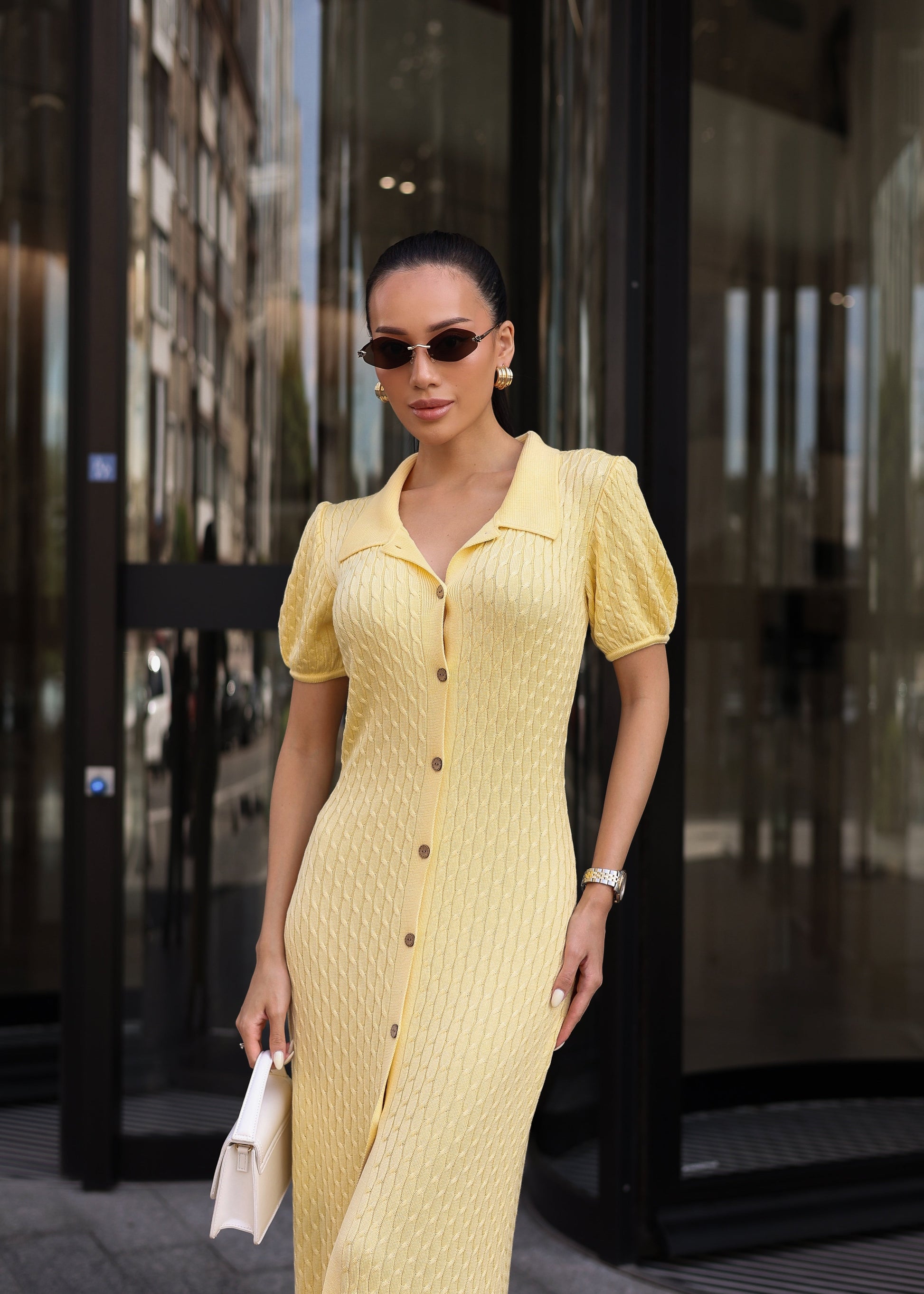 Силуетна сукня з м’якого бавовняного трикотажу, що делікатно підкреслює фігуру. Акцентні рукави-ліхтарики додають форми, а комір і металеві ґудзики створюють виразну лінію.