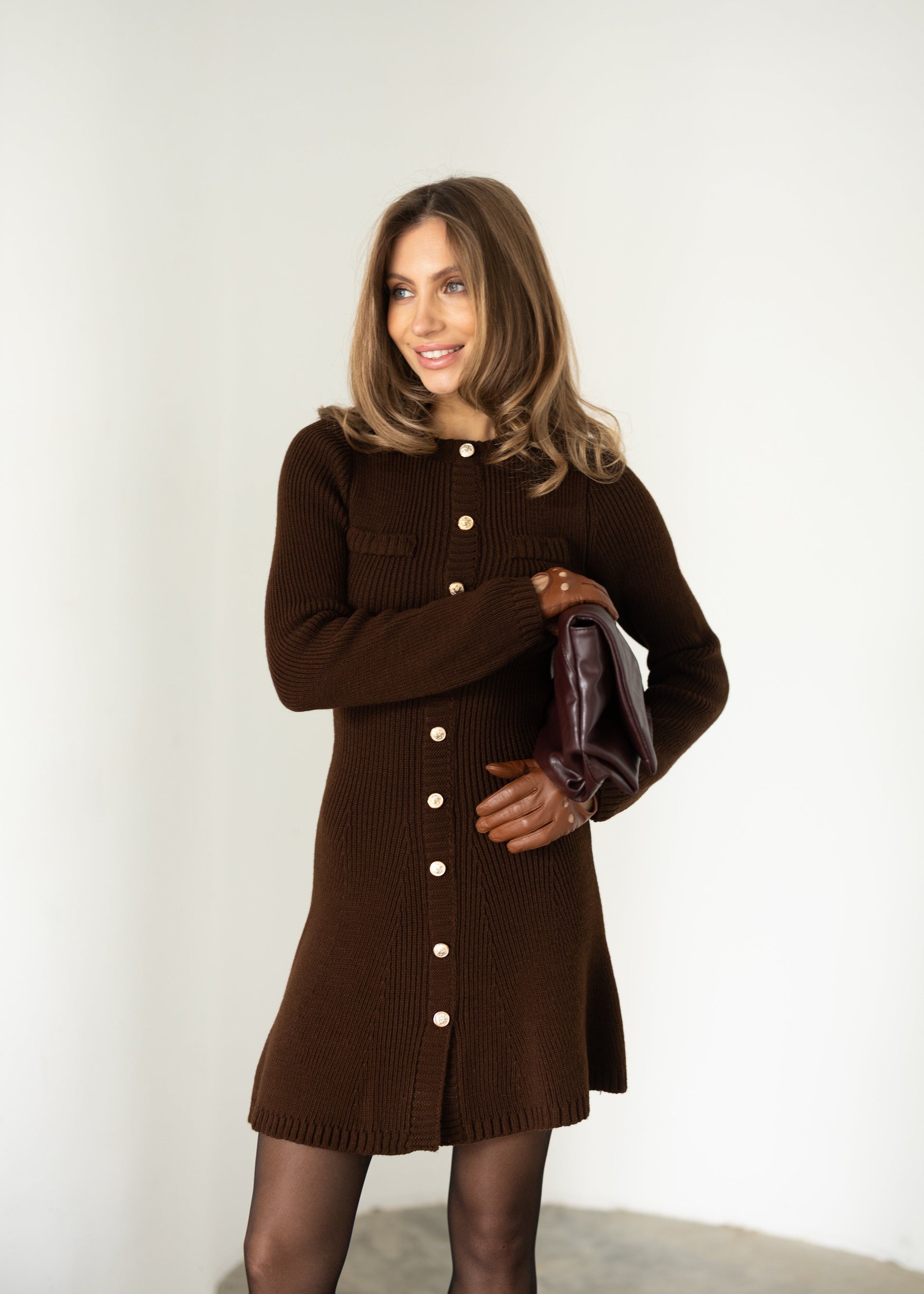 Коротка в'язана сукня з акцентною планкою на ґудзиках — це сучасне переосмислення класики. Приталений силует підкреслює фігуру, вертикальна в'язка візуально витягує лінії, а акуратні кишеньки створюють легкий натяк на ретро-шик.