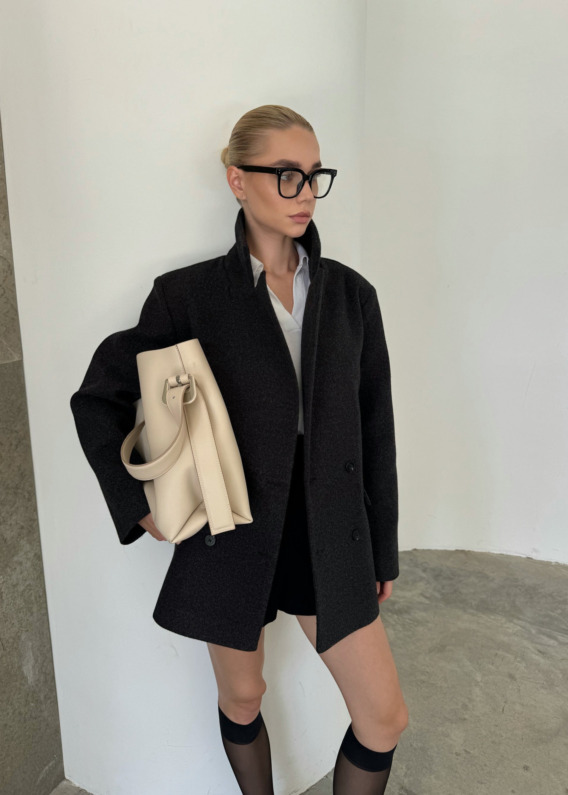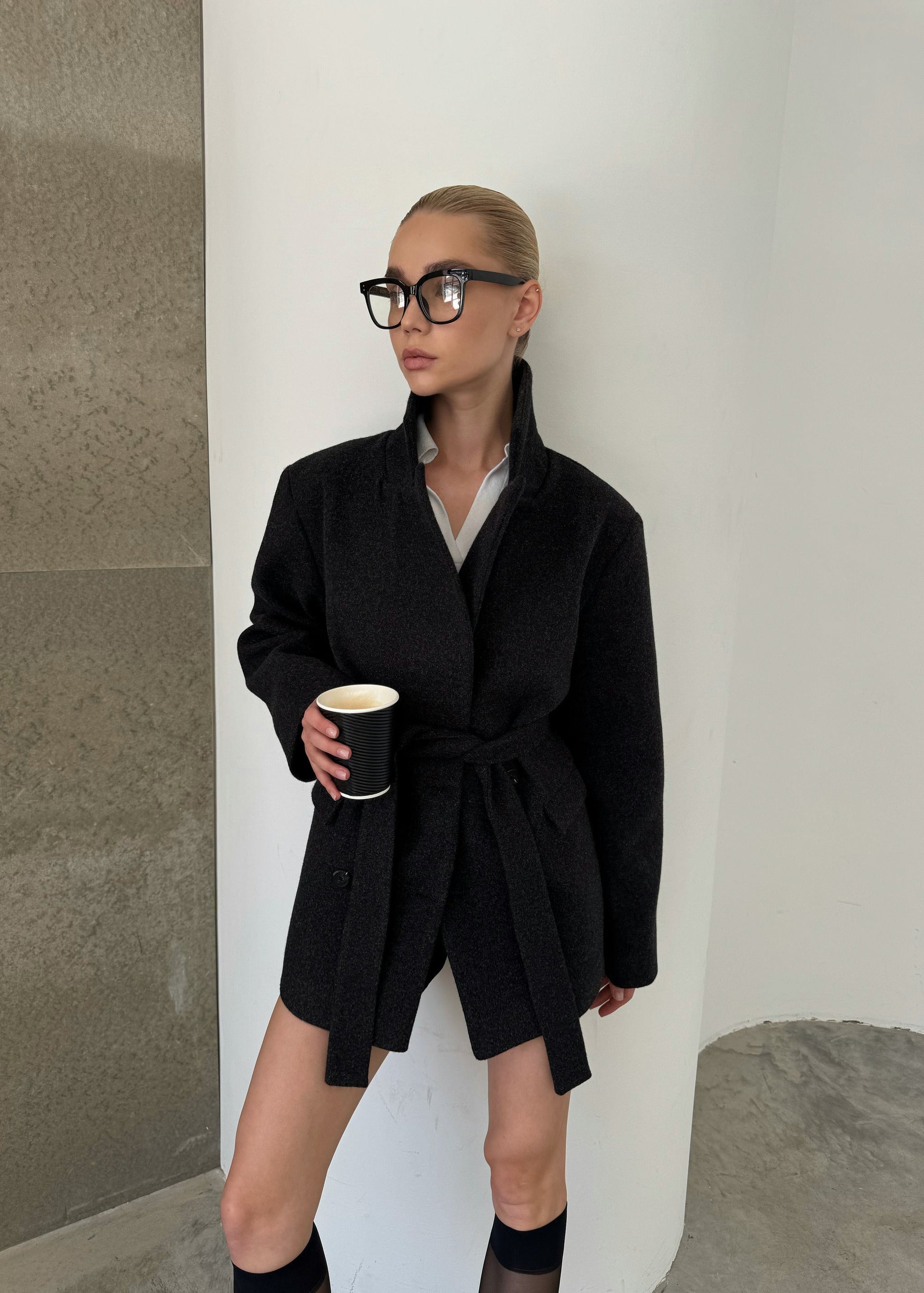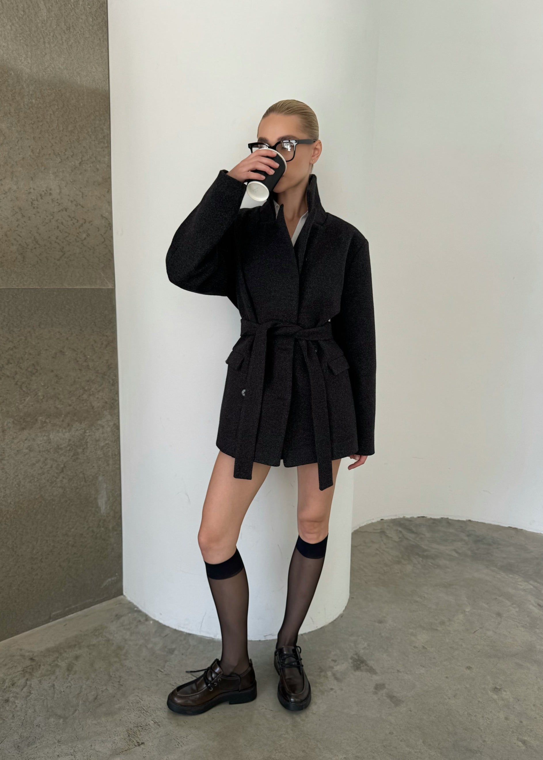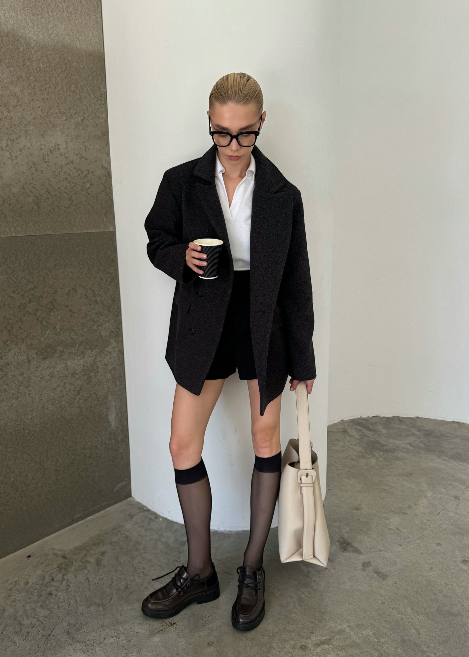 Двобортний крій із ґудзиками та прямими лініями додає елегантності, а укорочена довжина створює сучасний, динамічний образ і візуально підкреслює ноги.
