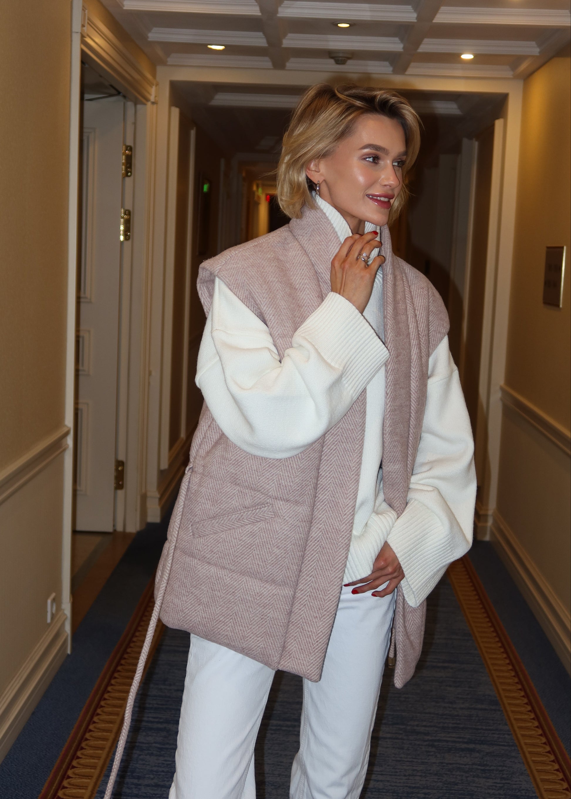 Стьобаний жилет з виразною текстурою — стильний і функціональний акцент для багатошарових образів. Модель має вільний силует і фіксується на талії за допомогою пояса, що дозволяє регулювати посадку та підкреслювати фігуру.