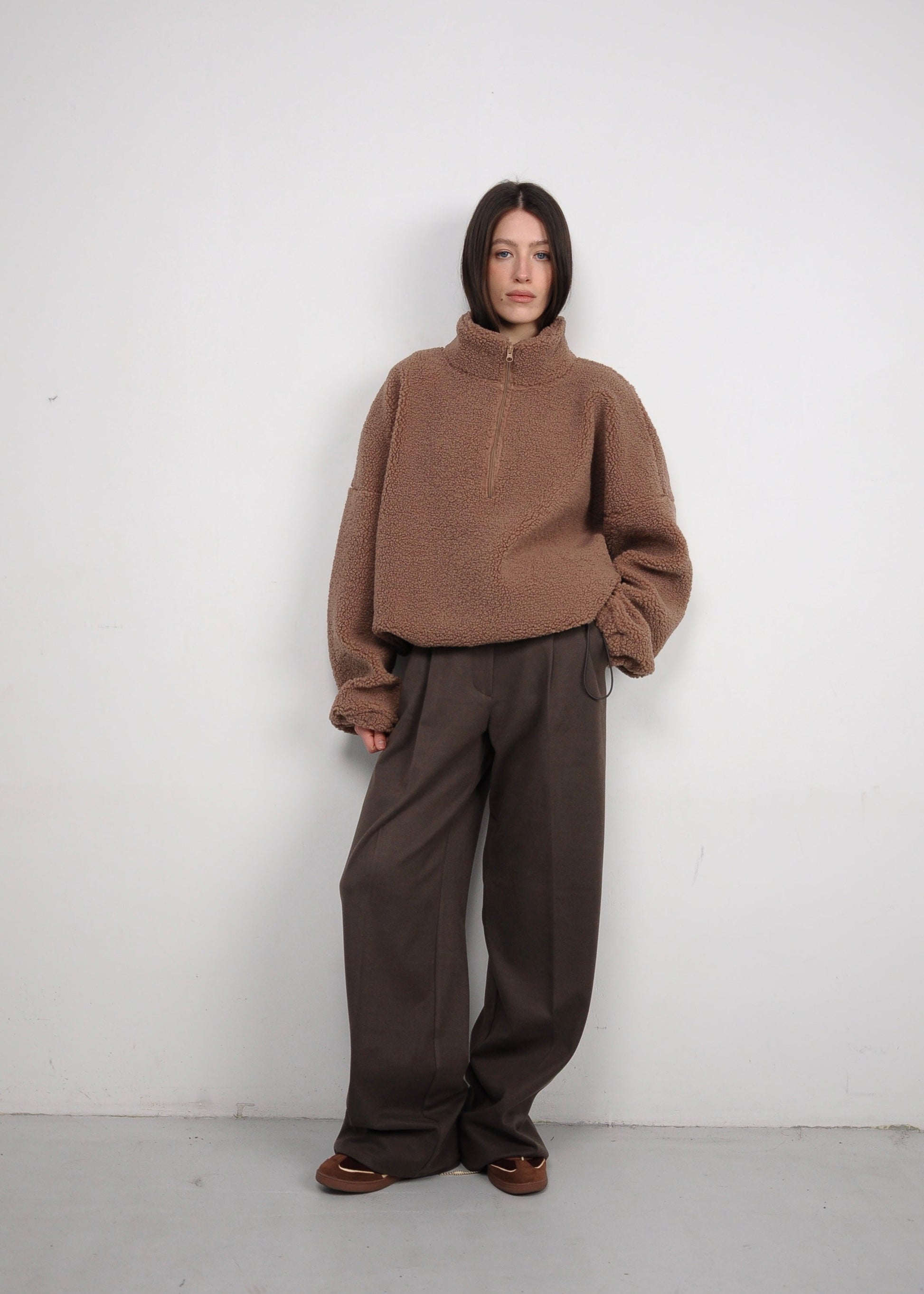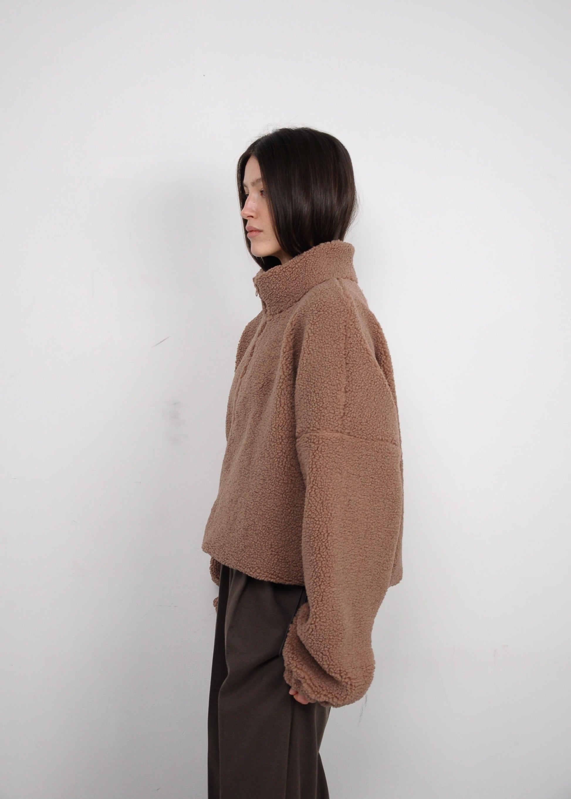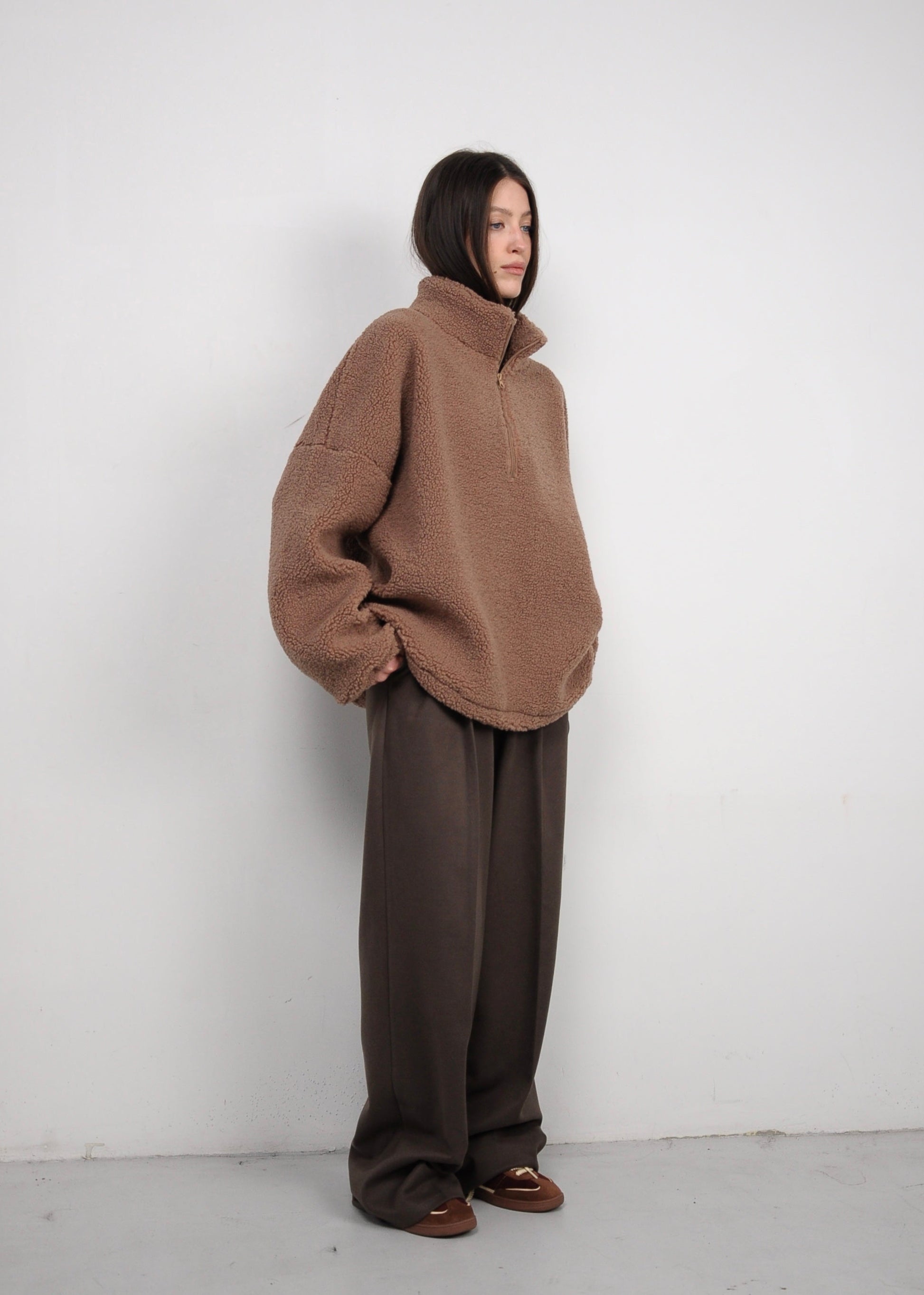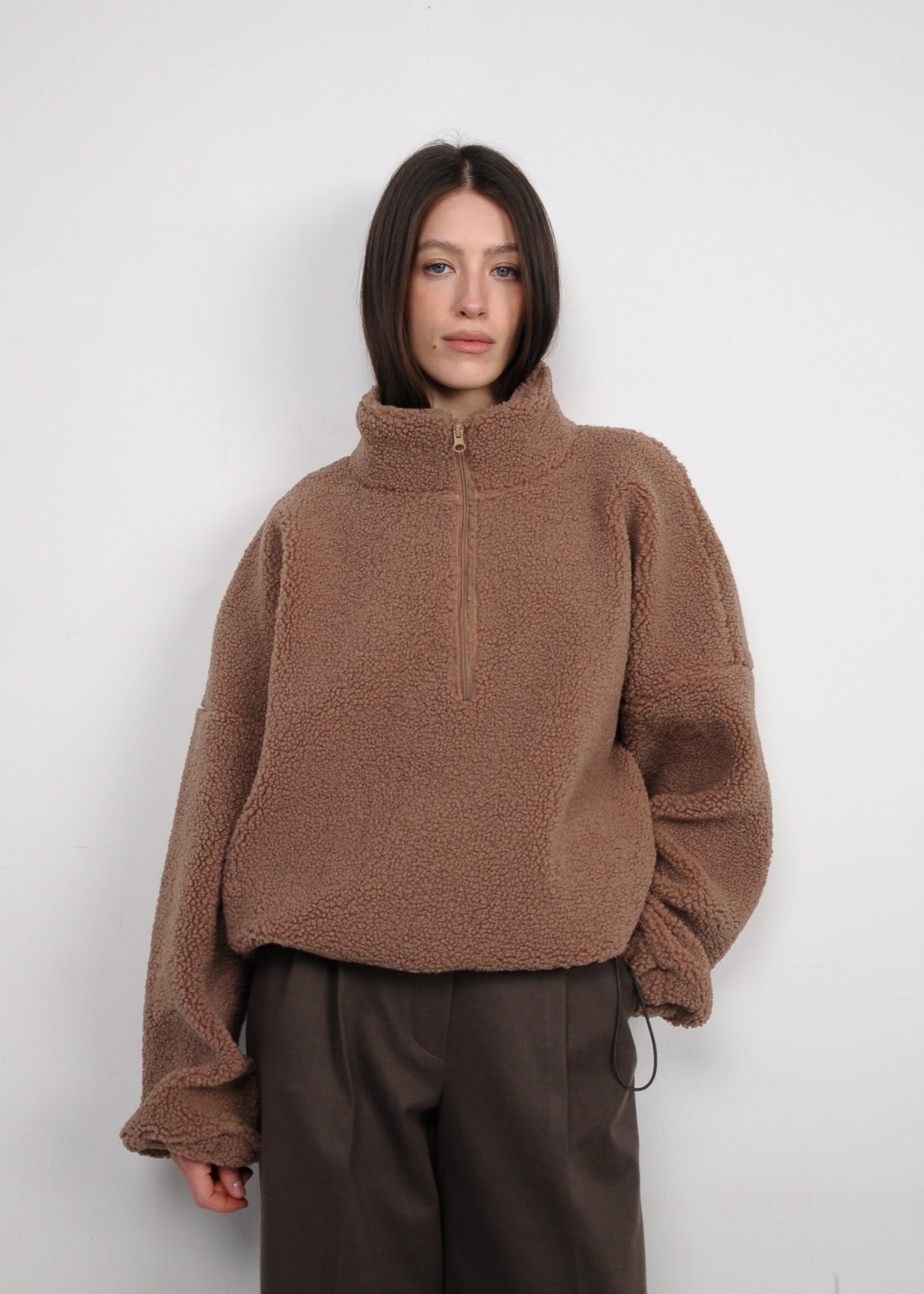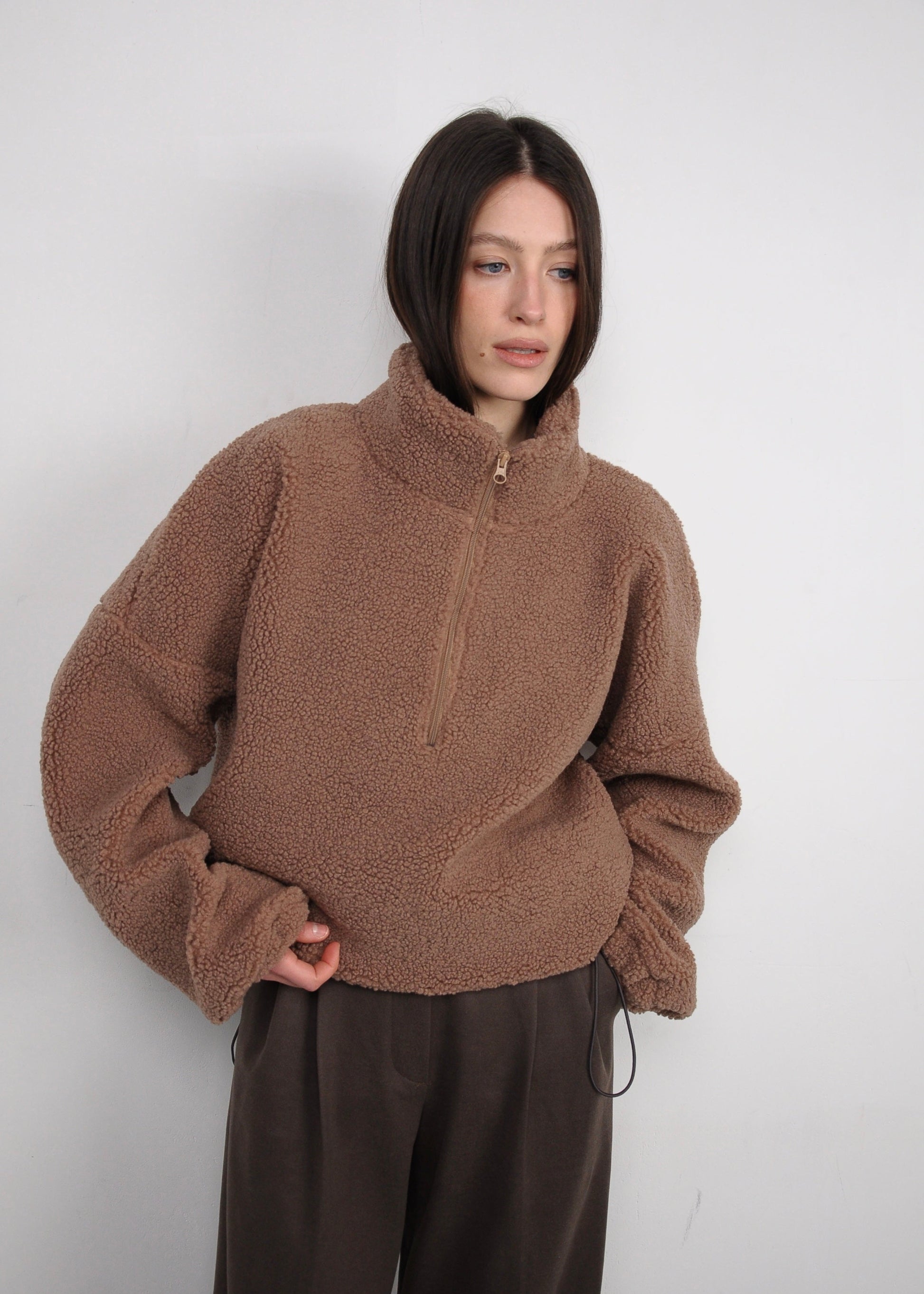 М’яка та об’ємна кофта з фактурної тканини створена для комфорту й сучасного повсякденного стилю. Вільний крій зі спущеною лінією плеча формує розслаблений силует, а високий комір із короткою застібкою-блискавкою додає функціональності та дозволяє регулювати посадку. Приємна на дотик текстура дарує відчуття затишку, не обтяжуючи образ. Кофта легко поєднується з брюками, джинсами або трикотажними комплектами, ідеально підходить для міських образів та подорожей.