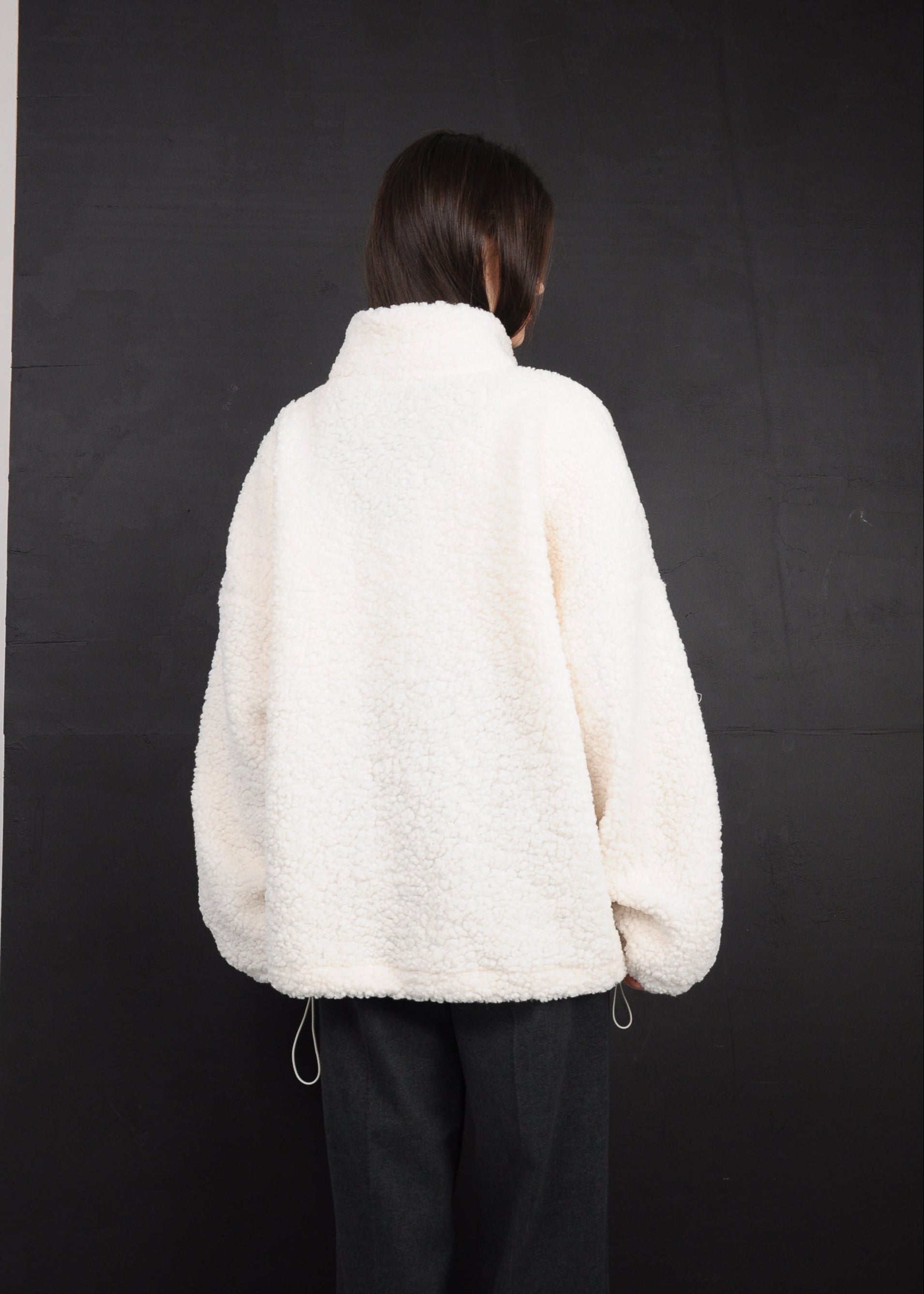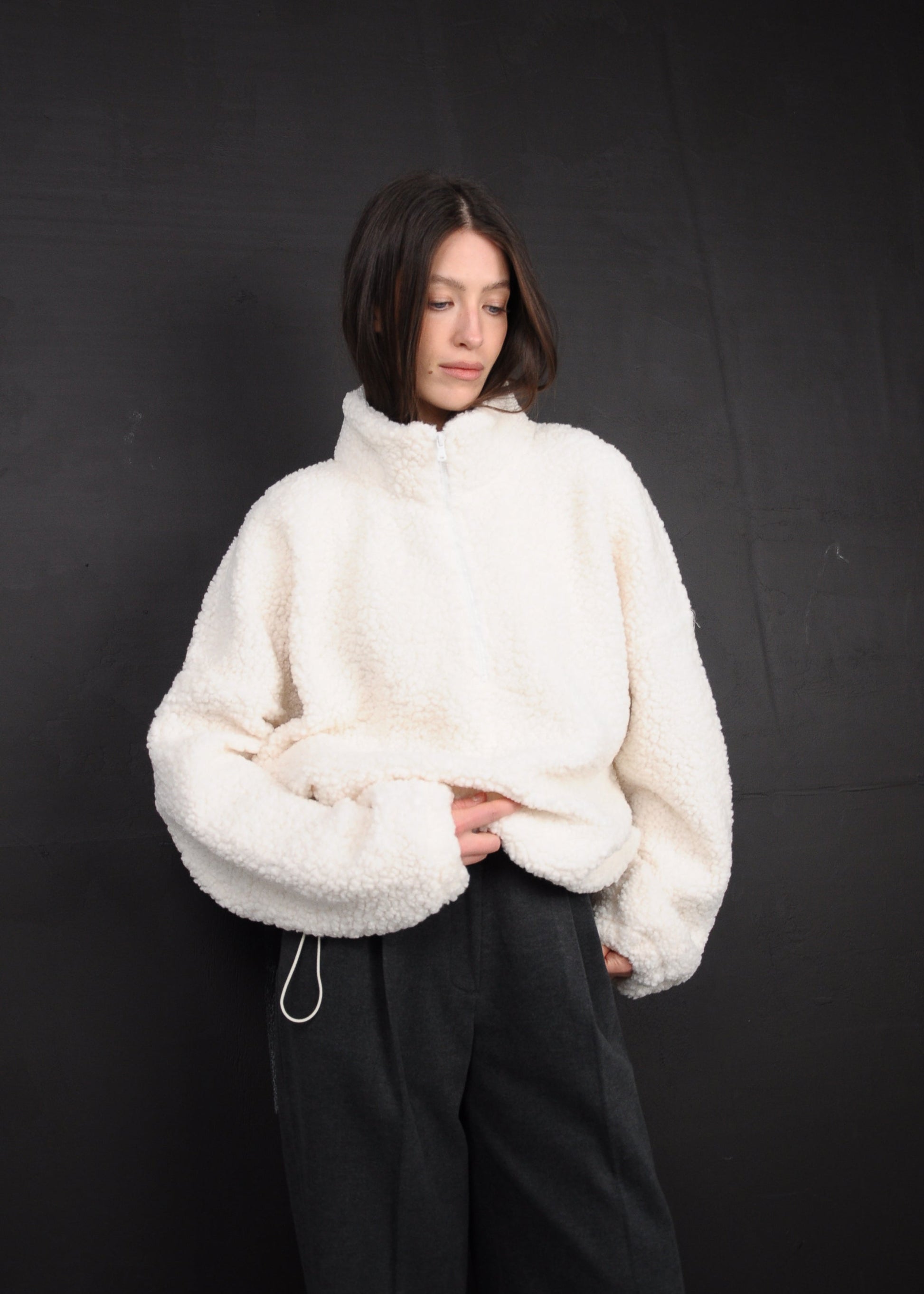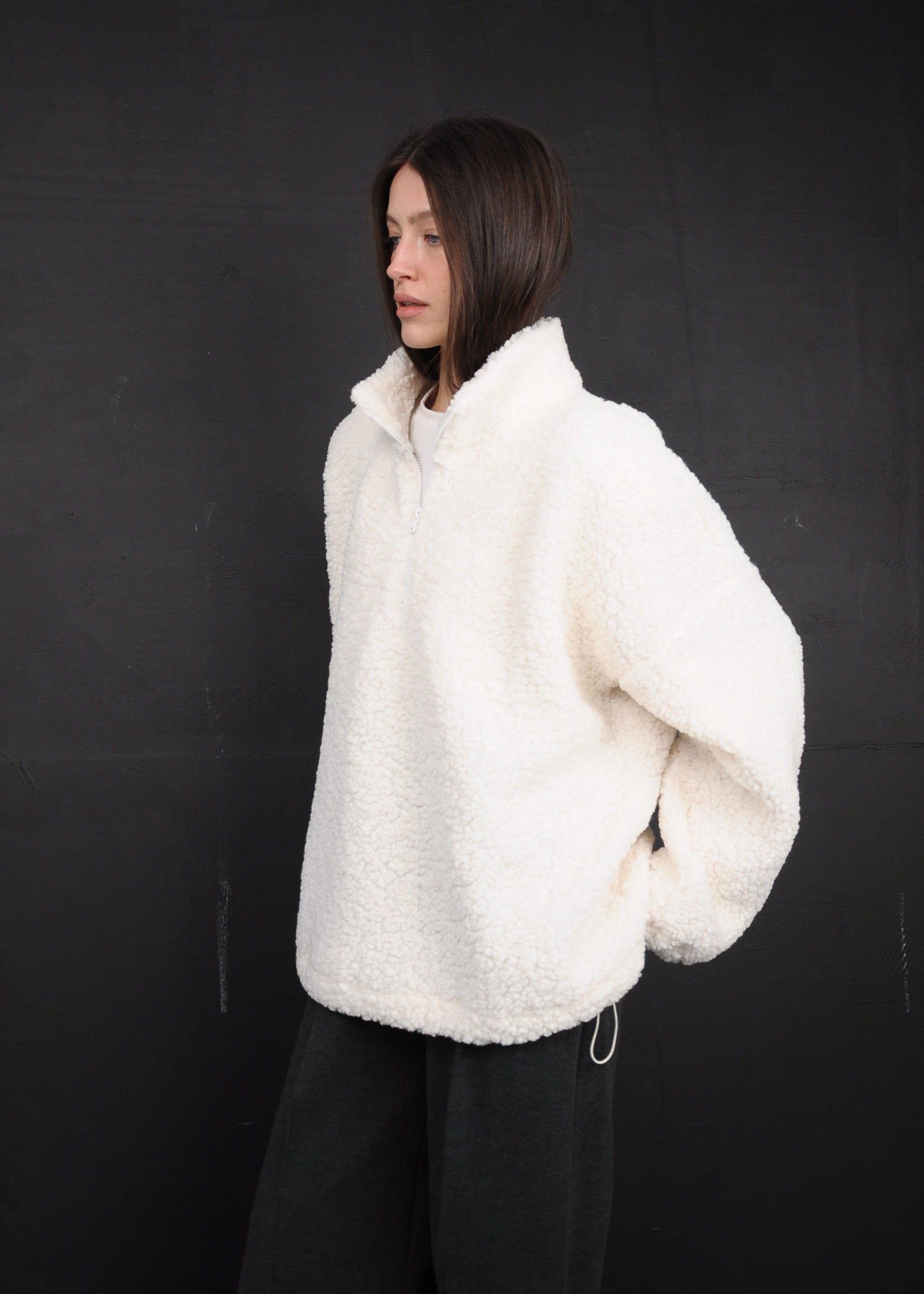 М’яка та об’ємна кофта з фактурної тканини створена для комфорту й сучасного повсякденного стилю. Вільний крій зі спущеною лінією плеча формує розслаблений силует, а високий комір із короткою застібкою-блискавкою додає функціональності та дозволяє регулювати посадку. Приємна на дотик текстура дарує відчуття затишку, не обтяжуючи образ. Кофта легко поєднується з брюками, джинсами або трикотажними комплектами, ідеально підходить для міських образів та подорожей.