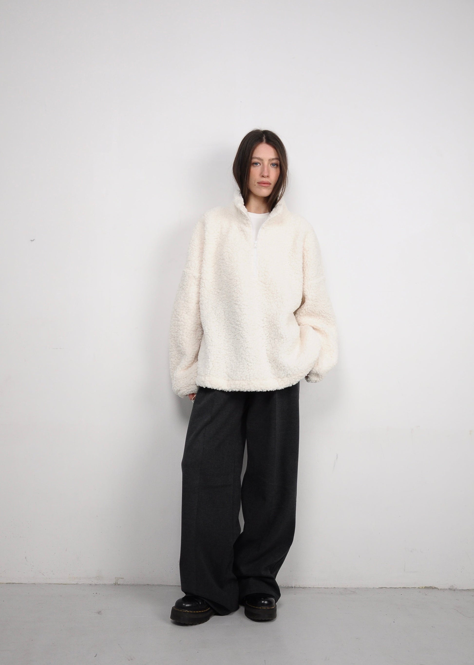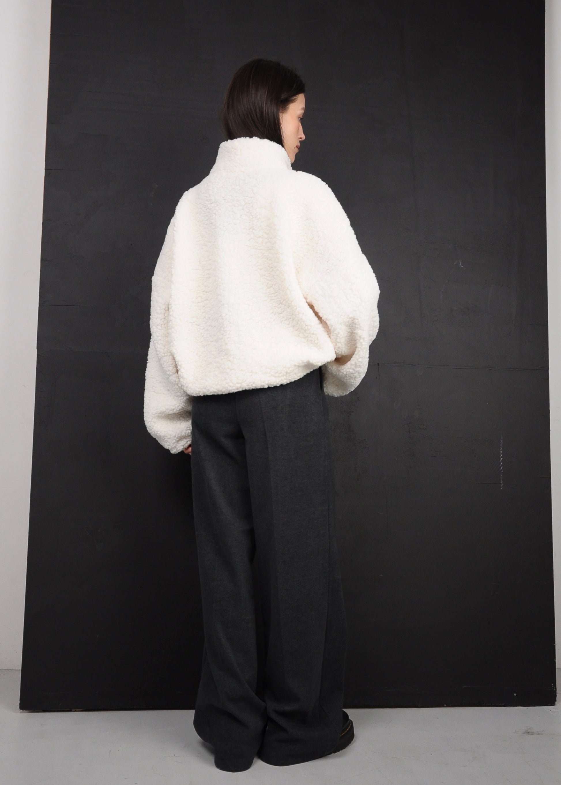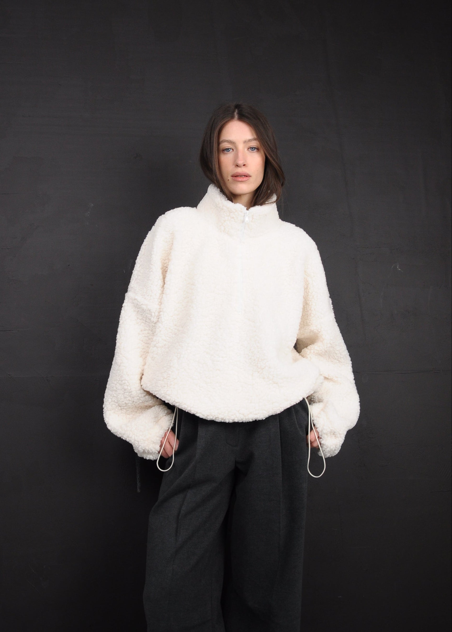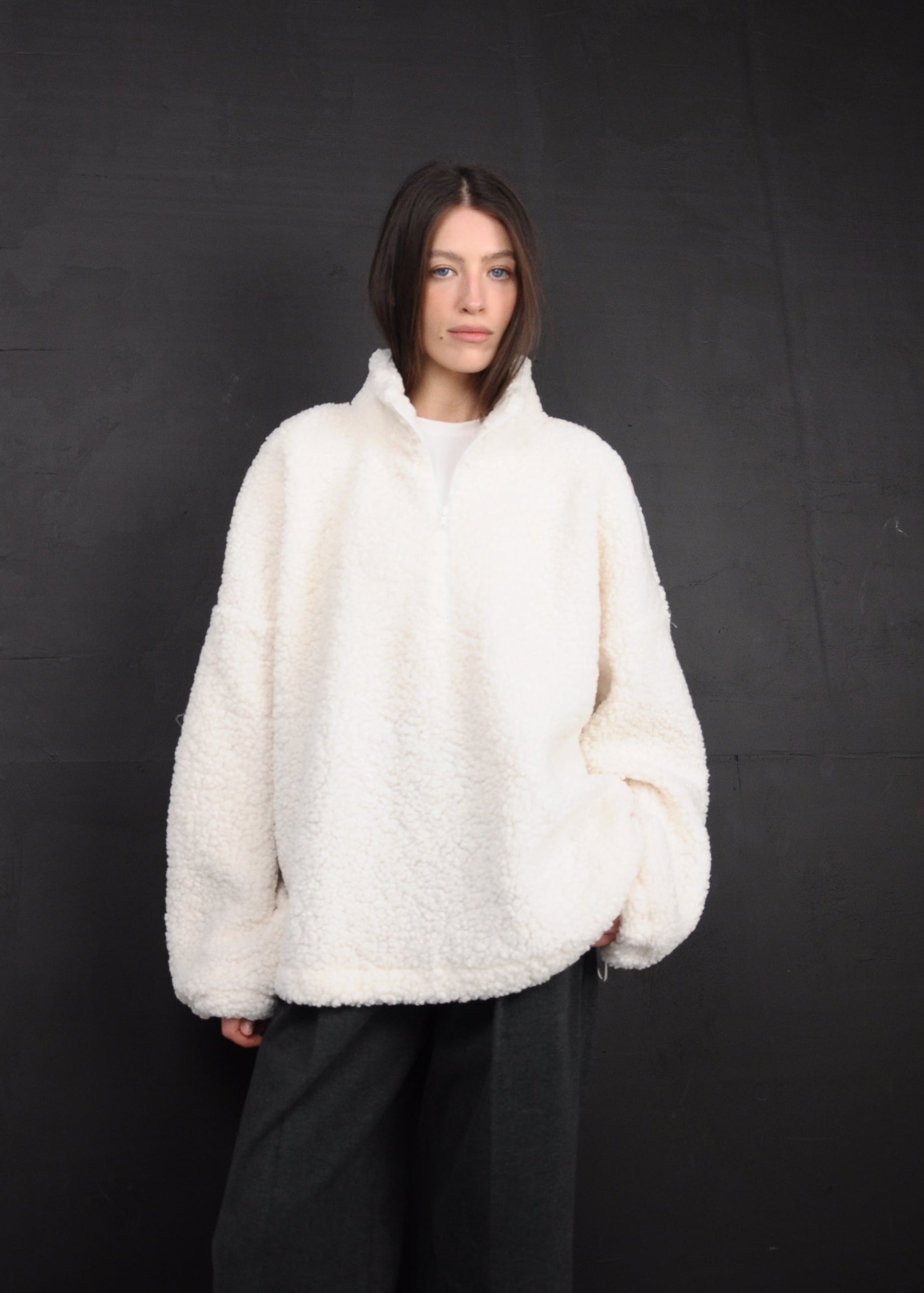 М’яка та об’ємна кофта з фактурної тканини створена для комфорту й сучасного повсякденного стилю. Вільний крій зі спущеною лінією плеча формує розслаблений силует, а високий комір із короткою застібкою-блискавкою додає функціональності та дозволяє регулювати посадку. Приємна на дотик текстура дарує відчуття затишку, не обтяжуючи образ. Кофта легко поєднується з брюками, джинсами або трикотажними комплектами, ідеально підходить для міських образів та подорожей.