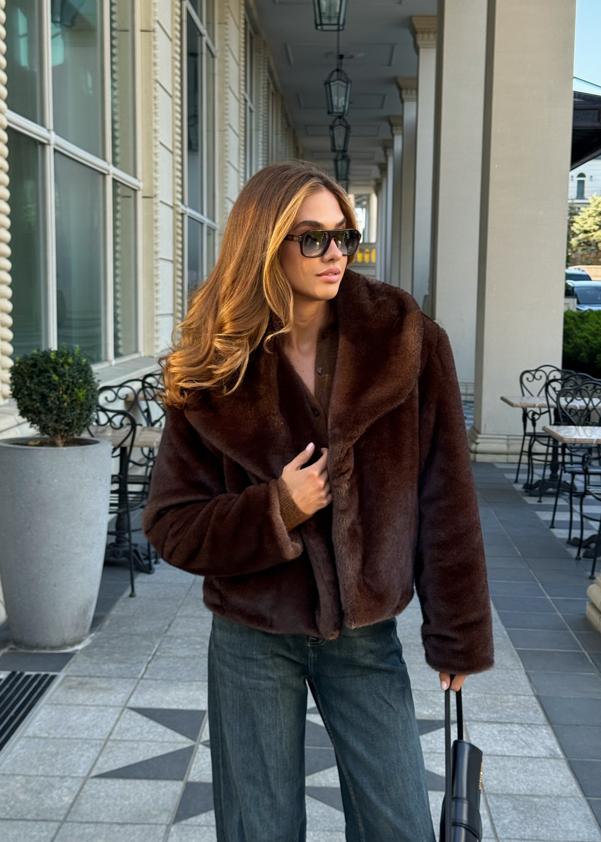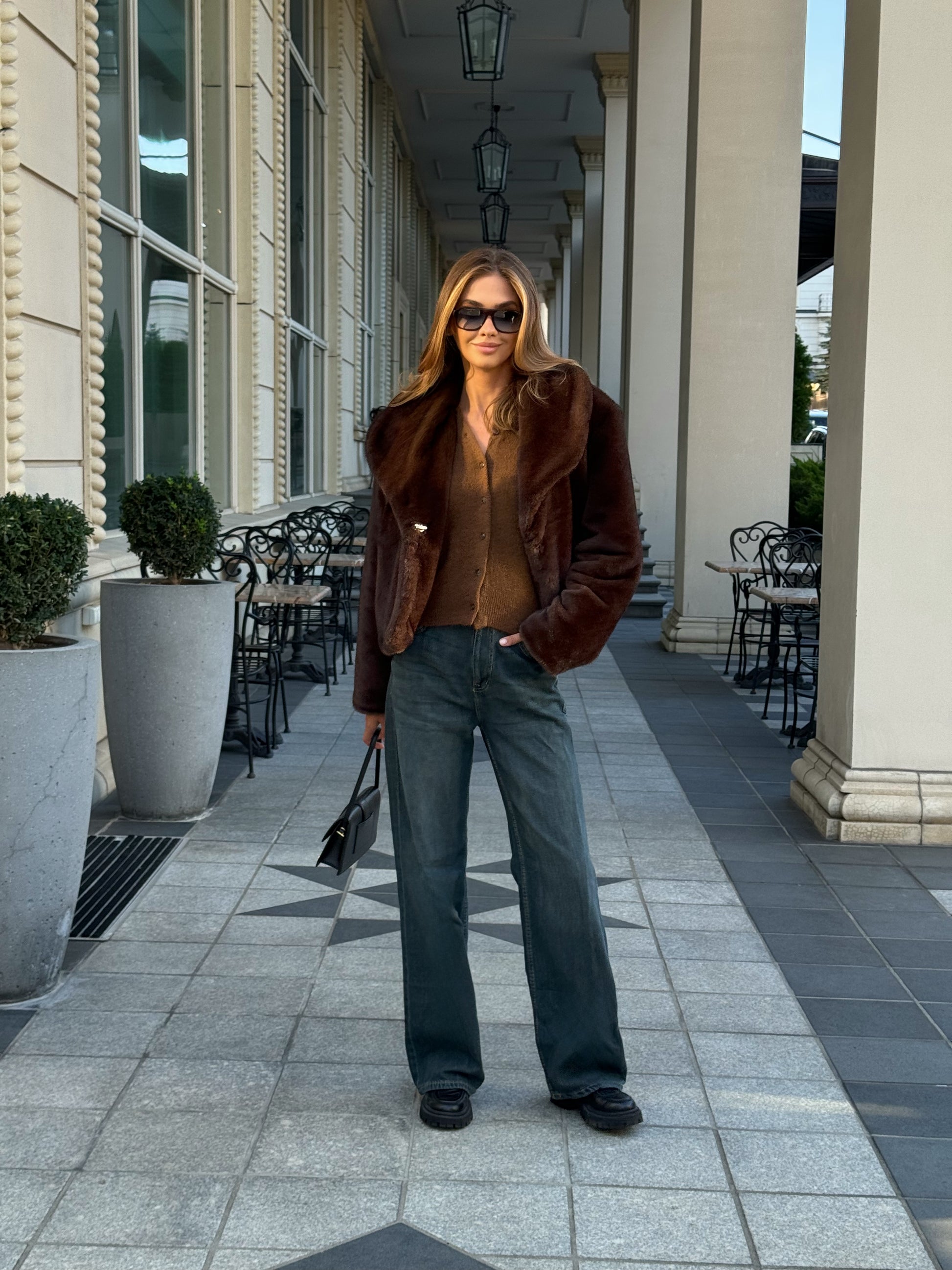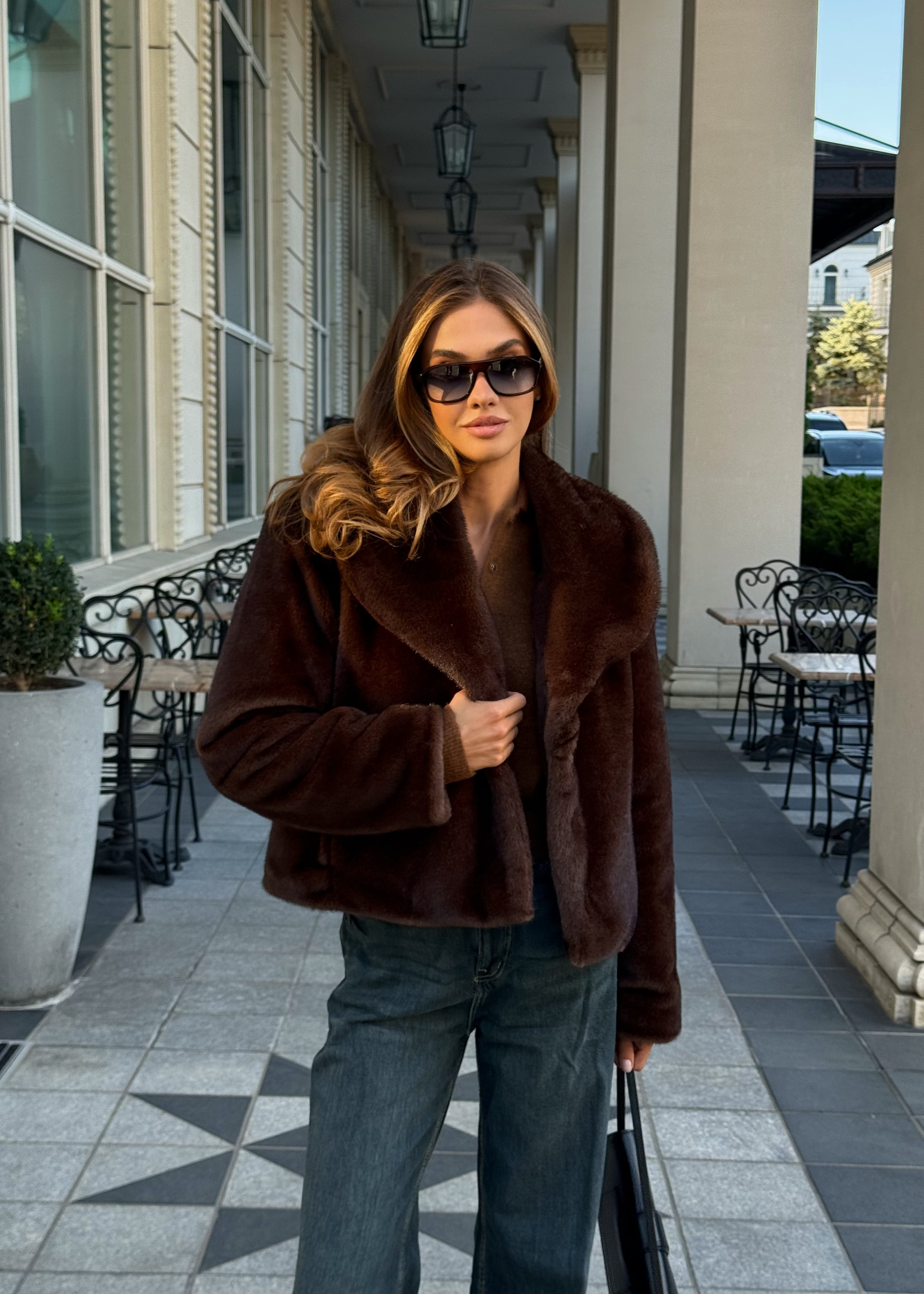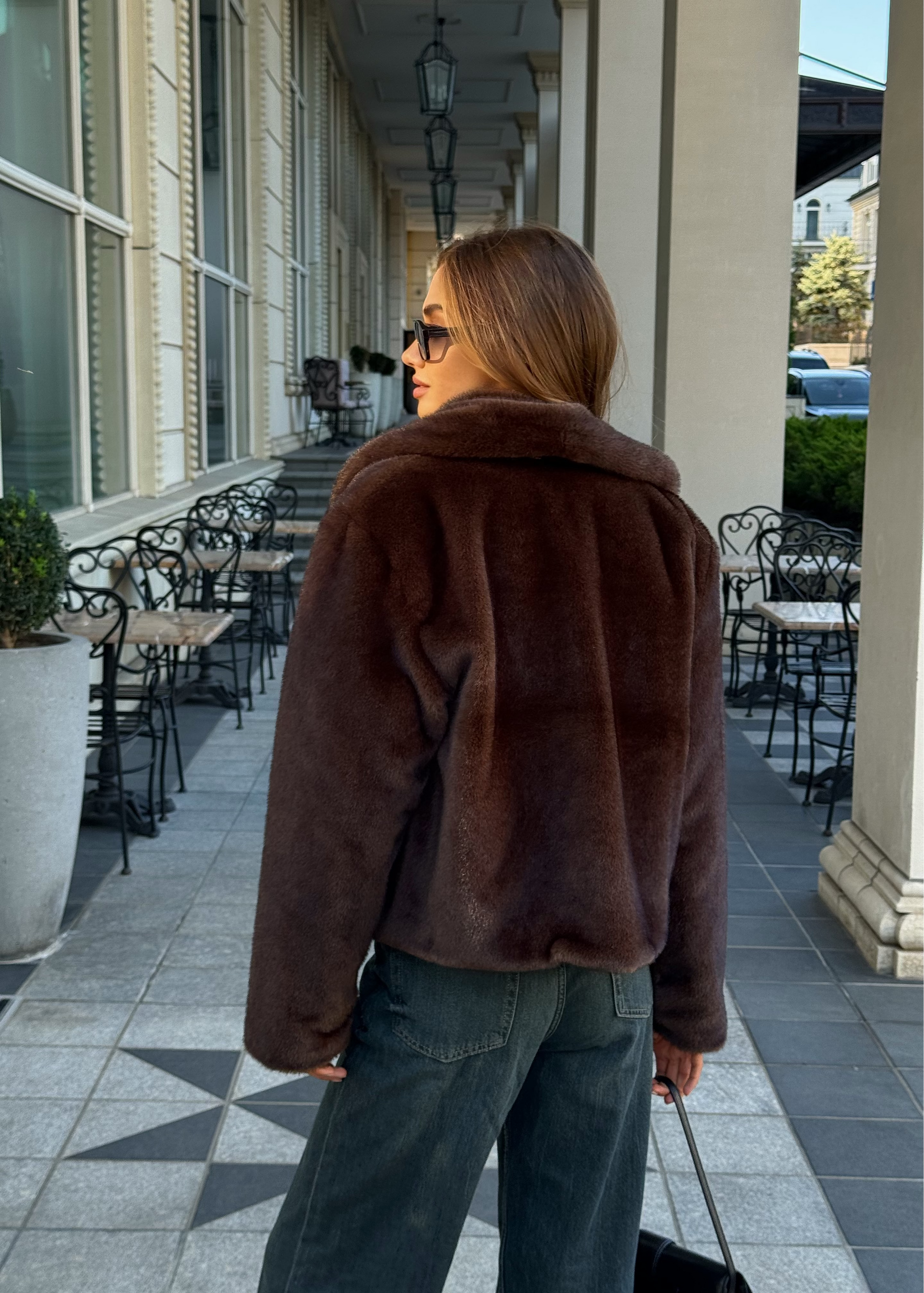 Вкорочена модель із м’якого екохутра, що поєднує елегантність і практичність у щоденному образі.